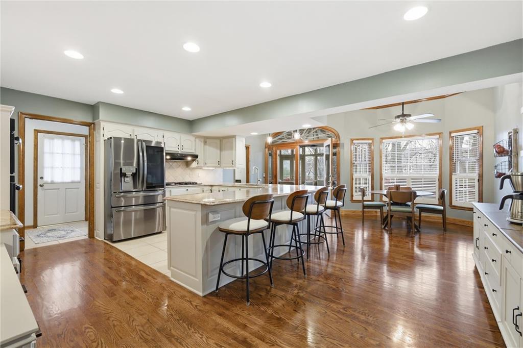 Spacious 1.5-story home nestled on a picture-perfect cul-de-sac on a large corner lot in the heart of Leawood! The main-level primary suite offers private access to a gazebo, deck, and beautifully landscaped backyard—perfect for relaxing or entertaining. This home showcases stunning custom millwork throughout. The expansive great room features soaring cathedral ceilings, a wet bar, and a brick fireplace, creating an inviting space for gatherings. A cozy formal living room—ideal for a home office—and an elegant formal dining room add versatility and charm. The spacious kitchen opens to an incredible four-season room, providing year-round enjoyment and natural light. Convenient main-level laundry adds everyday ease. Upstairs, you’ll find three additional bedrooms, two full bathrooms, and a HUGE loft area complete with a cedar closet—perfect for a playroom, lounge, or flex space. The finished basement offers even more living space with a family room, recreation area, half bath, and two large storage rooms. Additional updates include a new furnace and air conditioner installed in 2025. Located near top-rated schools, shopping, parks, and scenic bike paths, this home offers the perfect blend of comfort, space, and location. Don’t miss this incredible opportunity in one of Leawood’s most desirable neighborhoods!