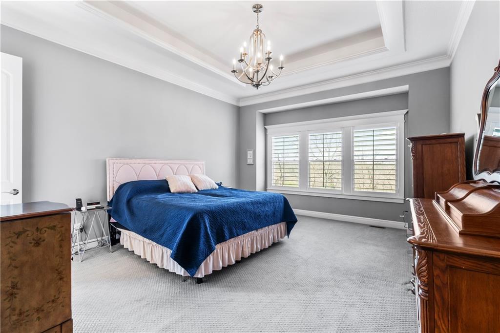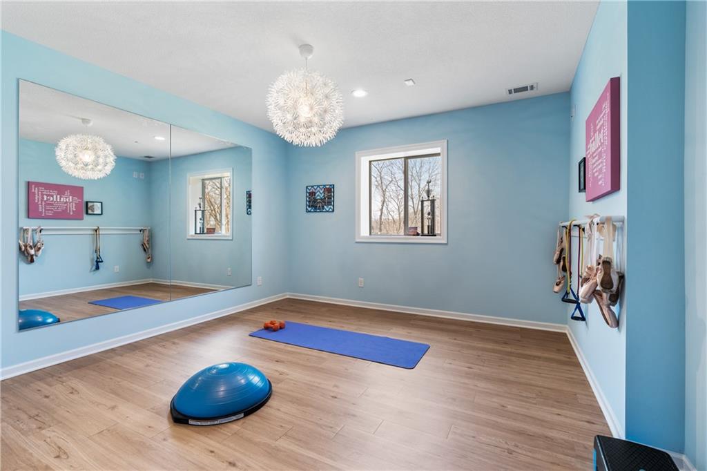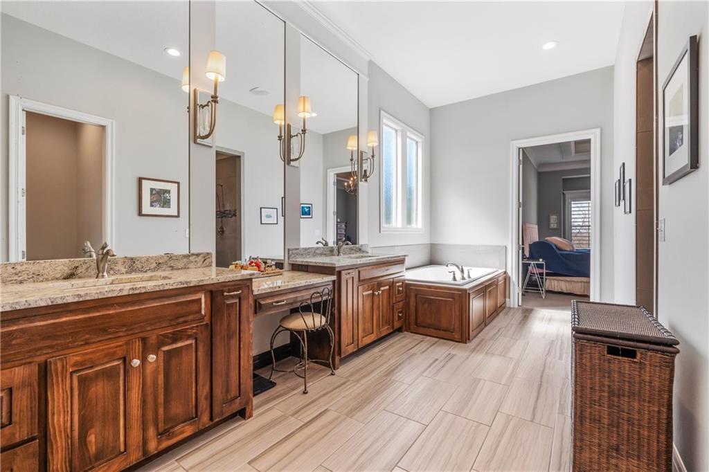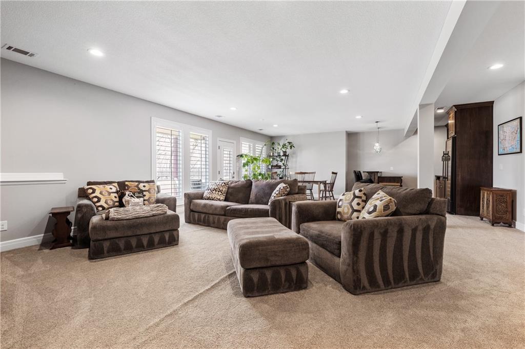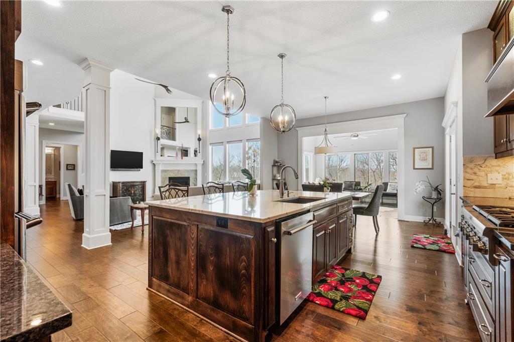 Located in the desirable River Ridge Farms West subdivision, this exceptional home is framed by beautifully landscaped grounds and a welcoming front façade that radiates elegance. Set on an estate lot (over half an acre) with open rear views, the home offers privacy and tranquil sunset vistas. A formal dining room off the entry flows seamlessly into the open two-story great room, filled with natural light and anchored by a striking corner fireplace, creating a warm and inviting atmosphere. The chef’s kitchen features granite countertops, a marble backsplash, Thermador double wall ovens, ample cabinet and counter space, and a walk-in pantry. An adjacent dining area opens to a grill deck, perfect for effortless outdoor entertaining, and leads directly into a sunroom with a floor-to-ceiling stone fireplace and built-in shelving—a cozy retreat for morning coffee or relaxing any time of day. The primary suite is a serene haven with tray ceilings and abundant natural light. Its ensuite bath includes double vanities, a soaking tub, and a separate walk-in shower with dual shower heads. Spacious secondary bedrooms each feature their own private bathrooms, and two laundry rooms make daily living convenient. The expansive finished walkout lower level offers versatile living space with a rec room, wet bar, an additional bedroom, and full bathroom. Step outside to a patio overlooking the large backyard, ideal for relaxing or entertaining. A circular driveway provides easy access, and the 4-car garage with extended storage accommodates vehicles, bikes, and more. Located in the highly sought-after Blue Valley School District, this home offers easy highway access and is conveniently close to shopping, dining, and less than 5 minutes to Aubrey Vineyards. Your lifestyle of tranquility and comfort awaits.