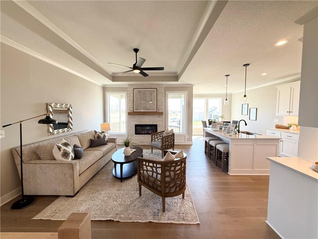 NEW MODEL HOME - NOT FOR SALE. Welcome to the Lakewood by Lambie Homes, a beautifully designed reverse 1.5-story floor plan located in the maintenance-provided Mize Hill community in Lenexa. This model showcases mid-level interior finishes and thoughtful design throughout, offering 4 bedrooms, 3 bathrooms, and a functional layout ideal for everyday living and entertaining.The main level features an open-concept design with a spacious great room, highlighted by a floor-to-ceiling fireplace and abundant natural light. The kitchen includes a wood hood vent, quartz countertops, walk-in pantry, and a large center island, seamlessly connecting to the dining area and covered deck, perfect for indoor-outdoor living.This home is currently serving as the Mize Hill model home and is not available for purchase. It is available to tour to experience the Lakewood floor plan, available finishes, and overall lifestyle offered within the community. Located near Cedar Station Park, Mize Lake, and with convenient access to K-10 and Prairie Star Parkway, Mize Hill offers low-maintenance living with planned amenities including walking trails and a future community pool. Professional photos coming 04/01/2026