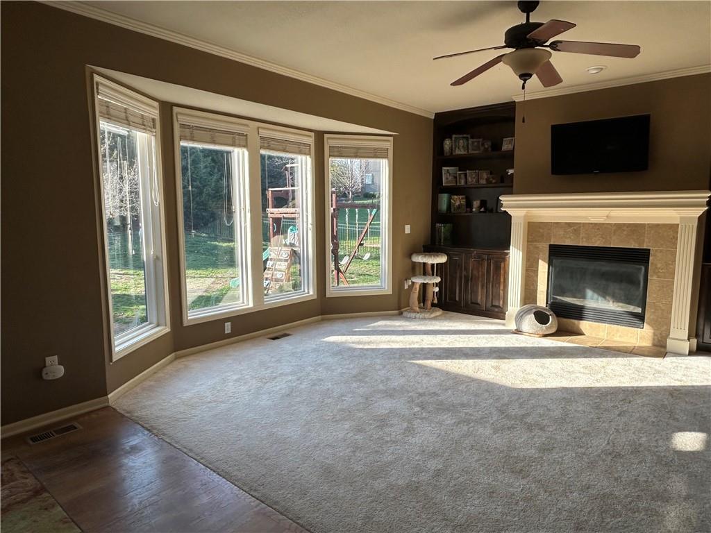 This former Forest View the Meadows model home sits on nearly half an acre and is the largest corner lot on a horseshoe-type cul-de-sac. The neighborhood pool (featuring a splash pad), playground, and pickleball/basketball/volleyball court is just a short 3-minute walk! The home features numerous model upgrades, including: a 4-car garage, built-in walnut bookshelves, a wine bar off the kitchen, a bonus sitting room, and natural stone accents on the front exterior. A beautiful new roof and gutters were added (2021), along with a new water heater (2025). The open concept kitchen has walnut cabinets, a large granite island, a spacious walk-in pantry, a brand new microwave, and a newer KitchenAid dishwasher. The family room boasts walnut built-ins and a tiled, classical gas fireplace. There are solid oak floors on the main level. The master bedroom features an additional sitting room, and the master bath has a relaxing jetted tub and a walk-in tiled shower with 2 shower heads. The patio has a tall gazebo shelter perfect for relaxing and grilling. Timeless details make this home unique. The price reflects the need for some updates. Make this solid home yours today!