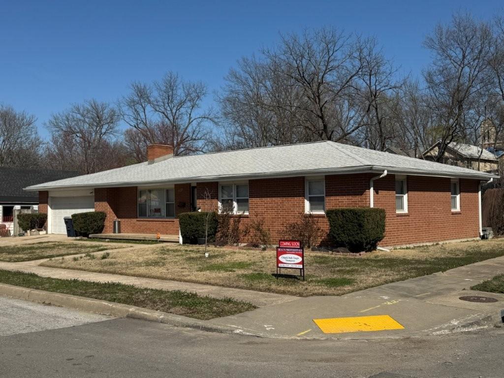 Ranch-style house featuring an attached garage, a porch, a chimney, brick siding, and driveway