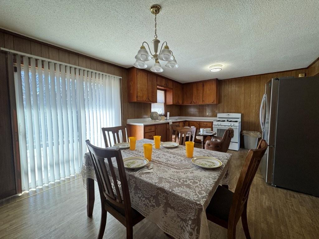 Dining space with hanging lights, a textured ceiling, wood walls, and dark wood-type flooring