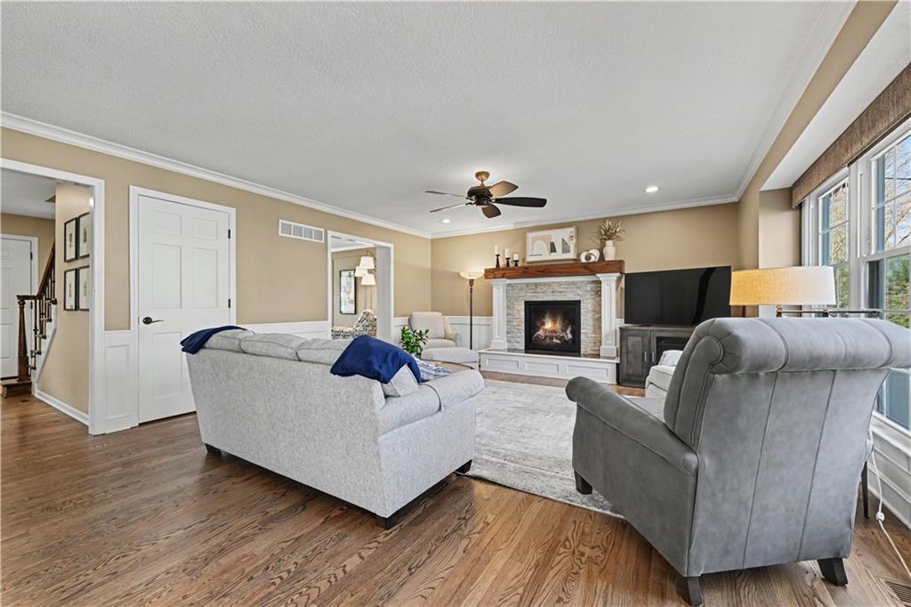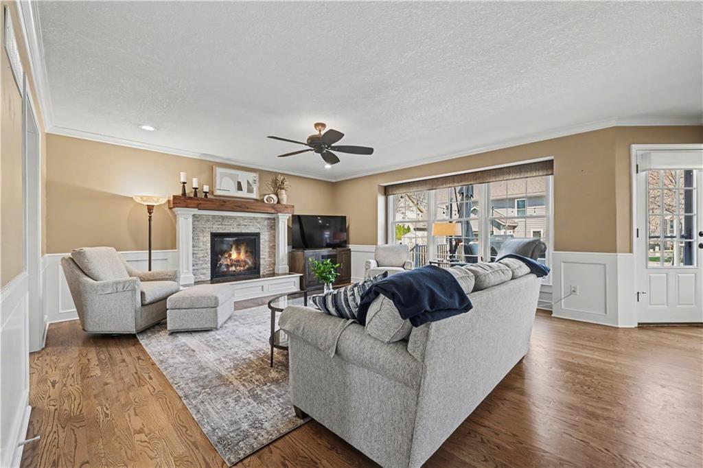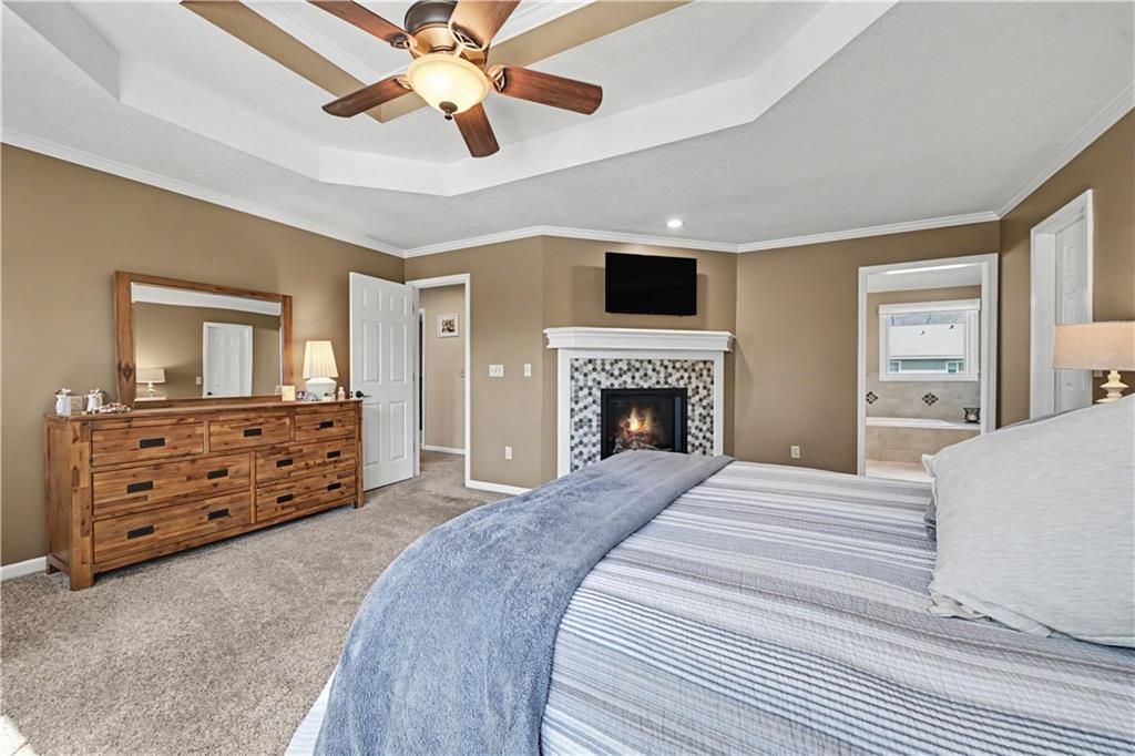 Welcome to this beautifully updated, modern home nestled on a quiet cul-de-sac in the highly sought-after Stoneridge Manor. Meticulously maintained by the original owners, this stunning 4-bedroom residence seamlessly blends modern style with everyday functionality. From the moment you walk in, you will be amazed. The main level showcases gleaming hardwood floors & an abundance of natural light from walls of windows. The kitchen flows effortlessly into the inviting great room with a cozy gas fireplace and built-in features. A formal dining room with elegant lighting sets the stage for memorable gatherings, while a second living area offers flexibility as a home office or additional lounge space, highlighted by a striking wood accent wall. A stunning, fully remodeled dream kitchen, featuring custom cabinetry, quartz countertops, under-cabinet lighting, soft-close drawers & doors, roll-out shelves, & an abundance of drawers for storage. A dedicated baking station w/a built-in mixer lift and stylish lighting complete this thoughtfully designed space—perfect for both daily living and entertaining. All bathrooms have been beautifully updated, including the spa-like primary suite designed for relaxation. Heated floors, a whirlpool tub, a spacious walk-in shower, double vanities, & a dedicated makeup area. The primary bedroom also features its own gas fireplace, a large walk-in closet, and an additional seasonal closet. The finished lower level adds even more living space with a family room, bar area, half bath, and a versatile game room or non-conforming fifth bedroom. Major upgrades include new HVAC system w/transferable warranty, all-new windows, new lighting throughout, knockdown ceilings, driveway replaced, newer Trex deck, exterior painted along with the irrigation system make for an exceptional curb appeal make this home truly move-in ready and feeling brand new. This is a rare opportunity to own a fully updated home in a prime location.Schedule a showing today.