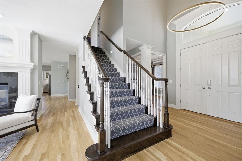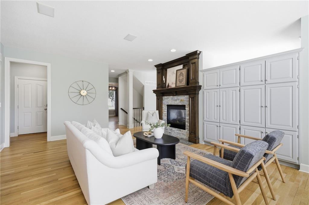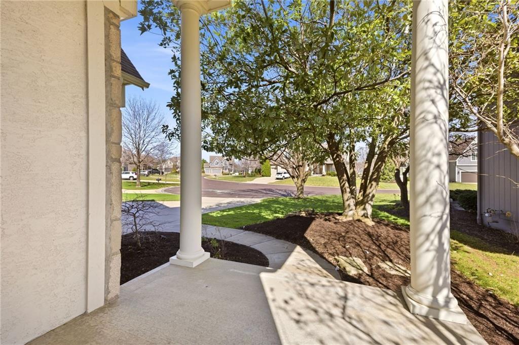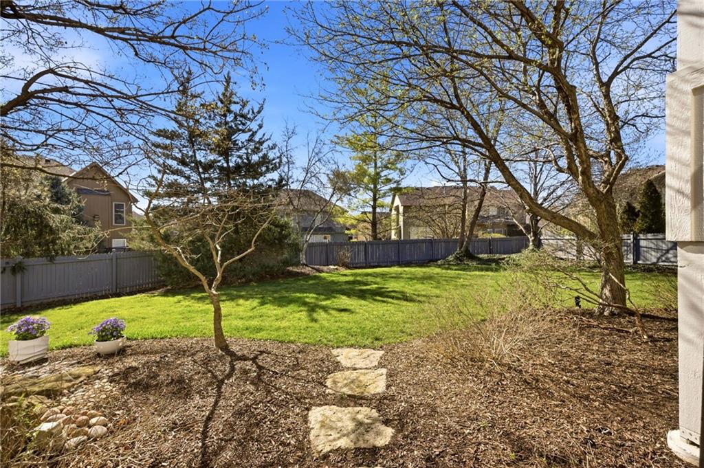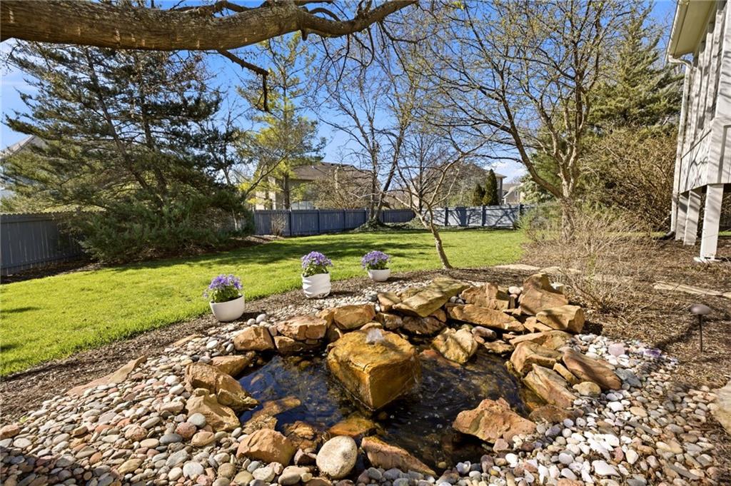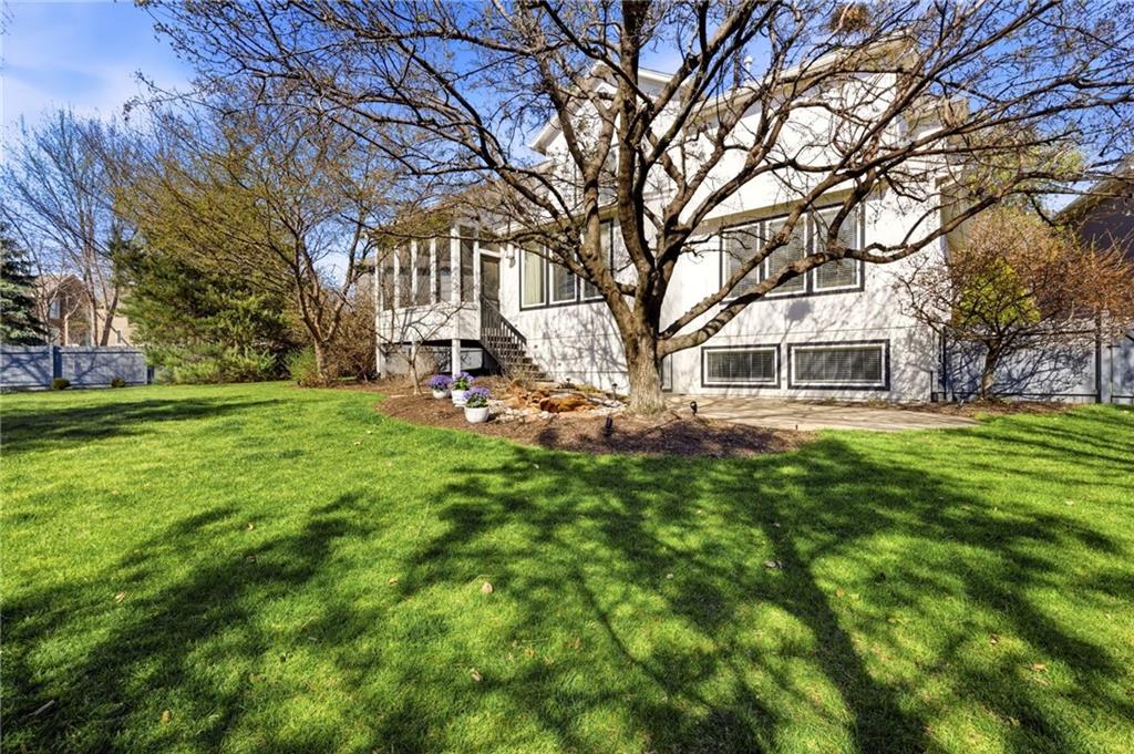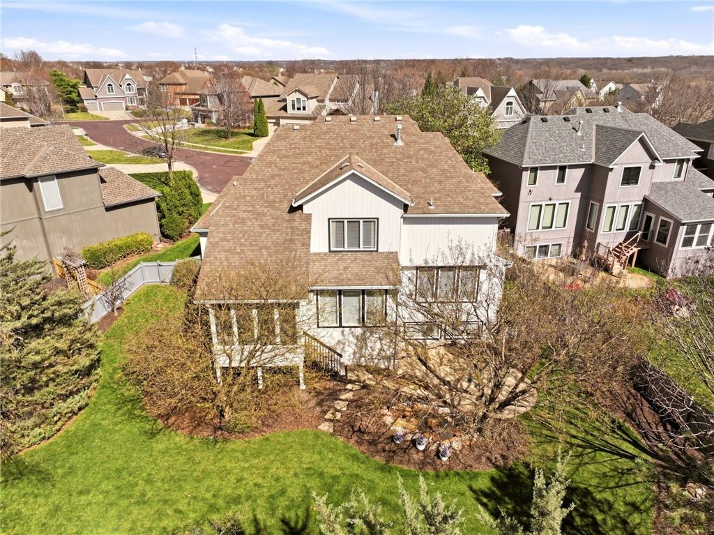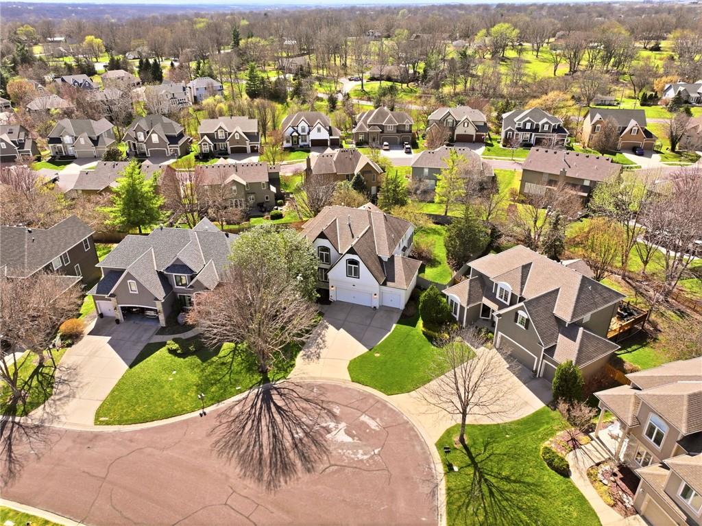 Located in the highly sought after Blue Valley School District, this 4 bed 3.2 bath single owner two story home has been meticulously maintained and thoughtfully cared for over the past 20 years. Perfectly positioned at the rear of a quiet cul-de-sac, the setting offers both privacy and a peaceful neighborhood feel. Step inside the foyer to soaring ceilings that create an open entry. The main level features Totta hardwood floors, updated light fixtures, and new Hunter Douglas custom blinds throughout. The remodeled kitchen offers ample cabinetry, generous counter space featuring marble counter tops, under cabinet LED lighting, and newer stainless steel appliances. The kitchen seamlessly opens to the hearth room featuring a two sided stone hearth. Upstairs, bedrooms feature soaring ceilings and spacious layouts. The primary suite includes an exceptionally large walk in closet and a remodeled bath with heated tile floors. A dedicated playroom off one bedroom adds extra space for children, hobbies, or a study. The finished basement provides additional living, recreation space, and ample storage space. Major updates include zoned HVAC with two new furnaces and A/C units, dual 40 gallon water heaters, radon mitigation, new sump pump, roof and gutters, fresh exterior paint in 2021, and more, providing long term peace of mind. Outside, the backyard is truly exceptional. A show stopping space designed for both beauty and functionality. The screened in porch overlooks professionally landscaped grounds featuring a five foot privacy fence, stunning water feature, low voltage LED lighting, and a sprinkler system. Every corner of the yard has been thoughtfully planned, making it a serene retreat for outdoor living, entertaining, and family enjoyment. This is an unbeatable location within the community featuring walking trails that lead directly to the elementary and middle school, with the highly rated Blue Valley schools conveniently located within the subdivision.