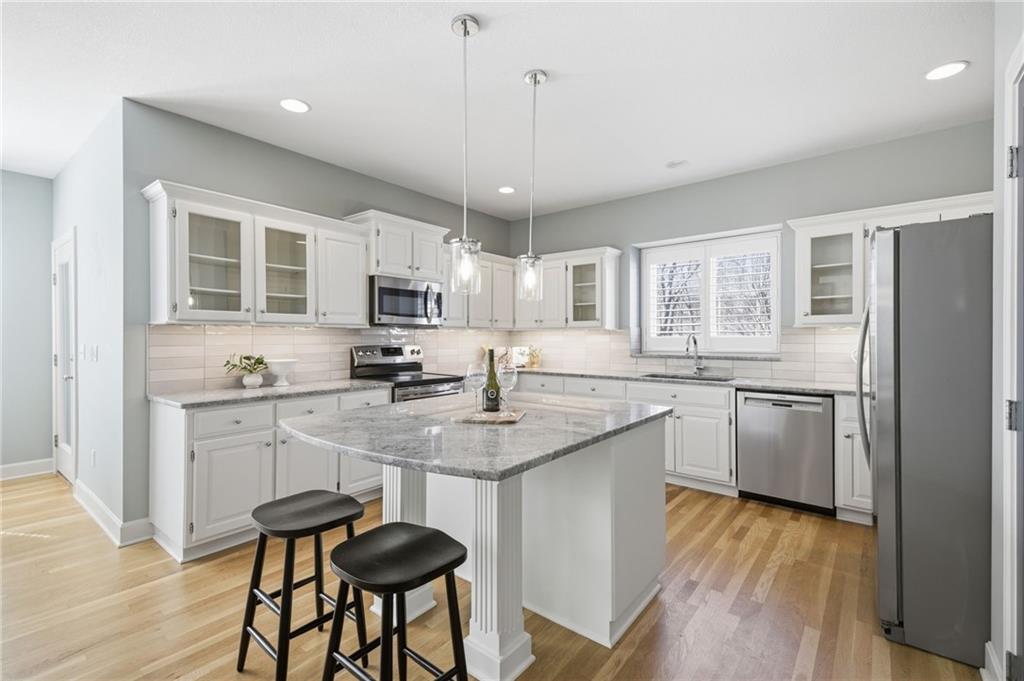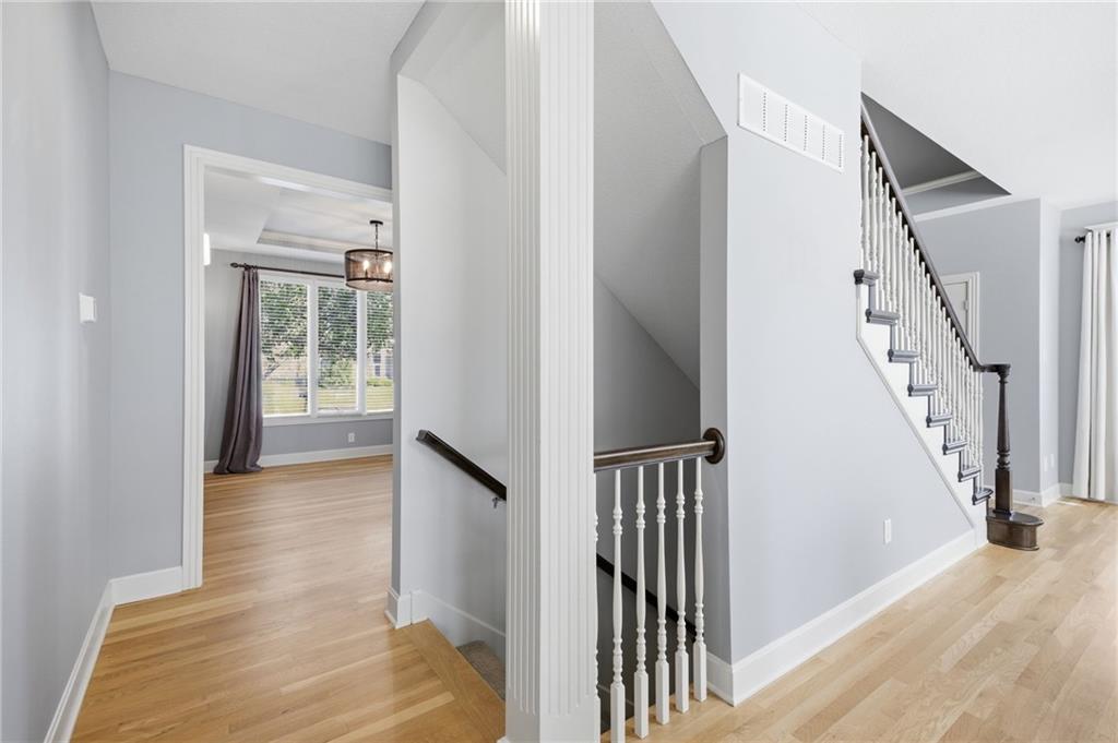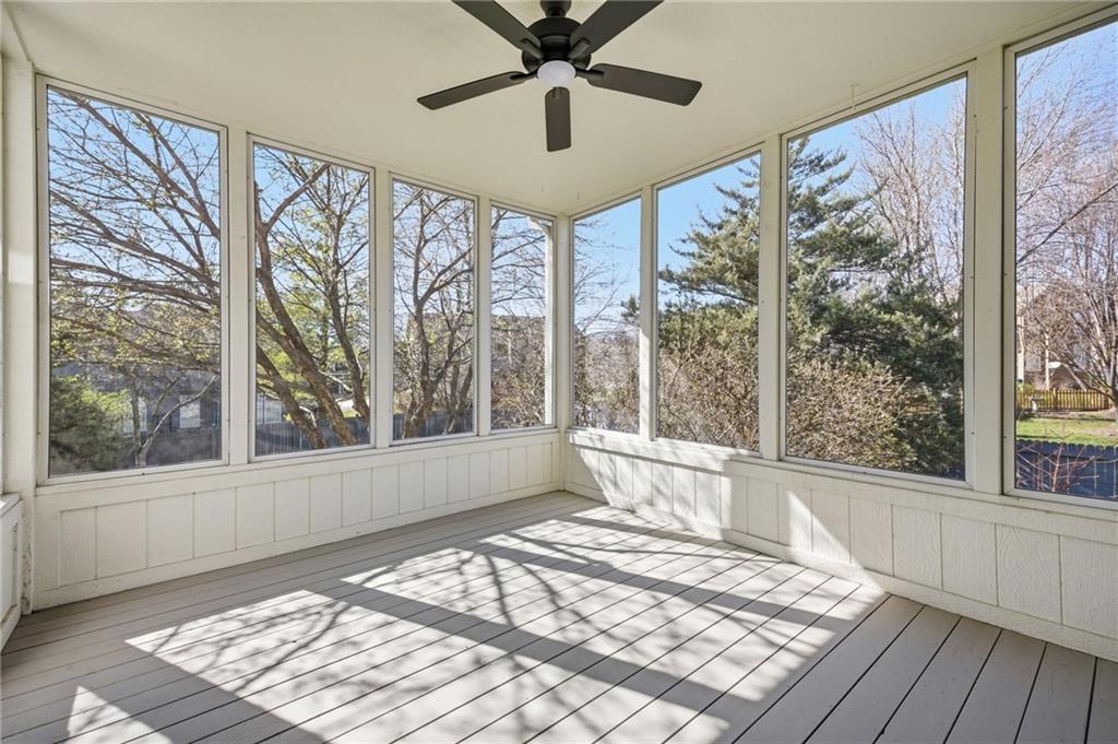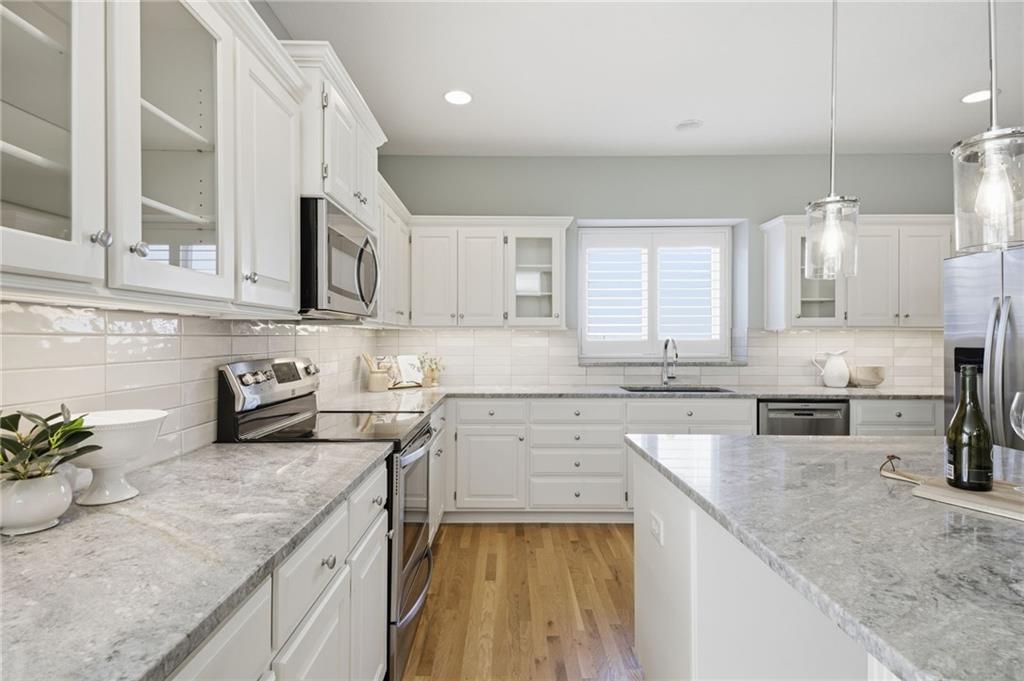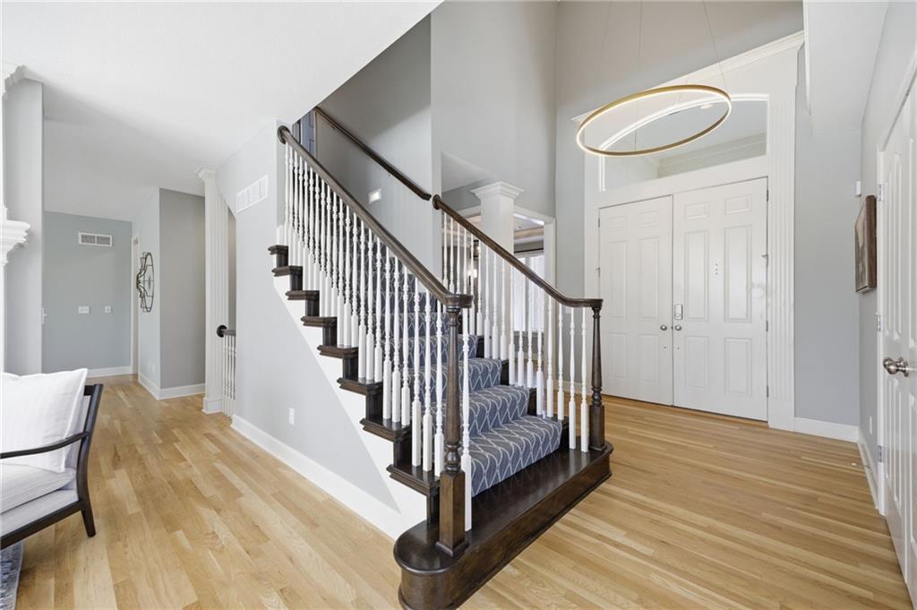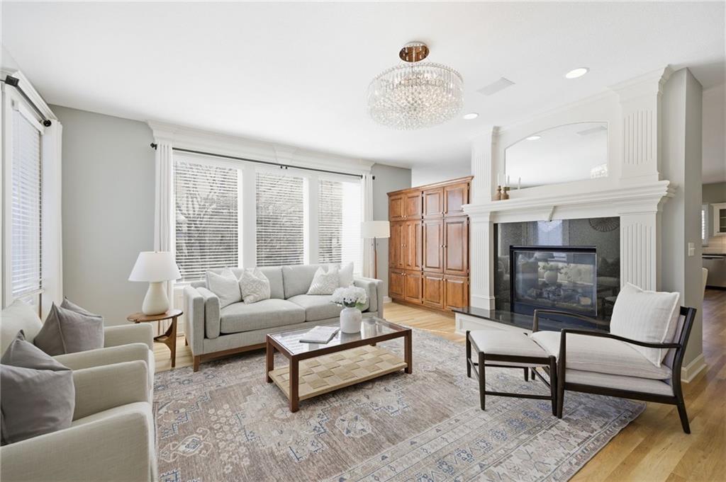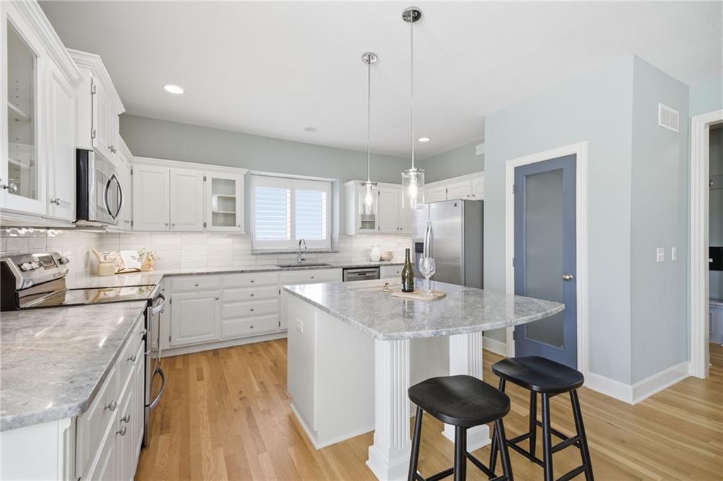 Located in the highly sought after Blue Valley School District, this 4 bed 3.2 bath single owner two story home has been meticulously maintained and thoughtfully cared for over the past 20 years. Perfectly positioned at the rear of a quiet cul-de-sac, the setting offers both privacy and a peaceful neighborhood feel. Step inside the foyer to soaring ceilings that create an open entry. The main level features Totta hardwood floors, updated light fixtures, and new Hunter Douglas custom blinds throughout. The remodeled kitchen offers ample cabinetry, generous counter space featuring marble counter tops, under cabinet LED lighting, and newer stainless steel appliances. The kitchen seamlessly opens to the hearth room featuring a two sided stone hearth. Upstairs, bedrooms feature soaring ceilings and spacious layouts. The primary suite includes an exceptionally large walk in closet and a remodeled bath with heated tile floors. A dedicated playroom off one bedroom adds extra space for children, hobbies, or a study. The finished basement provides additional living, recreation space, and ample storage space. Major updates include zoned HVAC with two new furnaces and A/C units, dual 40 gallon water heaters, radon mitigation, new sump pump, roof and gutters, fresh exterior paint in 2021, and more, providing long term peace of mind. Outside, the backyard is truly exceptional. A show stopping space designed for both beauty and functionality. The screened in porch overlooks professionally landscaped grounds featuring a five foot privacy fence, stunning water feature, low voltage LED lighting, and a sprinkler system. Every corner of the yard has been thoughtfully planned, making it a serene retreat for outdoor living, entertaining, and family enjoyment. This is an unbeatable location within the community featuring walking trails that lead directly to the elementary and middle school, with the highly rated Blue Valley schools conveniently located within the subdivision.