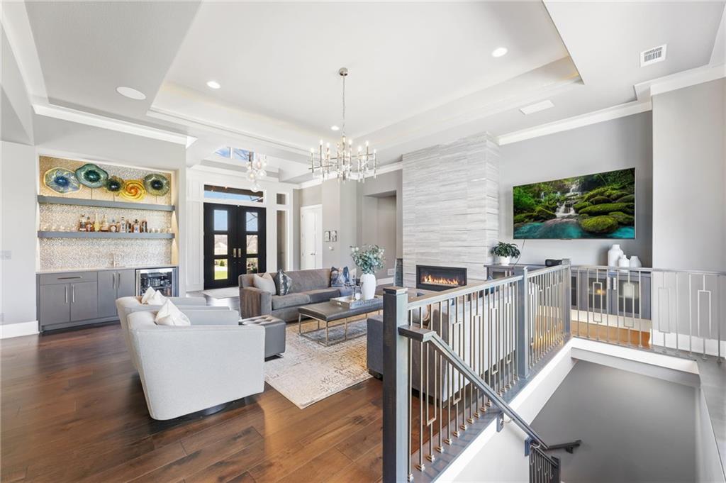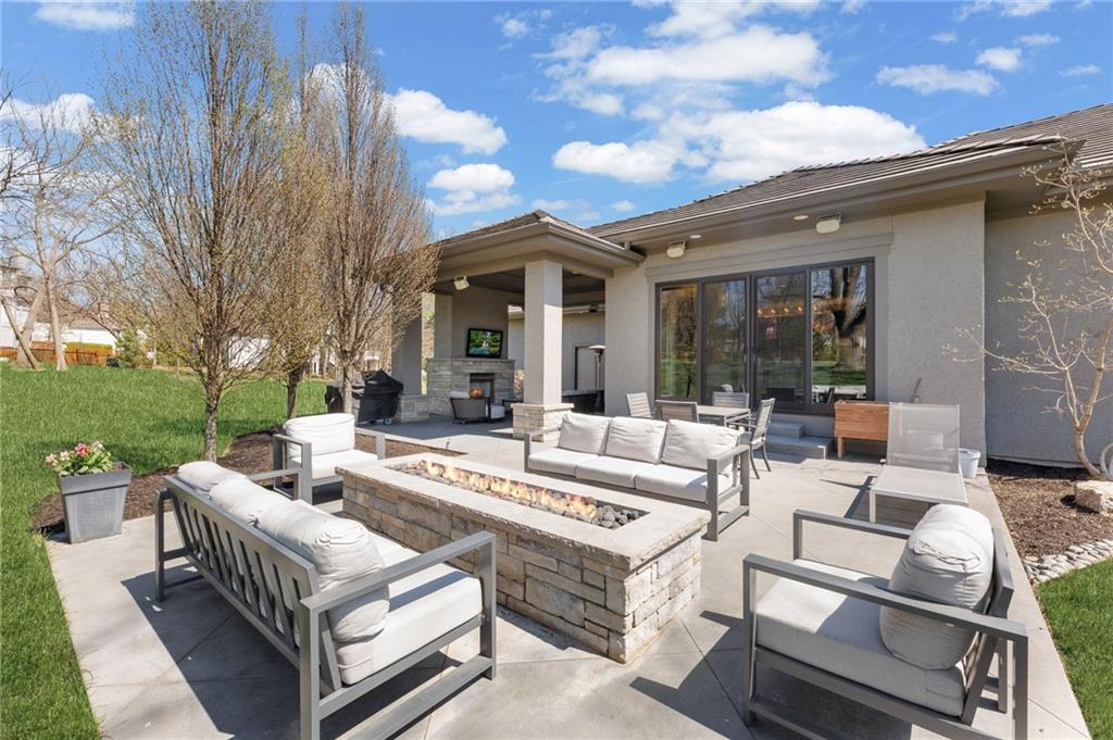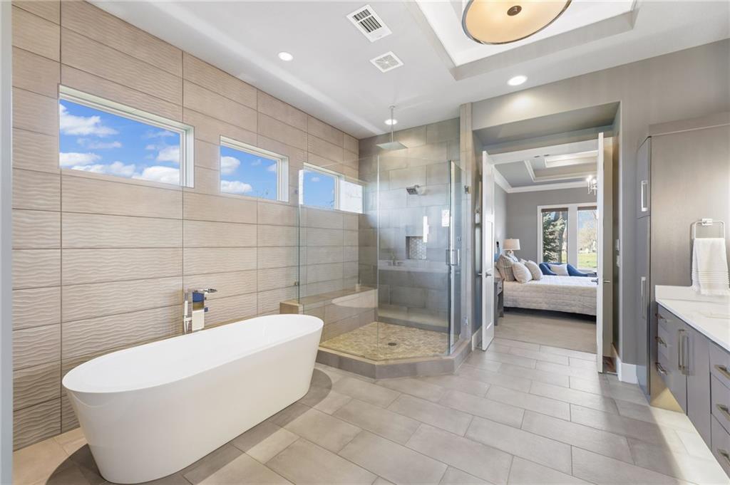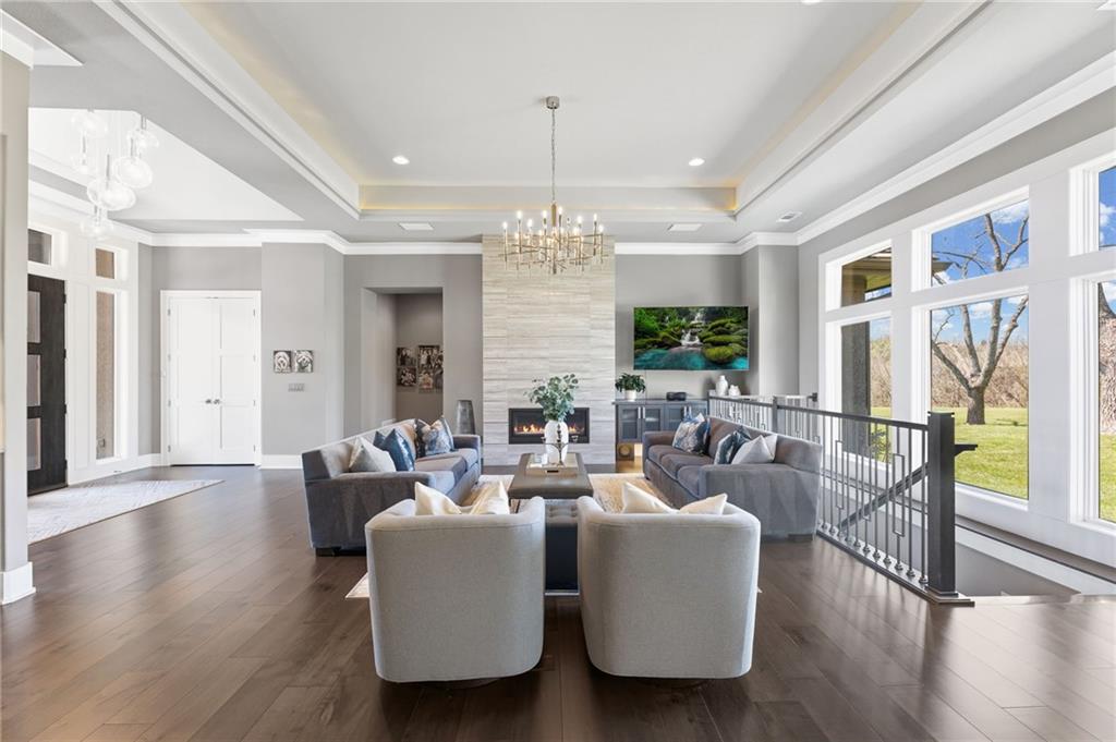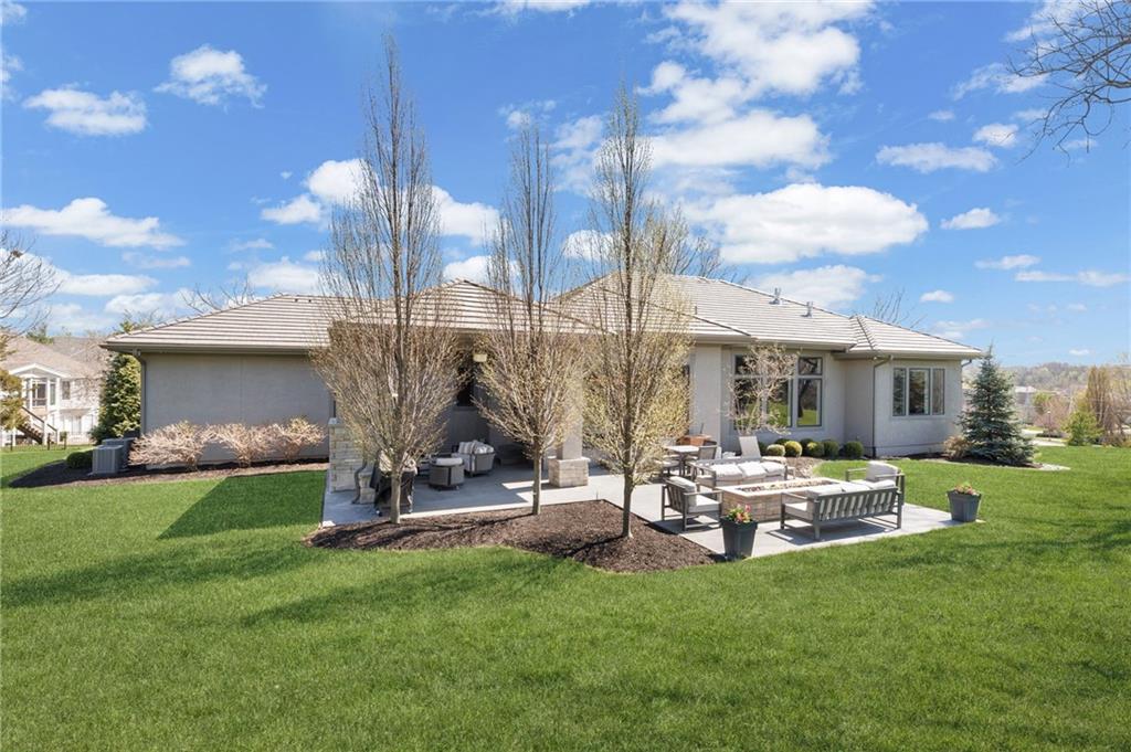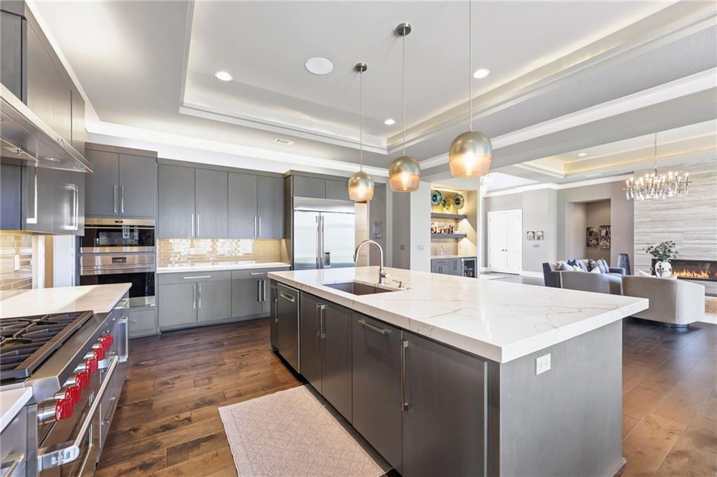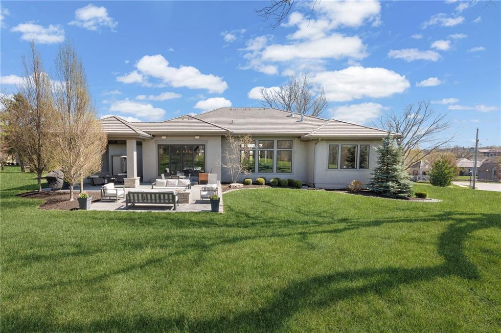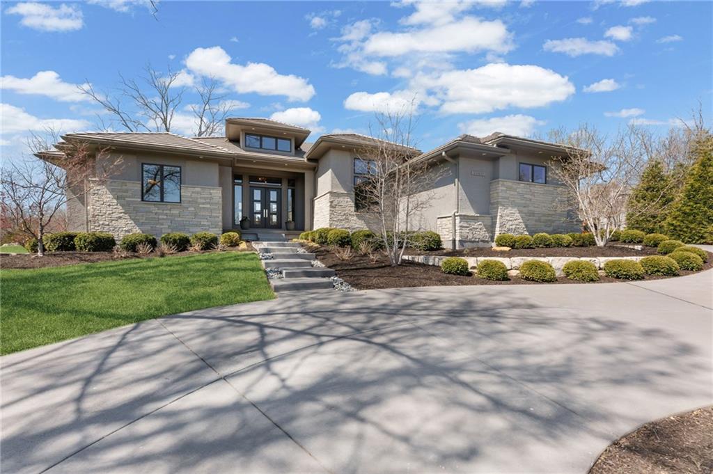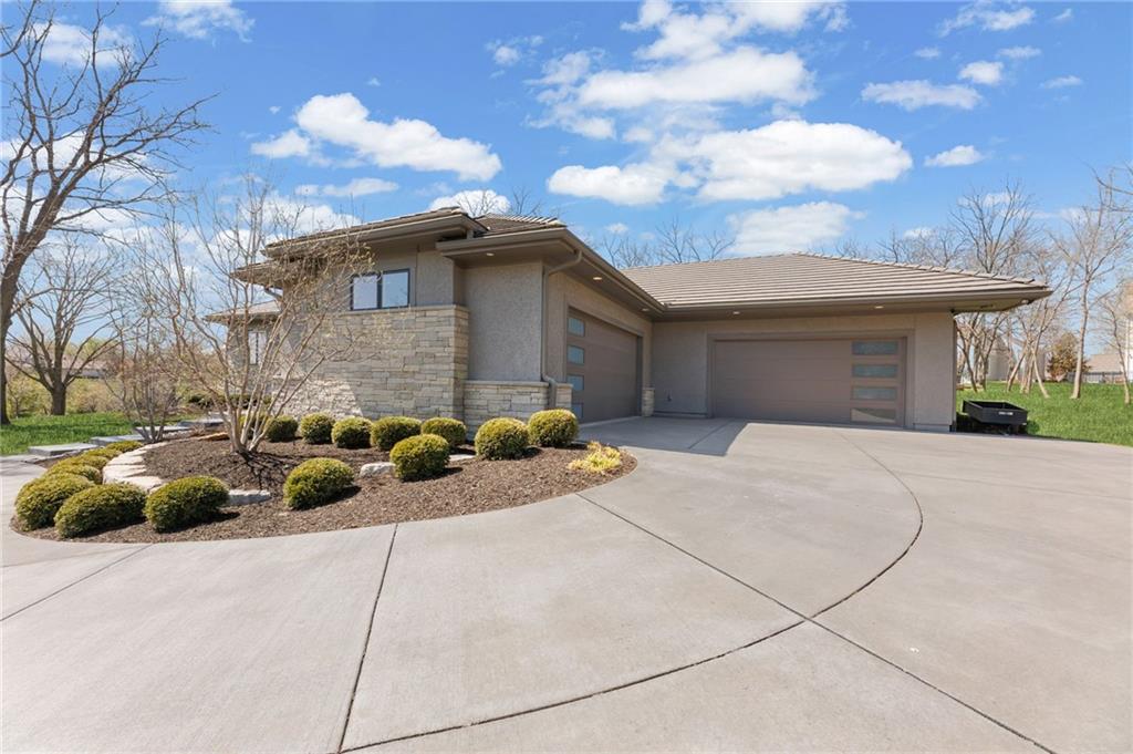 Custom-built with every modern amenity in mind, this stunning reverse 1.5-story home sits on 1.85 acres. Featuring 4 bedrooms, 4 full baths & 1 half bath, this home is thoughtfully designed for both everyday living and entertaining. The main level showcases an expansive open floor plan with dining to accommodate 10+ guests, anchored by a massive island and a chef’s dream kitchen. The kitchen boasts custom cabinets & premium Wolf & Sub-Zero appliances including a gas range, second oven, and built-in wall coffee maker. A huge walk-in pantry, spacious hall mudroom, and main-level laundry add convenience, while the primary suite and a private guest bedroom with full bath complete the main floor. Elevated finishes such as 6-inch custom trim and impressive 8-foot solid wood doors on the main level. The primary suite is a true retreat, featuring a cozy fireplace and a spa-inspired bathroom with a large tiled shower, freestanding soaking tub, double vanity, and a show stopping walk-in closet designed to impress.The lower level is equally well-appointed with soaring 10-foot ceilings, offering a large media room, dedicated office, home gym, bar and a wine room perfect for entertaining. Two additional bedrooms, each with their own en-suite bath and tiled showers, provide comfort and privacy for guests or family. Perfectly positioned to capture breathtaking sunset views overlooking green space, the outdoor living areas are just as impressive. Enjoy the covered patio with fireplace, an expansive patio with built-in stone fire pit, and large garden beds; with ample room to add a pool and create your dream backyard oasis. Additional highlights included 2x6 framing, a striking stucco and natural stone exterior, oversized 4-car garage, dual HVAC systems, EV charger, and countless high-end finishes throughout.