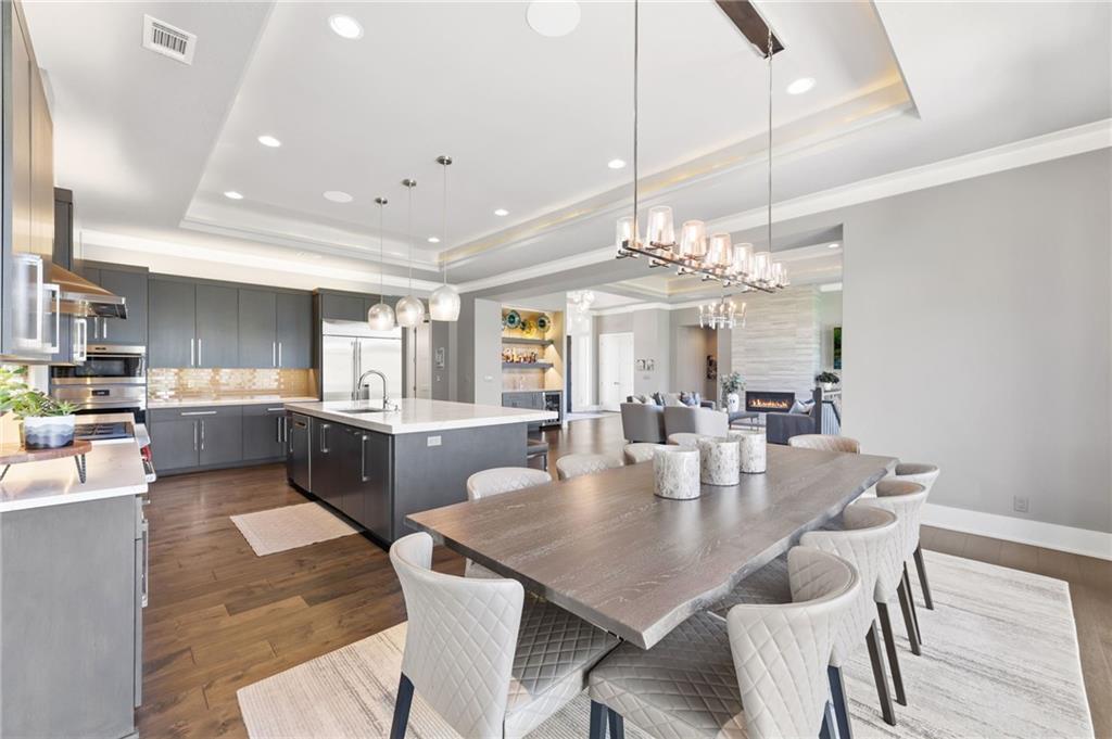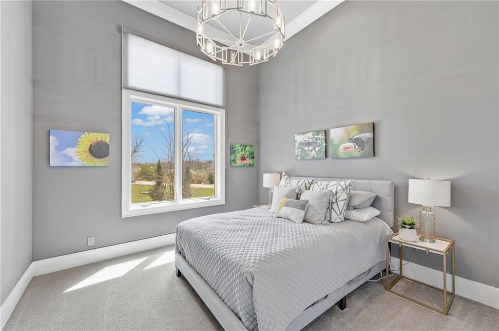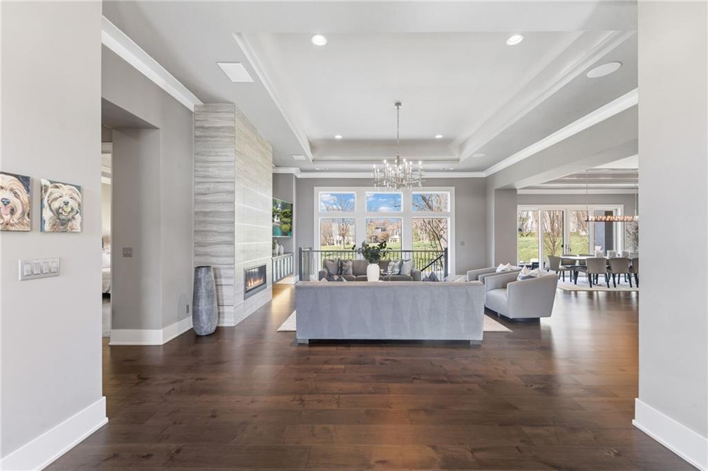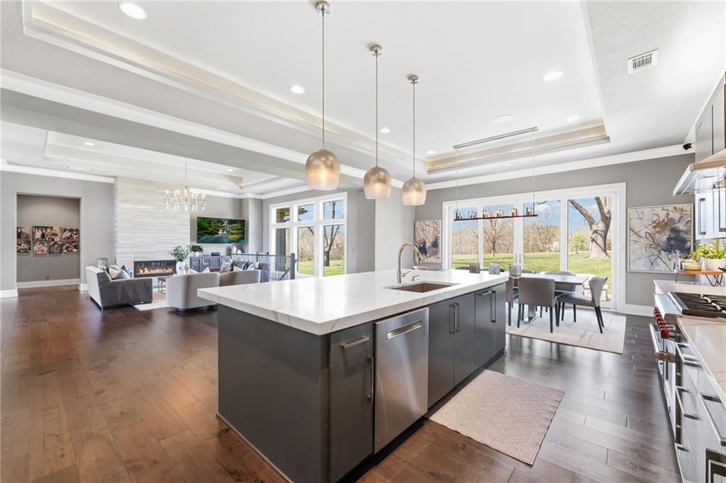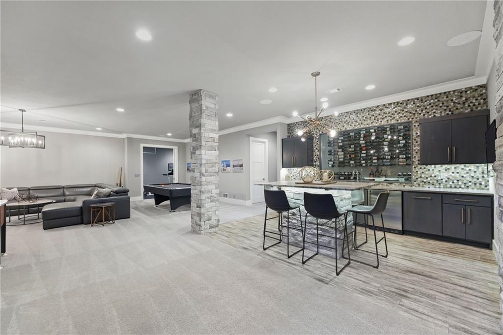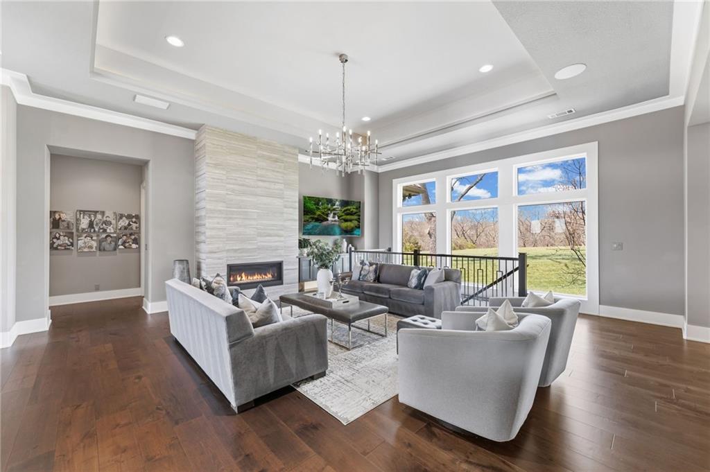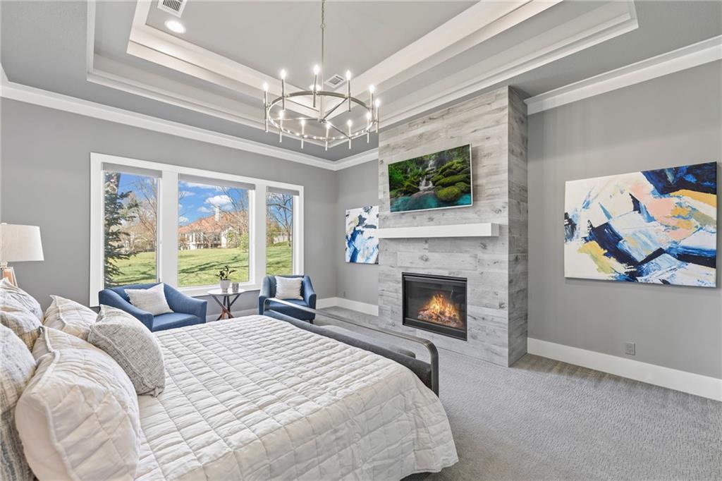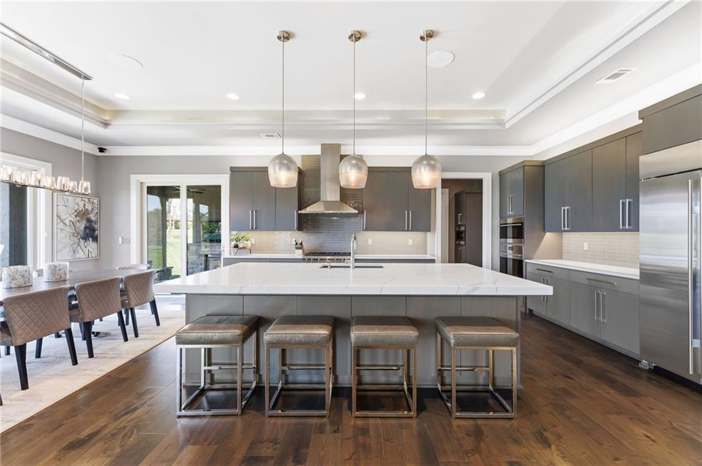 Custom-built with every modern amenity in mind, this stunning reverse 1.5-story home sits on 1.85 acres. Featuring 4 bedrooms, 4 full baths & 1 half bath, this home is thoughtfully designed for both everyday living and entertaining. The main level showcases an expansive open floor plan with dining to accommodate 10+ guests, anchored by a massive island and a chef’s dream kitchen. The kitchen boasts custom cabinets & premium Wolf & Sub-Zero appliances including a gas range, second oven, and built-in wall coffee maker. A huge walk-in pantry, spacious hall mudroom, and main-level laundry add convenience, while the primary suite and a private guest bedroom with full bath complete the main floor. Elevated finishes such as 6-inch custom trim and impressive 8-foot solid wood doors on the main level. The primary suite is a true retreat, featuring a cozy fireplace and a spa-inspired bathroom with a large tiled shower, freestanding soaking tub, double vanity, and a show stopping walk-in closet designed to impress.The lower level is equally well-appointed with soaring 10-foot ceilings, offering a large media room, dedicated office, home gym, bar and a wine room perfect for entertaining. Two additional bedrooms, each with their own en-suite bath and tiled showers, provide comfort and privacy for guests or family. Perfectly positioned to capture breathtaking sunset views overlooking green space, the outdoor living areas are just as impressive. Enjoy the covered patio with fireplace, an expansive patio with built-in stone fire pit, and large garden beds; with ample room to add a pool and create your dream backyard oasis. Additional highlights included 2x6 framing, a striking stucco and natural stone exterior, oversized 4-car garage, dual HVAC systems, EV charger, and countless high-end finishes throughout.
