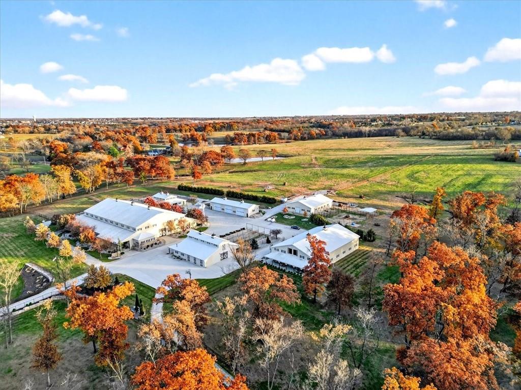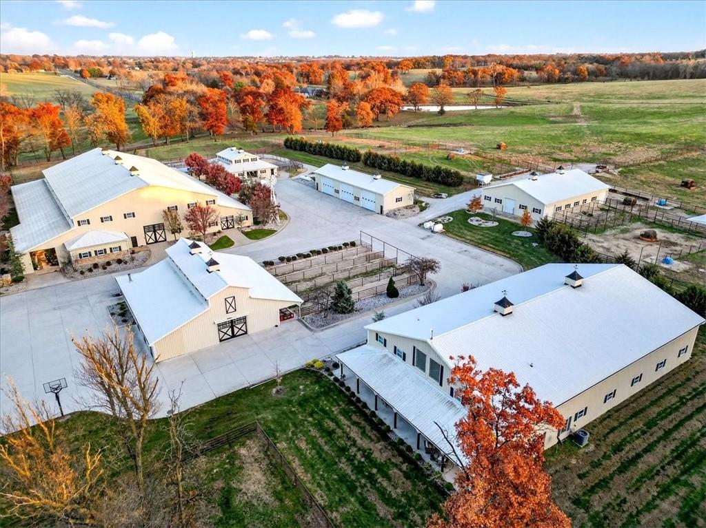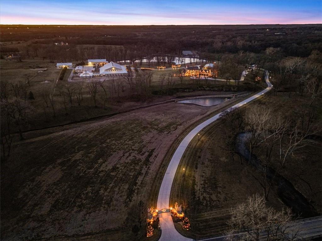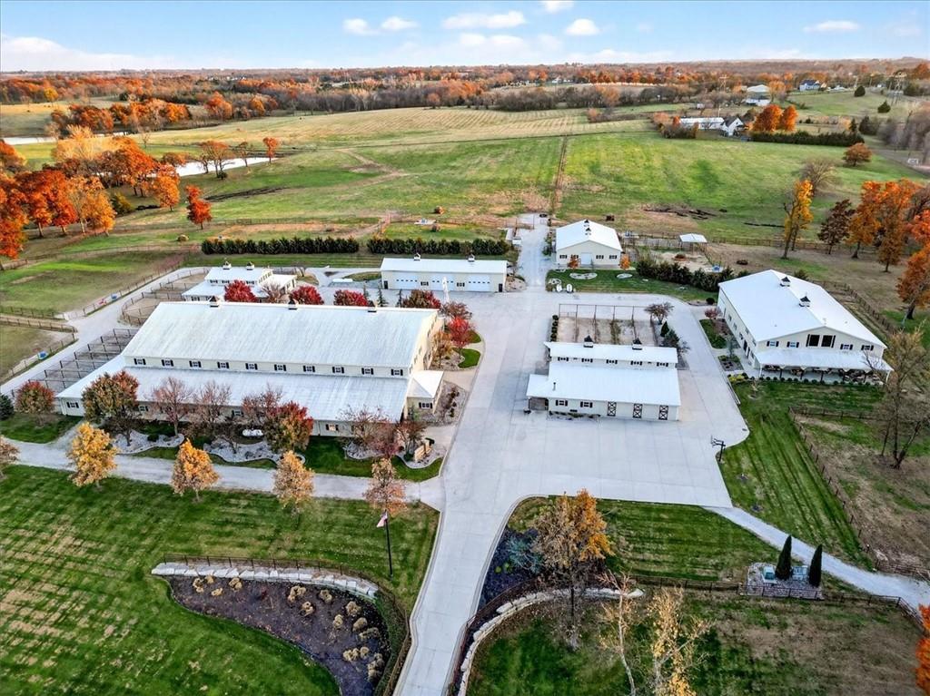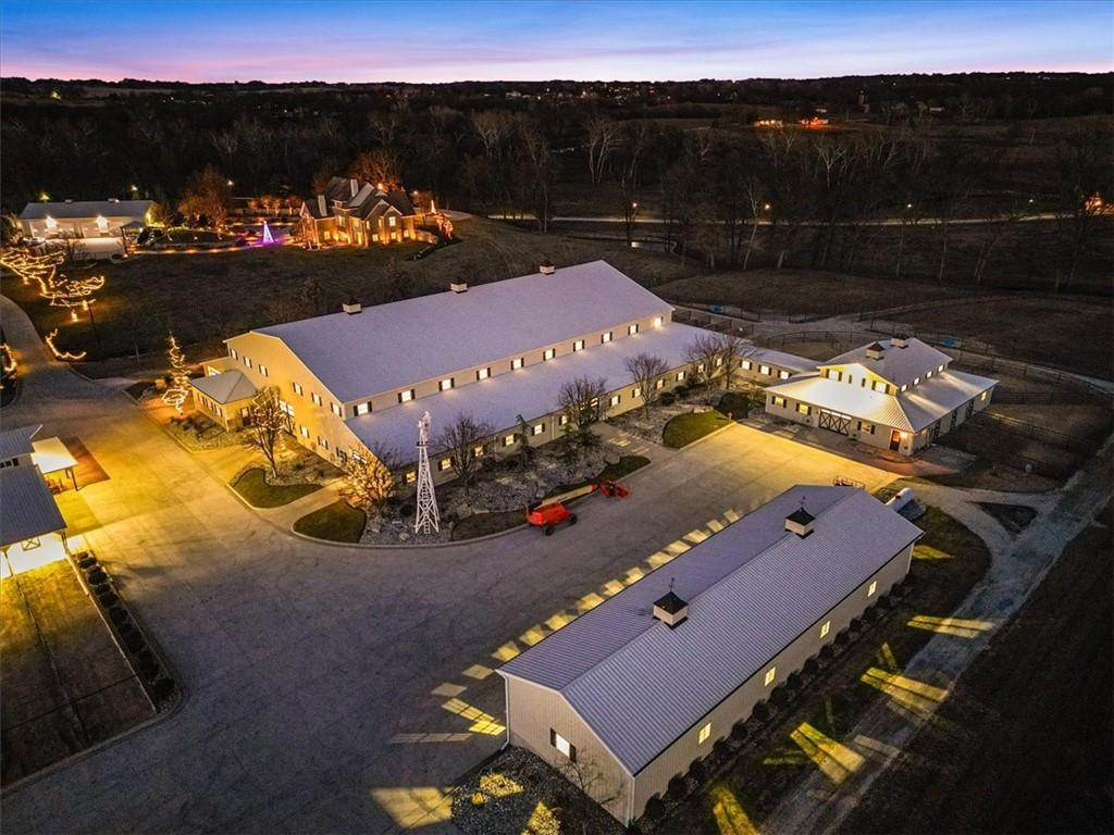 Beyond a private gate, the world quiets. A long drive carries you across rolling ground, revealing the estate not all at once, but deliberately, an arrival designed to signal that what lies ahead is rare, considered, and enduring. The main residence spans nearly 13,000 square feet, composed with a balance of architectural authority and everyday livability. Grand gathering rooms flow naturally into intimate retreats, creating a home that accommodates celebration as gracefully as solitude. Four fireplaces bring warmth and rhythm to the interiors. A private theater, multiple offices, and recreation spaces reflect a modern understanding of luxury, one where productivity, restoration, and entertainment coexist without compromise. Expansive windows draw the landscape inward, making light and horizon constant companions. Living extends outward to a screened porch and resort-style grounds, where a pool rests beneath open sky and uninterrupted views. A four-car garage supports both daily life and stewardship of the estate, reinforcing that every detail here serves both beauty and function. Beyond the main residence, the property unfolds into a fully realized compound. An equestrian arena anchors the landscape, accompanied by a viewing room with kitchenette, transforming utility into experience. Multiple barns, including those with sleeping quarters, a cattle barn, and a guest house with garage, offer versatility for equestrian pursuits, multigenerational living, or private events. Approximately 78 acres of gently contoured land with the opportunity to expand by an additional 110 - are shaped by two ponds, open pasture, and long sightlines that preserve privacy without isolation. Though quietly removed, the estate remains within reach of the Kansas City metro, a rare equilibrium of seclusion and accessibility. This is not simply a residence. It is a landscape composed for living- expansively, privately, and with permanence.
