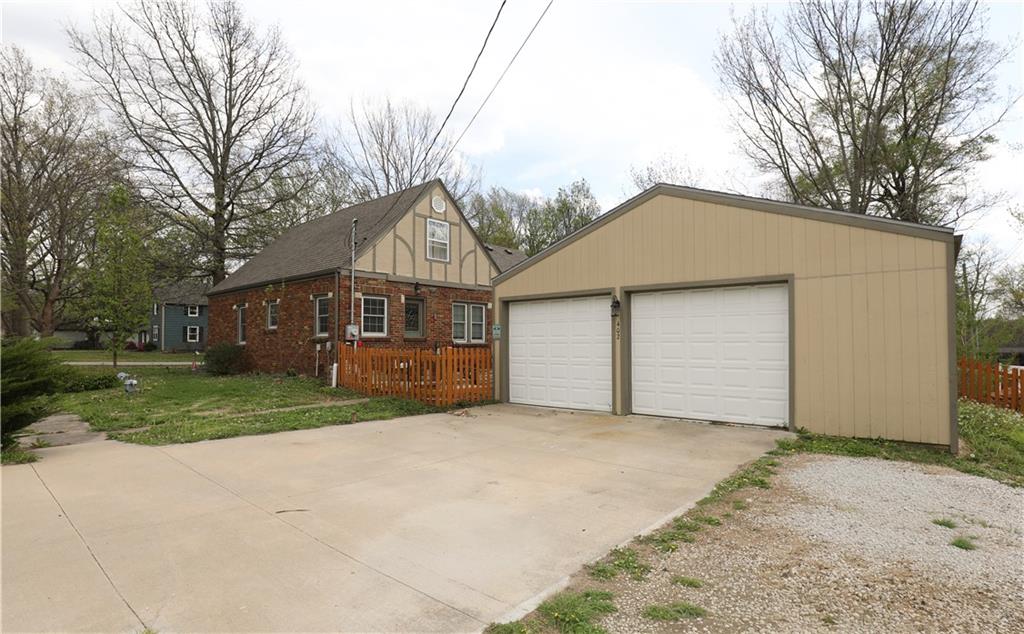 Welcome to this beautifully maintained, rare 1.5-story brick Tudor-style gem in the heart of Louisburg, full of charm, character, and history. Formerly owned by “Doc Gatley,” this one-of-a-kind 1920s home features beautiful hardwood floors, mature shade trees, updated windows, and a newer roof. The upper level offers a bedroom, full bath, second living area, large closet, and bonus room perfect for an office, nursery, playroom, or hobby space. All kitchen appliances stay, making this home move-in ready. Enjoy the cozy sunroom with sliding doors leading to a wraparound deck. Situated on a charming corner city lot, the property offers a spacious yard for kids or pets, a raised garden bed, a 1-car basement garage, and an impressive 24x28 detached heated and cooled garage/shop with 10-foot walls. All of this is just a short walk to downtown Louisburg, with affordable utilities and fiber optic service available. Don’t miss this rare opportunity to own a truly special piece of Louisburg history. This cute and charming home offers a unique “country doctor” feel with the convenience of in-town living.