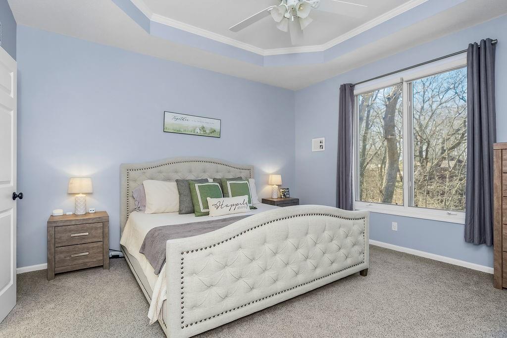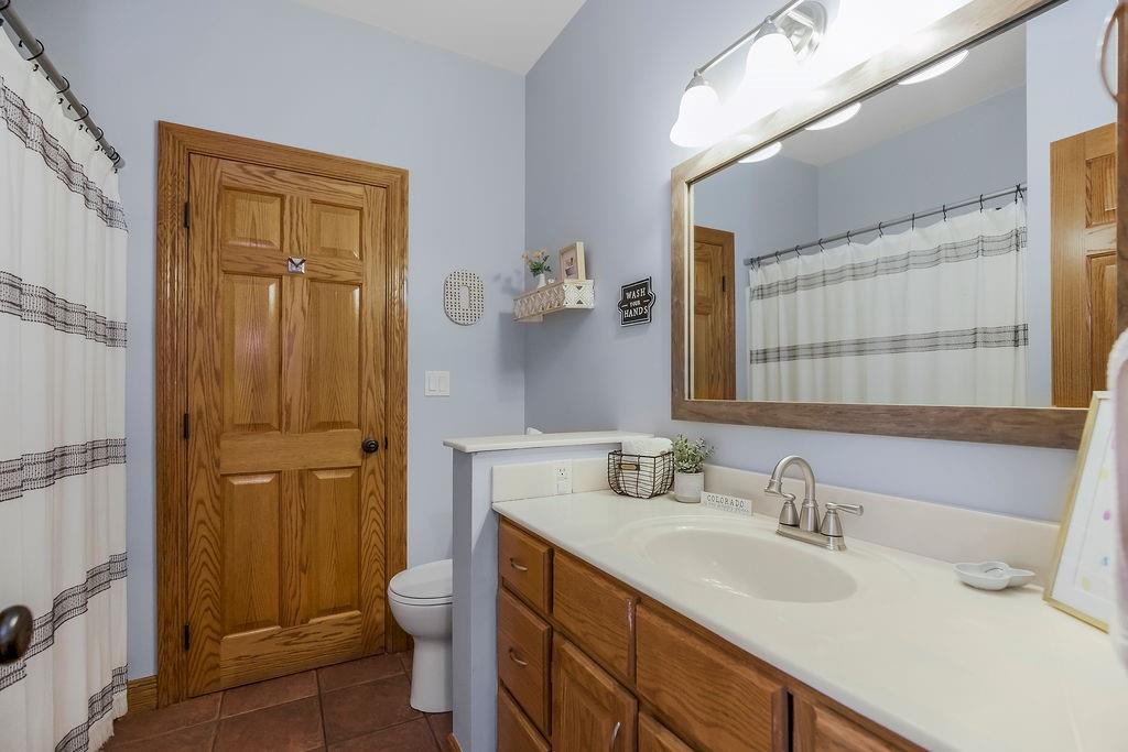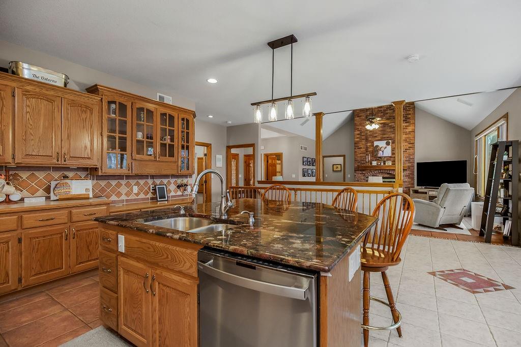 Beautiful reverse 1.5-story home located in the desirable Black Swan Estates community. This 3-bedroom, 3 full bath home features a fully finished walkout lower level complete with a wet bar and private guest suite—perfect for entertaining or extended stays. Beautiful primary bedroom plus 2nd bedroom on main floor. Wide open main floor with huge island kitchen overlooking great room. Bonus sunroom off the kitchen would be a great playroom or office! Enjoy abundant storage throughout and easy access to the suspended garage, ideal for a workshop or hobby space. There are steps from main garage to the lower level workshop area. Bonus storage room off the basement. Step out onto the deck overlooking a private, wooded lot—perfect for relaxing or enjoying nature. Nestled in a quiet neighborhood with lake access and a community pool, this home offers both privacy and charm. Great location close to downtown Shawnee, with easy access to shops, restaurants, and everyday conveniences!