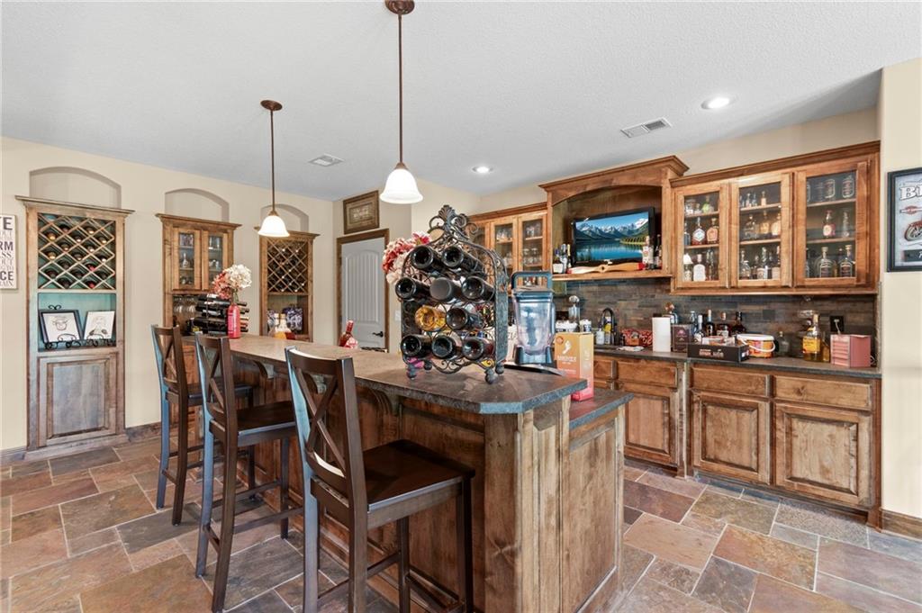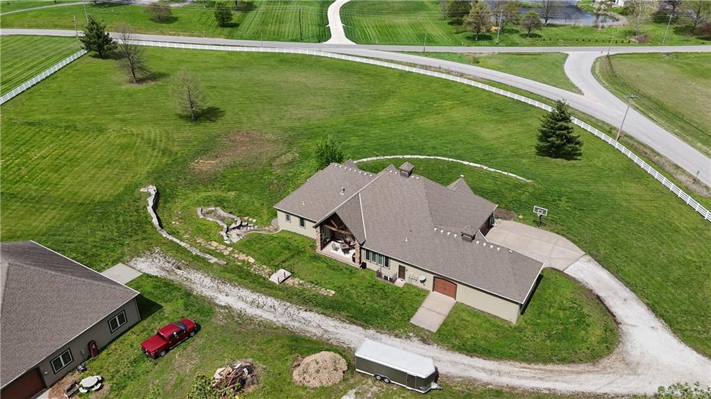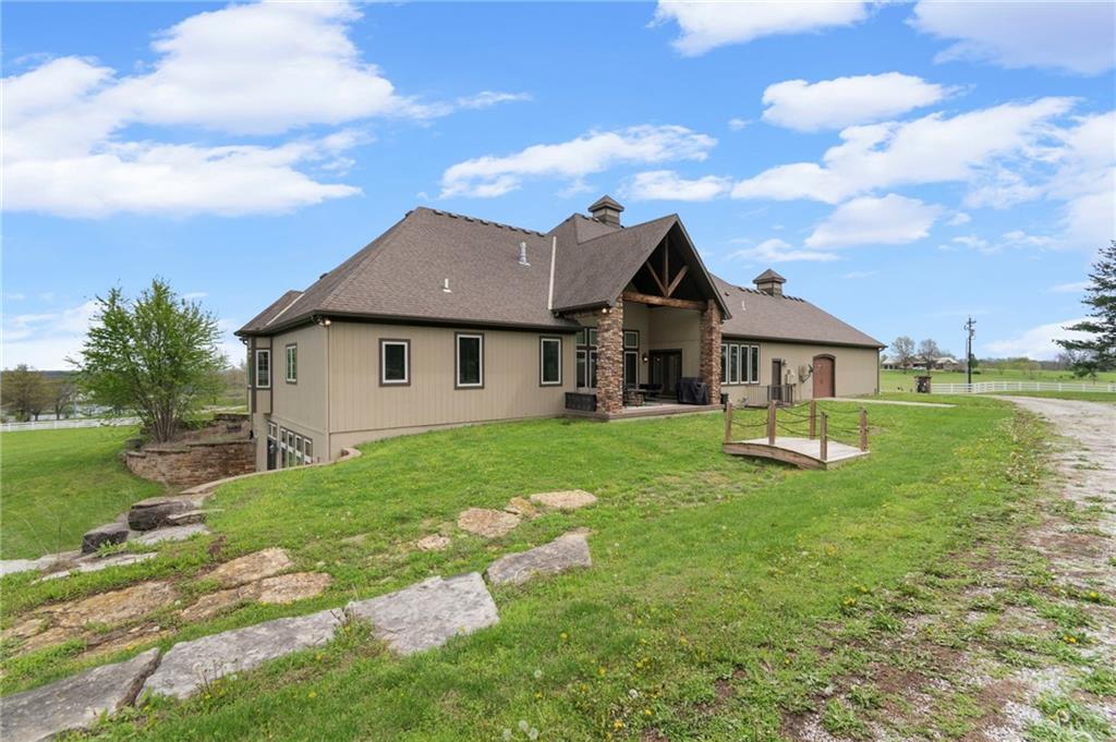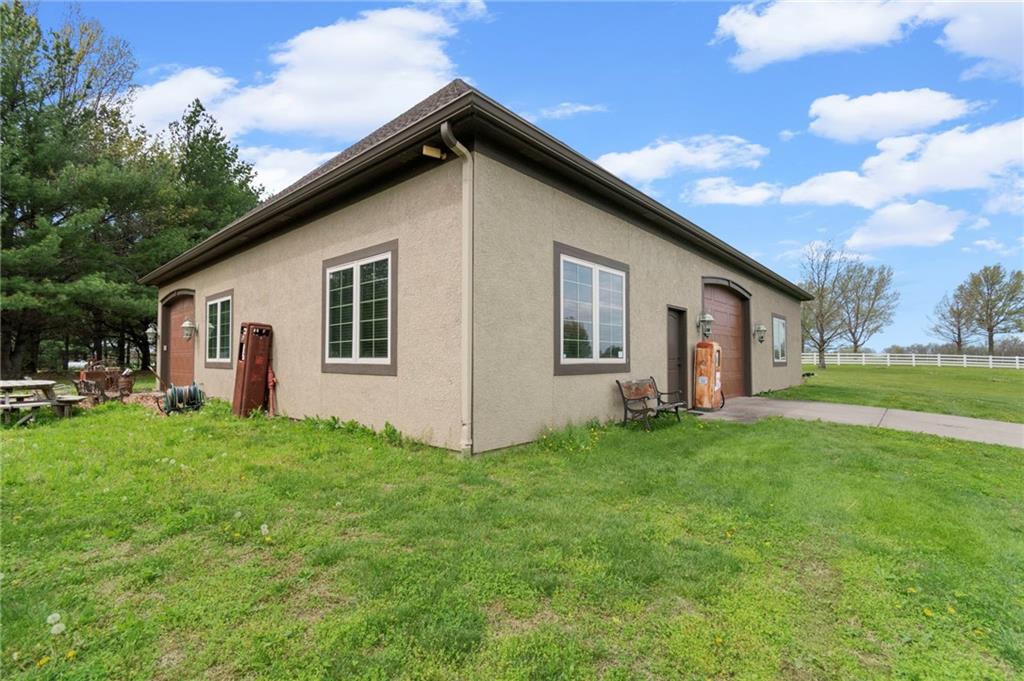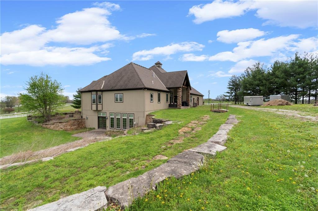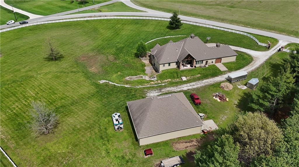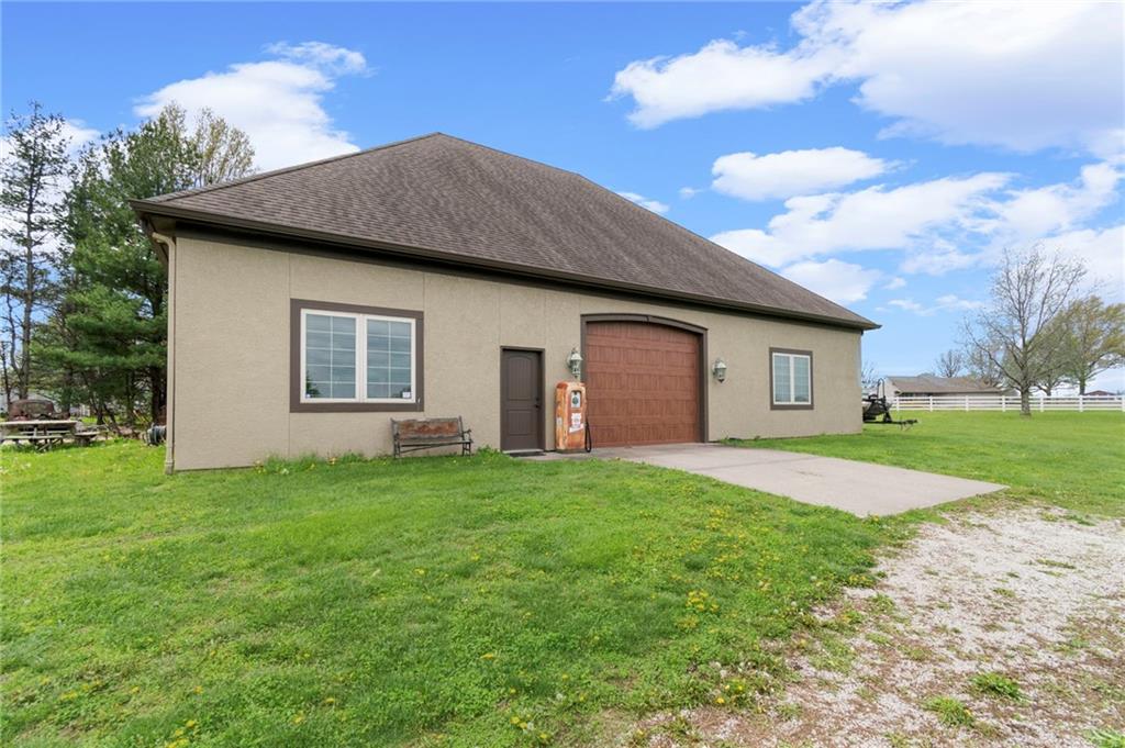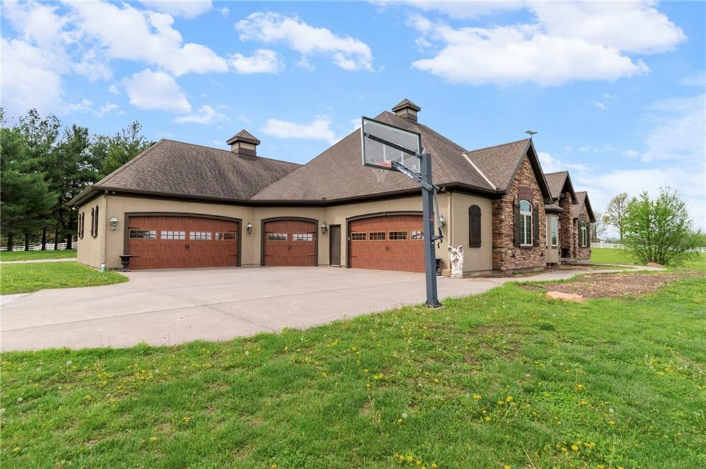 Set on nearly five acres just outside of town, this Kearney estate checks every box and then adds a few you didn’t know you needed. Inside, the main living space opens into a layout that feels open and intentional. The living room, dining area, and kitchen flow together seamlessly, anchored by hardwood floors and natural light. A fireplace with custom built-ins adds a focal point.The kitchen is built for real life and gatherings. Granite countertops, custom cabinetry, double wall ovens, and an oversized island make prep and hosting easy. A walk-in pantry keeps everything tucked away. The main level offers flexibility with a front room that can serve as a bedroom, formal dining space, or office. Two additional bedrooms share a well-designed bath with separate vanity areas. The primary suite is set apart, featuring a large walk-in closet and spa-like bath with soaking tub, tiled shower with dual heads, and double vanity. Laundry and a half bath complete the level. Downstairs, the finished lower level is built for hosting. A full wet bar with a large island opens into a second living area with its own fireplace. A private bedroom and bath make it ideal for guests or multi-generational living, along with a half bath and flexible space for a gym, office, or sixth non-conforming bedroom. Storage is extensive, with a suspended slab design offering approximately 55x31 of storage space, plus an additional 21x11 area that also functions as a secure storm shelter. The six-car attached garage provides plenty of space, and the detached 50x60 shop adds even more with its own office, bathroom, car wash, and paint bay, plus an unfinished upper level. Built with intention, the home features structural beams for wide open spaces, twelve-foot ceilings on both levels, geothermal heating, and energy-efficient windows. Mineral rights convey with the property, including oil and water discovered during the geothermal process and registered with the Missouri Department of Natural Resources.