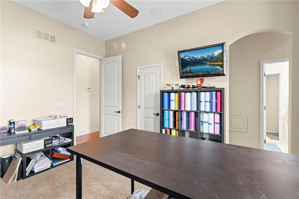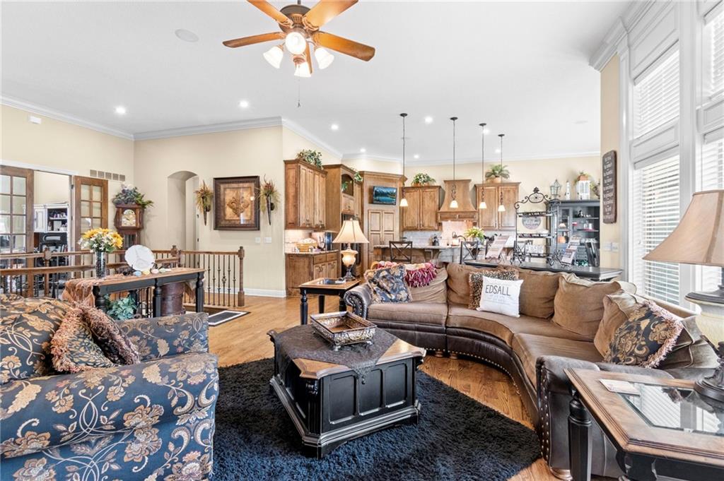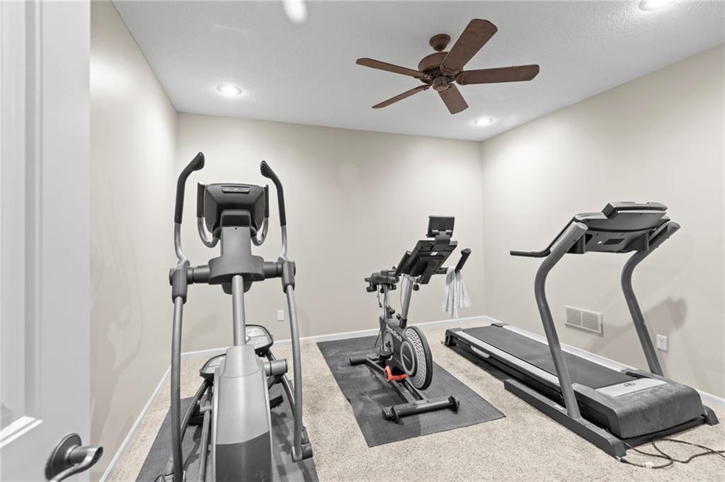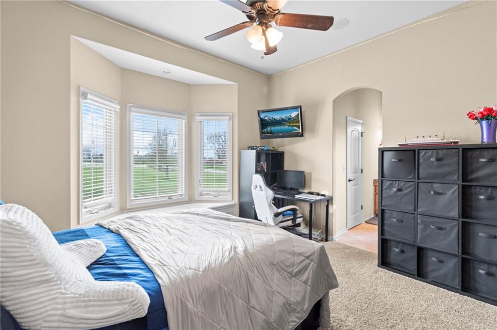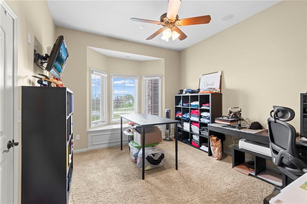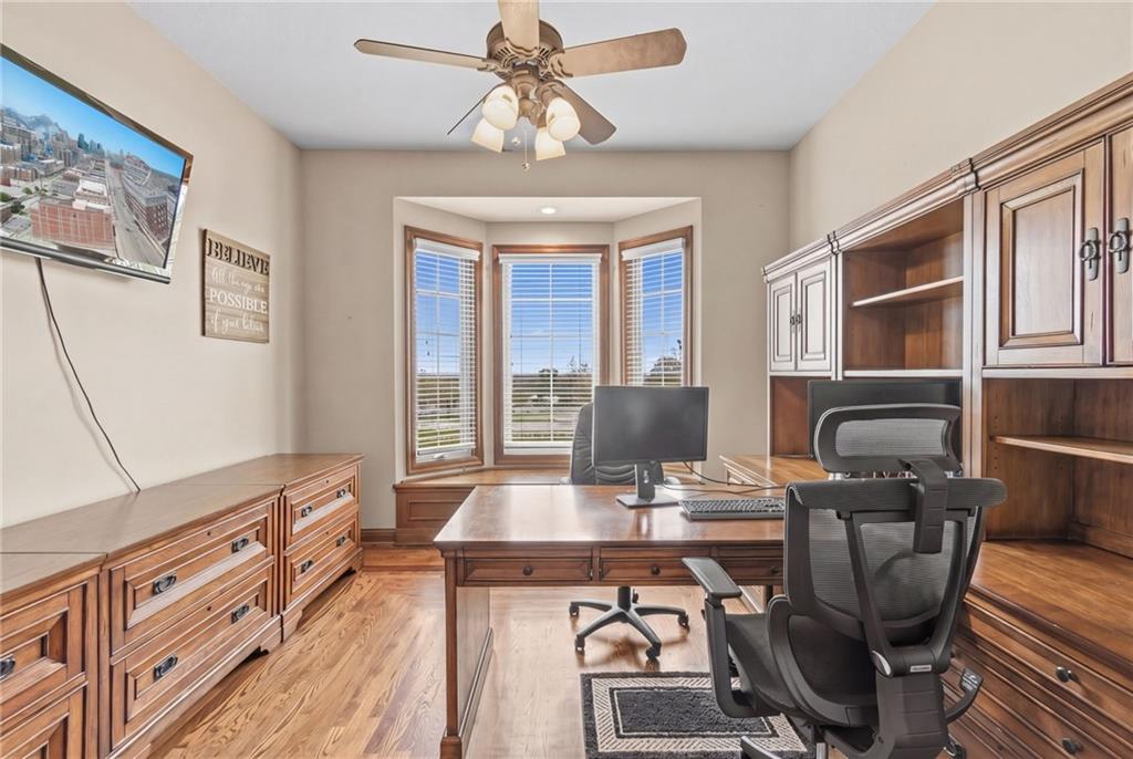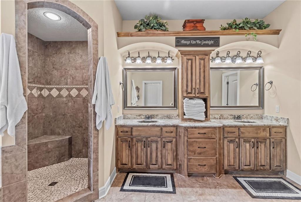 Set on nearly five acres just outside of town, this Kearney estate checks every box and then adds a few you didn’t know you needed. Inside, the main living space opens into a layout that feels open and intentional. The living room, dining area, and kitchen flow together seamlessly, anchored by hardwood floors and natural light. A fireplace with custom built-ins adds a focal point.The kitchen is built for real life and gatherings. Granite countertops, custom cabinetry, double wall ovens, and an oversized island make prep and hosting easy. A walk-in pantry keeps everything tucked away. The main level offers flexibility with a front room that can serve as a bedroom, formal dining space, or office. Two additional bedrooms share a well-designed bath with separate vanity areas. The primary suite is set apart, featuring a large walk-in closet and spa-like bath with soaking tub, tiled shower with dual heads, and double vanity. Laundry and a half bath complete the level. Downstairs, the finished lower level is built for hosting. A full wet bar with a large island opens into a second living area with its own fireplace. A private bedroom and bath make it ideal for guests or multi-generational living, along with a half bath and flexible space for a gym, office, or sixth non-conforming bedroom. Storage is extensive, with a suspended slab design offering approximately 55x31 of storage space, plus an additional 21x11 area that also functions as a secure storm shelter. The six-car attached garage provides plenty of space, and the detached 50x60 shop adds even more with its own office, bathroom, car wash, and paint bay, plus an unfinished upper level. Built with intention, the home features structural beams for wide open spaces, twelve-foot ceilings on both levels, geothermal heating, and energy-efficient windows. Mineral rights convey with the property, including oil and water discovered during the geothermal process and registered with the Missouri Department of Natural Resources.