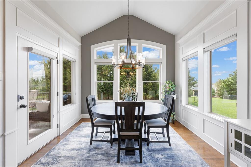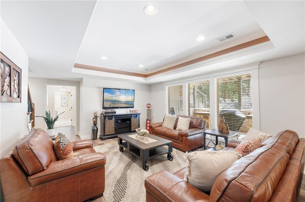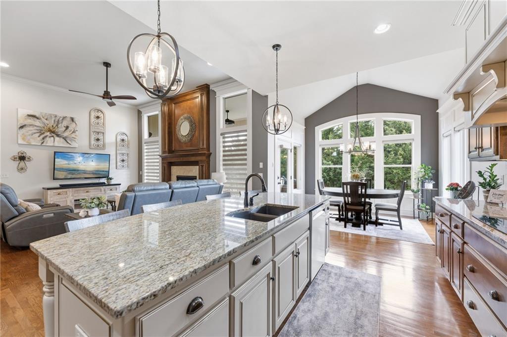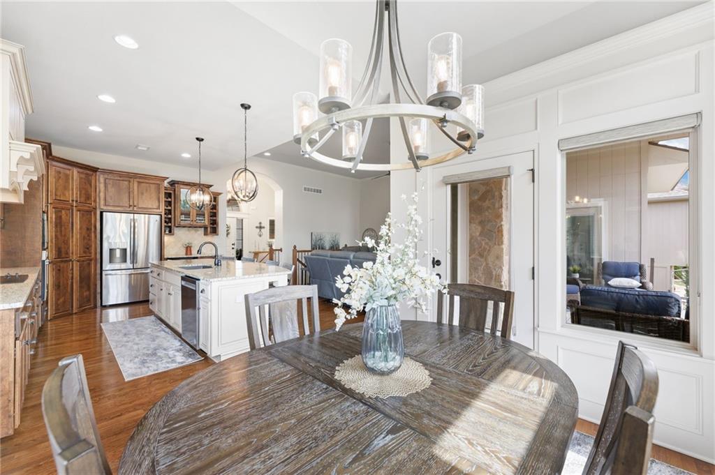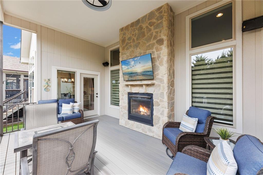 Welcome to this stunning former model home by James Engle Homes, showcasing the highly sought-after Emery reverse floor plan and loaded with gorgeous upgrades throughout. This beautifully designed 4-bedroom home offers the perfect blend of luxury and functionality. The main level features a spacious, light-filled great room with rich wood flooring and a striking see-through stone fireplace that extends to the covered, maintenance-free deck—creating a warm and inviting atmosphere both indoors and out. The gourmet kitchen is equally impressive, complete with granite countertops, double ovens, and a generous walk-in pantry, making it perfect for everyday living and entertaining. The luxurious primary suite offers a private retreat with dual vanities and a custom-tiled walk-in shower. The finished walkout/walkup lower level expands your living space with a large rec room, wet bar, two additional bedrooms, and a full bath—ideal for guests or entertaining. Step outside to enjoy exceptional outdoor living, including the covered deck with fireplace access and a beautifully designed stone patio with a fire pit, all backing to a serene tree line for added privacy. Additional highlights include a newer roof (just 2 years old) and access to fantastic neighborhood amenities, including a community pool. This home truly offers comfort, style, and convenience—don’t miss your opportunity to make it yours!