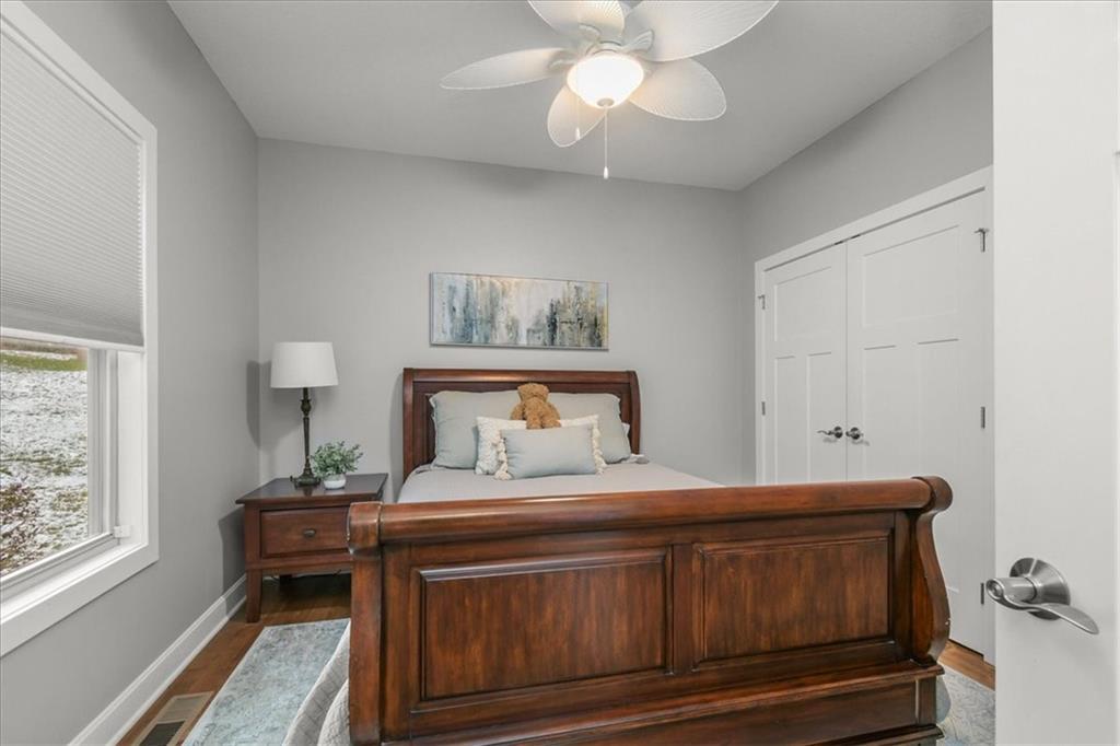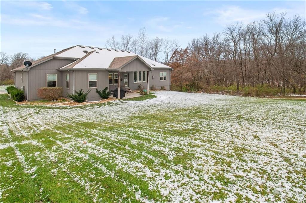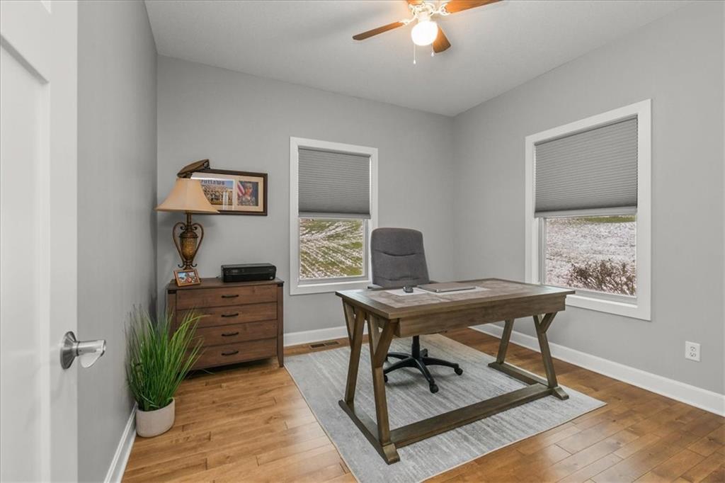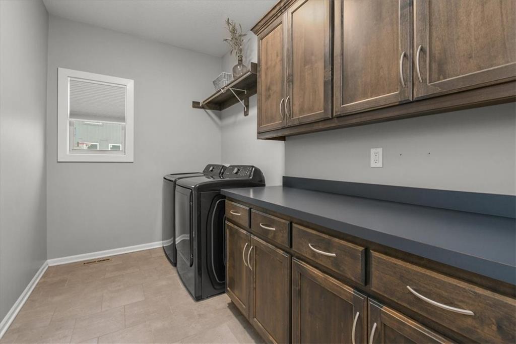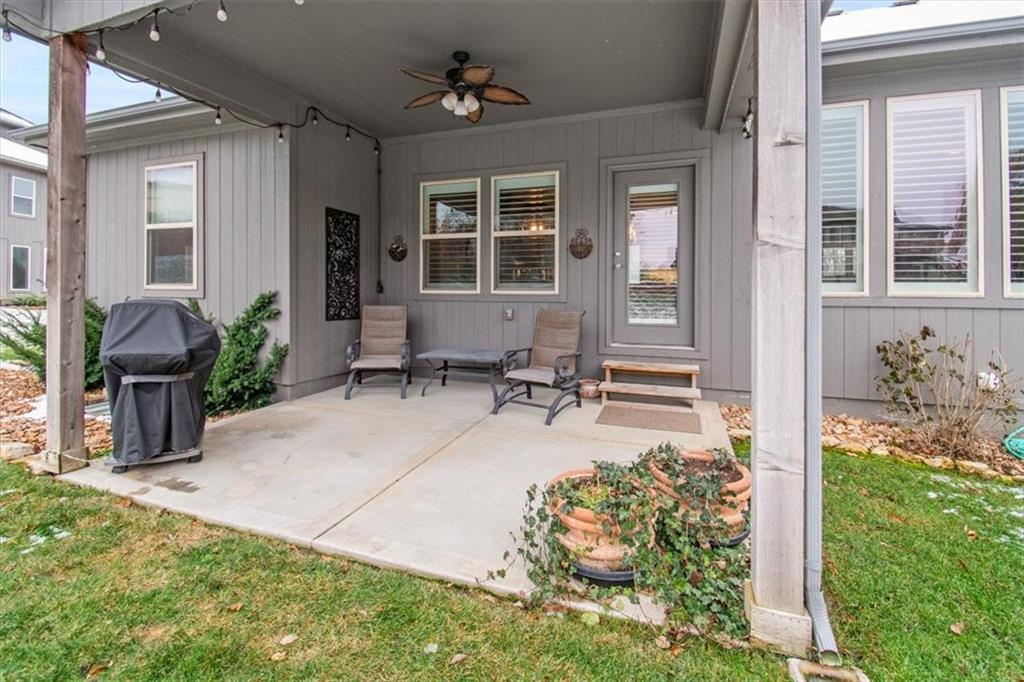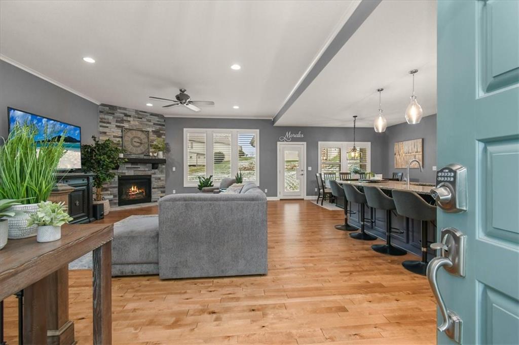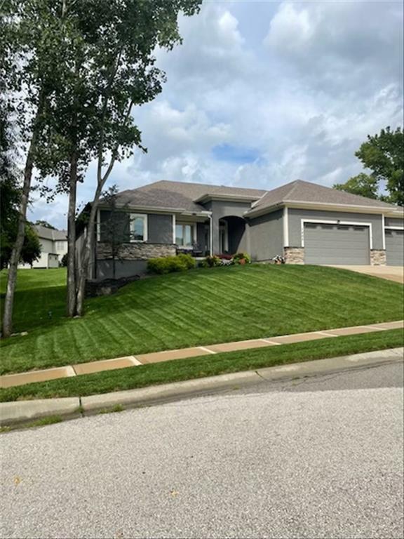 Prepare to be absolutely wowed by this ranch-style architectural masterpiece, a turnkey property where contemporary design meets luxurious, comfortable living. The home immediately impresses with its stunning façade of textured stucco and stacked stone accents, setting a sophisticated tone from the curb. Step inside onto gleaming hardwood floors that guide you through the expansive, open-concept design, flooded with natural light from oversized windows, most accented with custom plantation shutters. The heart of the home is the gourmet kitchen, a true chef's dream, showcasing rich, dark wood cabinetry equipped with soft close cabinets throughout, sleek granite countertops, and a show-stopping dark gray center island with seating—perfect for hosting and entertaining. Transition from the kitchen to the bright dining area and the spacious living room, anchored by a magnificent corner stone fireplace for cozy evenings. Retreat to the main floor private sanctuary in the primary suite, an oasis of calm with a stylish blue accent wall and an elegant tray ceiling that adds grandeur. The spa-like en-suite boasts a sleek double vanity with crisp white cabinetry, a glass-enclosed walk-in shower, and leads into a custom walk-in closet with ample built-in organization. Adding to the home's impressive functionality is a main-floor laundry room with gorgeous dark wood cabinetry, offering maximum convenience, complemented by a central vacuum system. For outdoor enjoyment, step onto the covered back patio, ideal for al-fresco dining or relaxing with a ceiling fan overhead. Below, the vast, unfinished basement presents a phenomenal opportunity to customize and expand—a blank canvas for adding a future home gym, theater, or additional living space to create your ultimate dream home. This is more than a home; it's an uncompromising quality lifestyle awaiting its new owner in a coveted community with excellent highway access for a convenient commute.