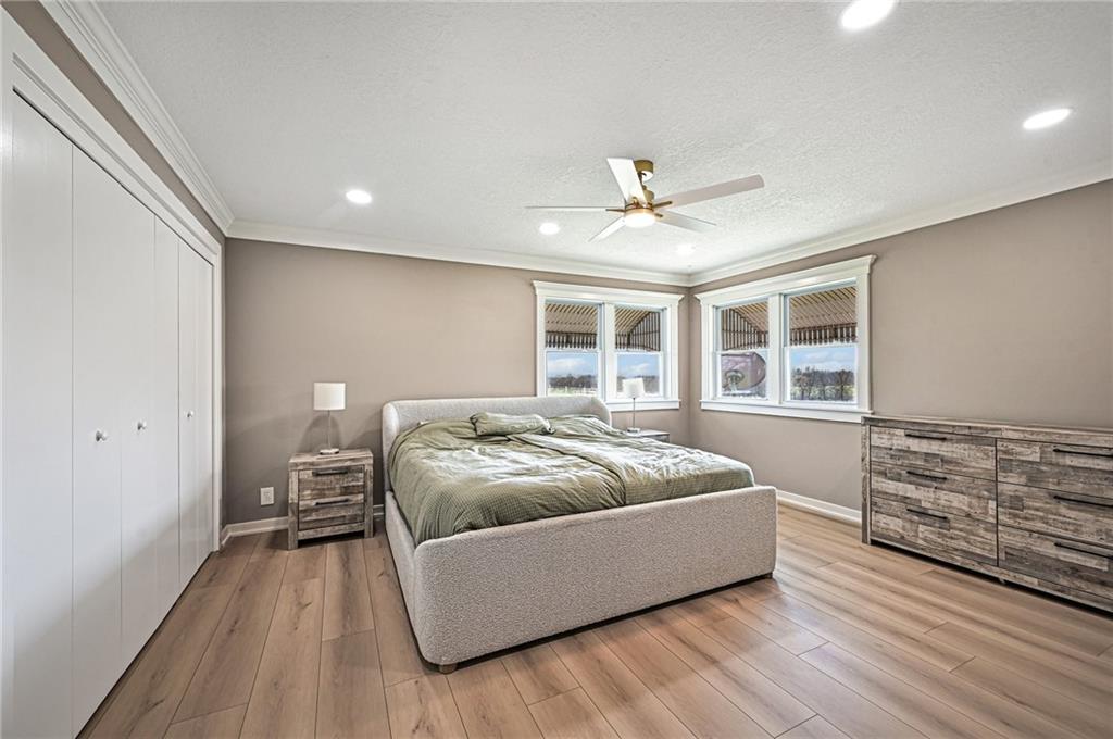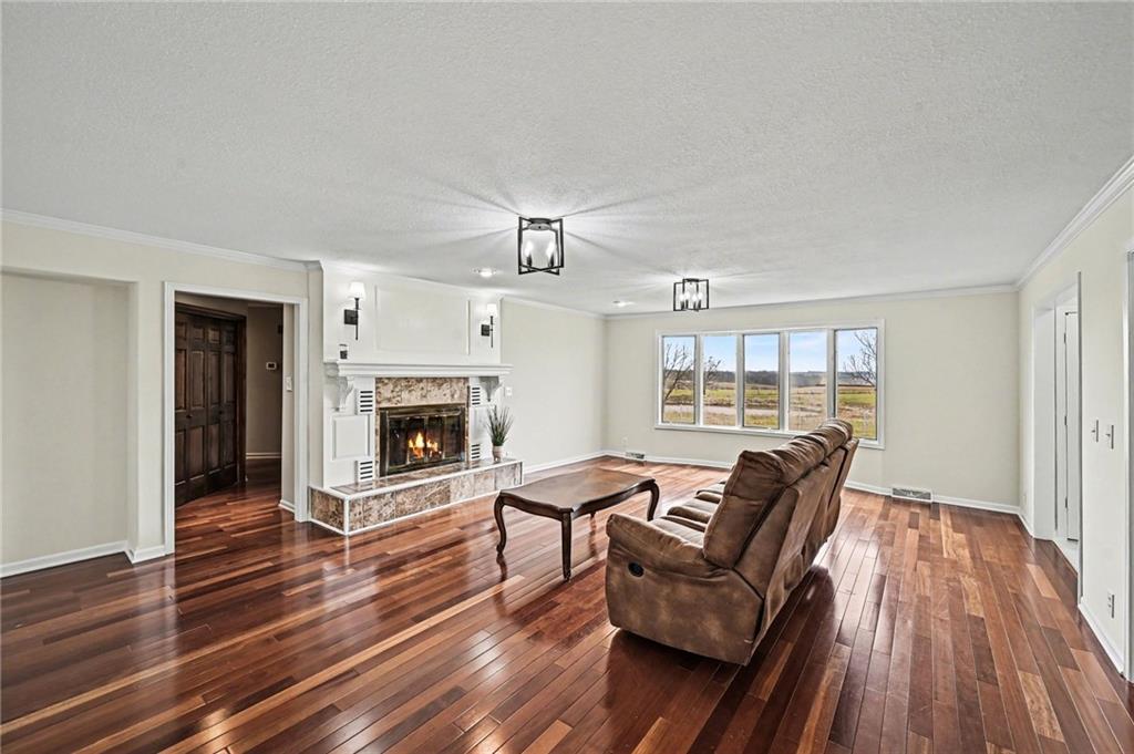 Set on 19+/– acres, this charming home is full of character with bright, open spaces, gorgeous wood floors, and a beautiful fireplace that greets you at the door. The dining room features built in storage, and the kitchen blends stainless steel appliances with classic white cabinetry for a warm, timeless feel. The spacious primary suite offers three closets and a luxurious bathroom complete with a soaking tub, separate shower, double sinks, and even a rare sauna. The main level also includes an additional bedroom and full bathroom, all carrying that same updated yet inviting style. Downstairs is built for entertaining with a large recreation room, second fireplace, and an impressive wet bar. You will also find three versatile rooms perfect for a gym, craft space, playroom, or whatever fits your lifestyle. Outside, enjoy your own private acreage featuring a shop, barn, chicken coop, pond, and a cozy firepit area. Whether you are dreaming of a hobby farm or just room to spread out, this property offers the space and charm to make it happen.