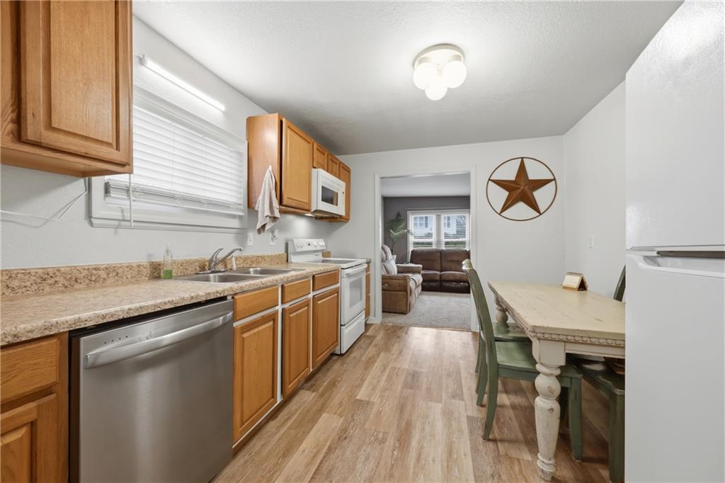 Don't miss out on this opportunity! Come and see this very well-maintained and affordable two bedroom and one bathroom home with a brand-new metal roof and doors. Everything you need is located on one level. You can feel at ease, as this home has just had foundation work completed and the warranty is transferable. This home is in a great location as it is just a few blocks from school and the pool. As you enter the front door, you walk into the cozy living room. To your left is one of the bedrooms and across the living room is the second bedroom. The bathroom is also on the left side of this home. The living room opens up to an open kitchen/dinning room space where you can enjoy a meal with your friends and family. On the other side of the kitchen, is the laundry room/mudroom, which, conveniently, has another entrance to the outside. There is a spacious, partially-fenced back yard as well as a storage shed. In the backyard, you can enjoy an open view and have plenty of space. Buyer and buyer's agent to verify all information and measurements. Photos have been, professionally, enhanced.