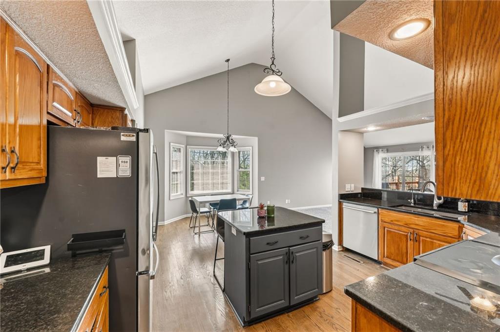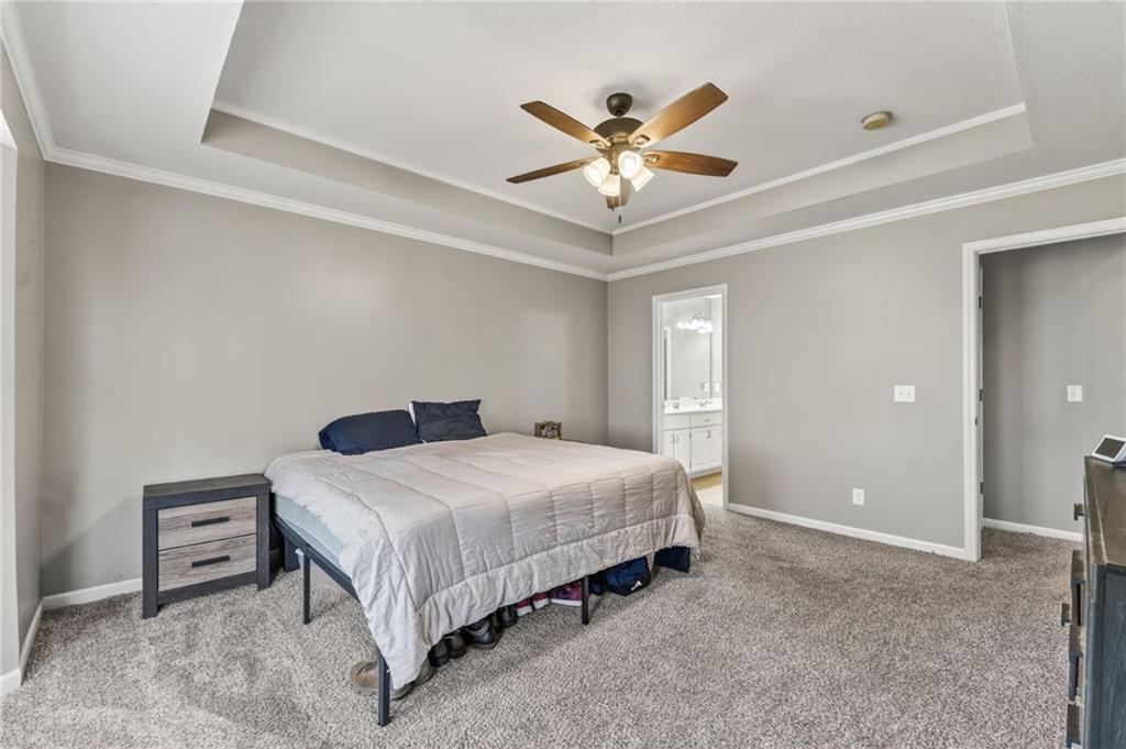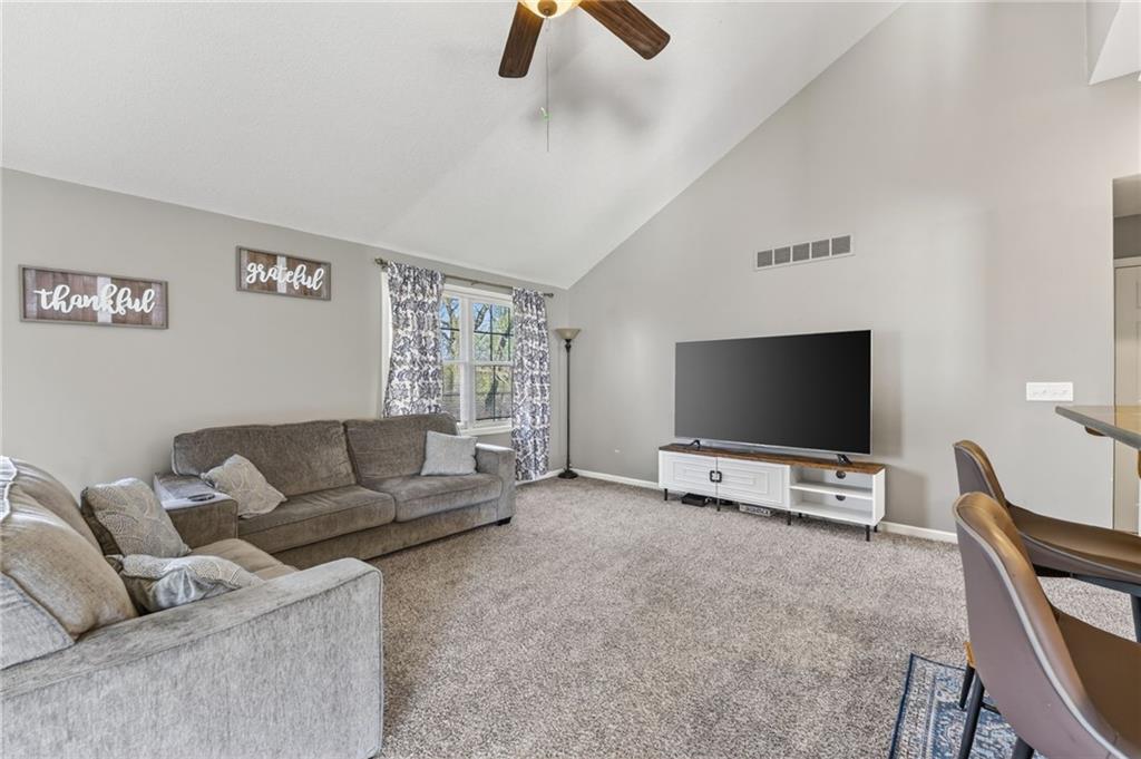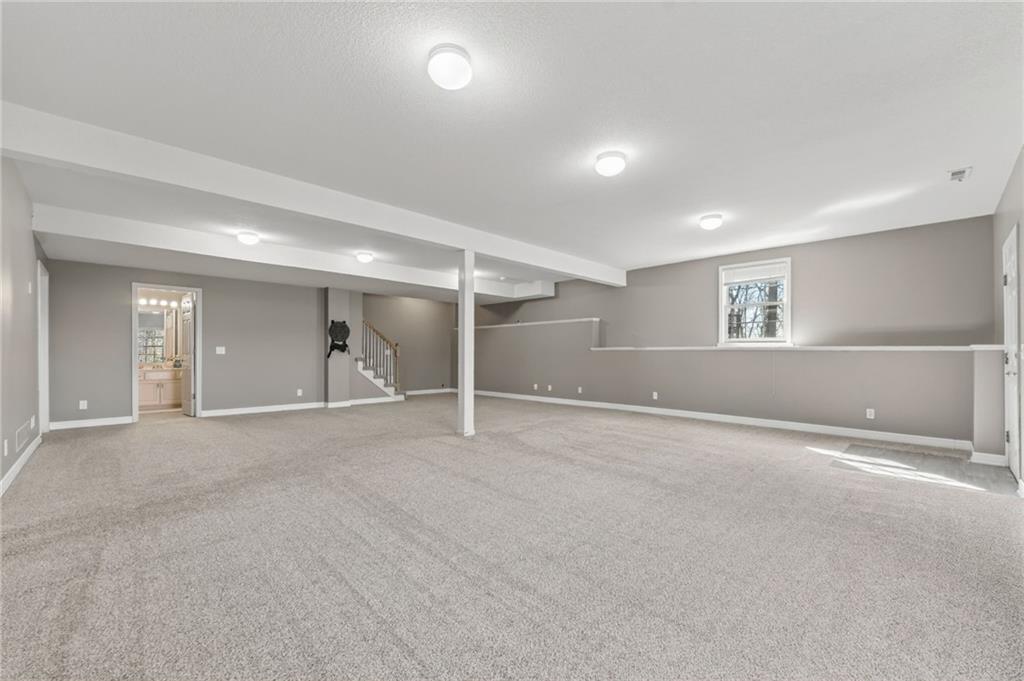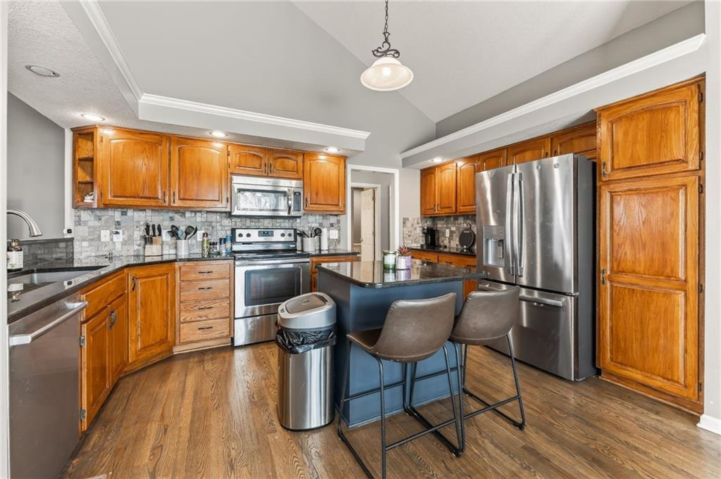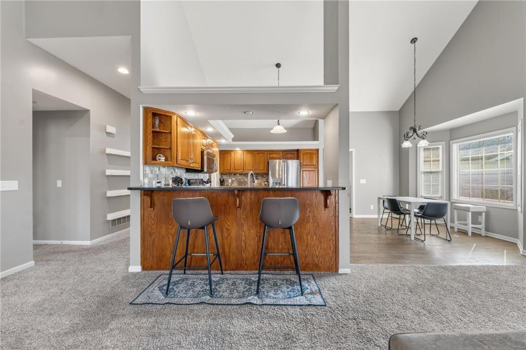 Welcome to this beautifully updated home nestled in a prime Platte City location! Designed with an open-concept layout, this home offers the perfect blend of comfort and functionality, ideal for both everyday living and entertaining! Enjoy newer interior paint and carpet throughout, along with newly refinished hardwood floors in the kitchen and entryway that adds warmth and charm. The kitchen is a standout, featuring granite countertops, custom wood cabinetry, and abundant counter space and storage. The main-level primary suite offers a relaxing retreat with vaulted ceilings, a spacious walk-in closet, and a large en suite bathroom complete with a double vanity. Two additional generously sized bedrooms —one on the main level and one in the lower level—both include large closets for ample storage. The fully finished walk-out basement provides a massive living area, perfect for hosting gatherings or creating additional living space. Step outside to a large deck overlooking a private, tree-lined yard—ideal for enjoying peaceful mornings or evening get-togethers. Located in a maintenance-provided community on a quiet cul-de-sac, this home also offers a fantastic location with highly regarded schools. This one truly has it all!