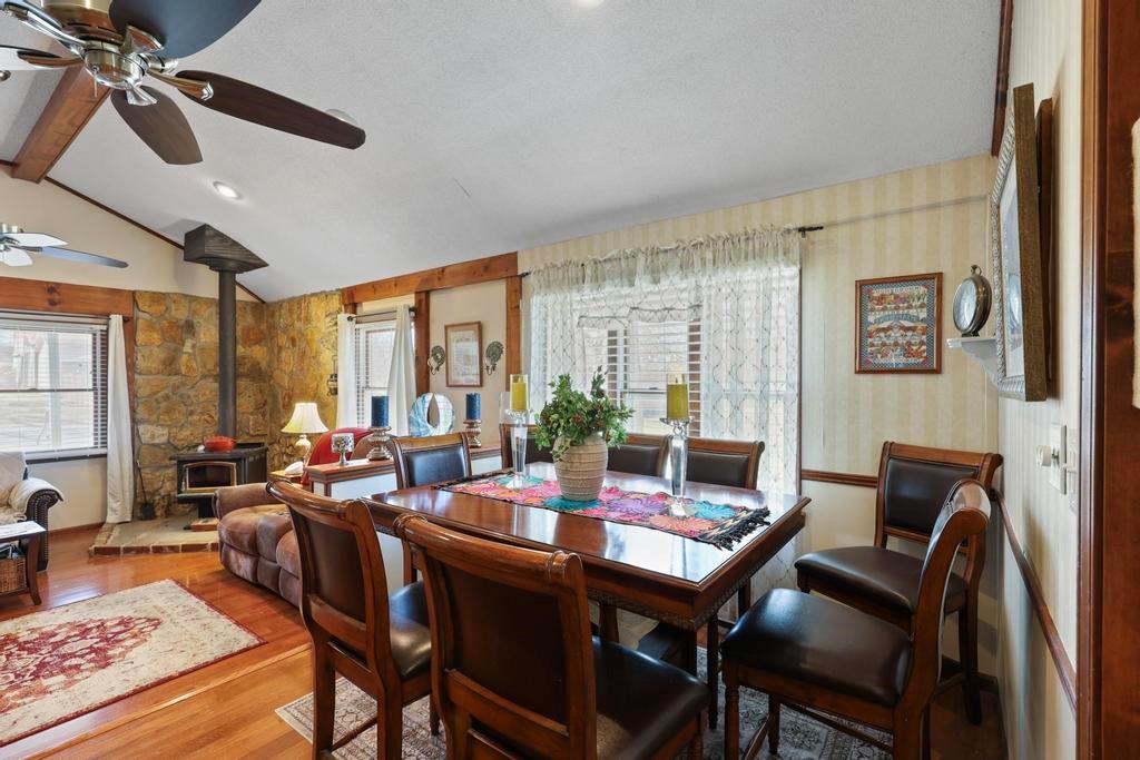 Escape to your own slice of the countryside with this charming 2 bed, 2 bath home nestled on 5.3 acres right outside of town on blacktop! Full of character and warmth, this property offers the perfect blend of comfort, space, and indoor-outdoor living. Step inside to find a cozy and inviting interior with timeless charm and nice flow. The living room has large windows and beautiful hardwood floors. The updated kitchen features shaker style cabinetry, solid surface countertops, and stainless appliances, as well as a cute center island. The dining room and den are spacious and inviting, showcasing wooden beams, a vaulted ceiling, a wood stove with a stone surround, and French doors overlooking the expansive yard to the back of the property. While outside, you’re sure to fall in love with everything this property has to offer. Enjoy quiet evenings relaxing on the well-appointed covered patio, spend summer days relaxing in the above-ground pool complete with a spacious surrounding deck, host gatherings that seamlessly transition from inside to outside, or take advantage of the small acreage which provides endless opportunities! Featuring ample gardening space for your green thumb, ground to farmstead or raise some animals, or just some room to roam your own property, these 5.3 acres offer options and privacy! With a 2-car detached garage, plus a small barn, and a garden shed, there is no shortage of room for all your tools, toys, or hobbies. Whether you’re looking for a quiet retreat, a hobby farm, or just more space to spread out, this property has it all. Don’t miss your chance to own this unique piece of country living!