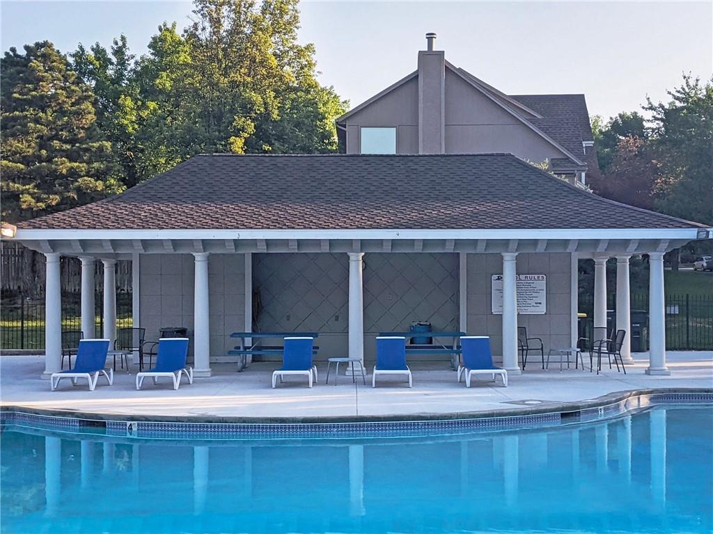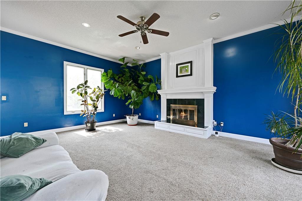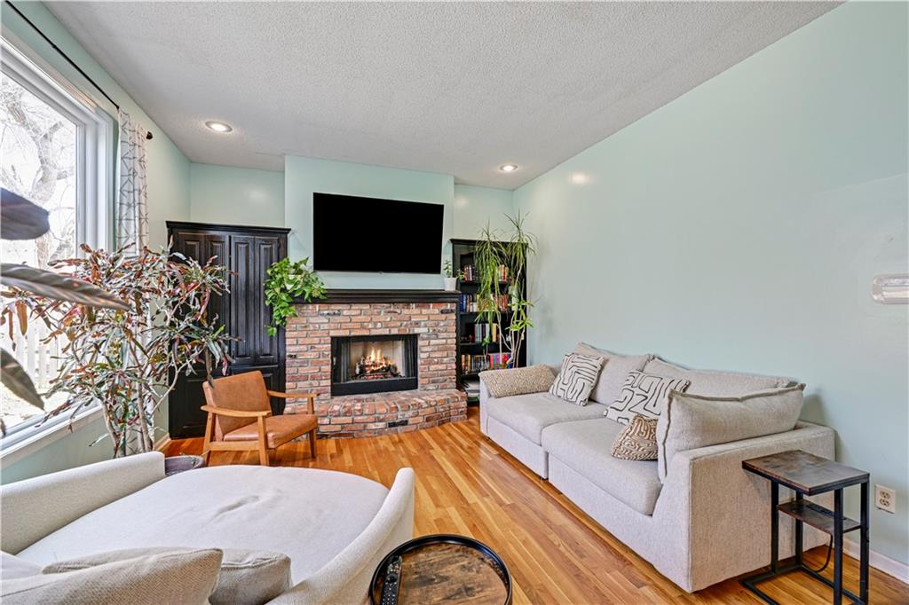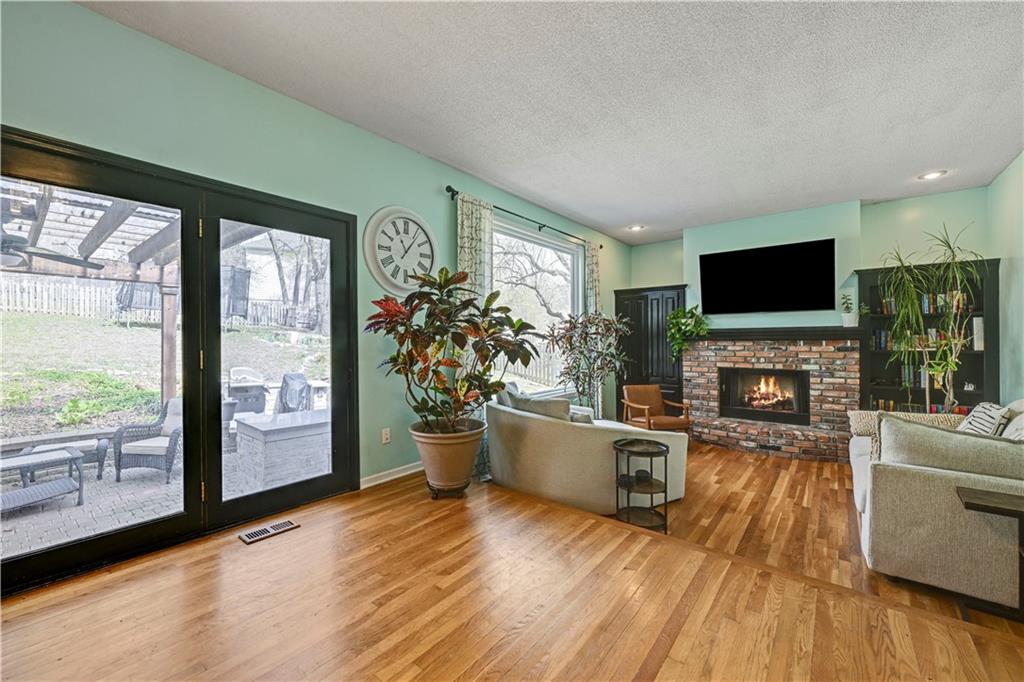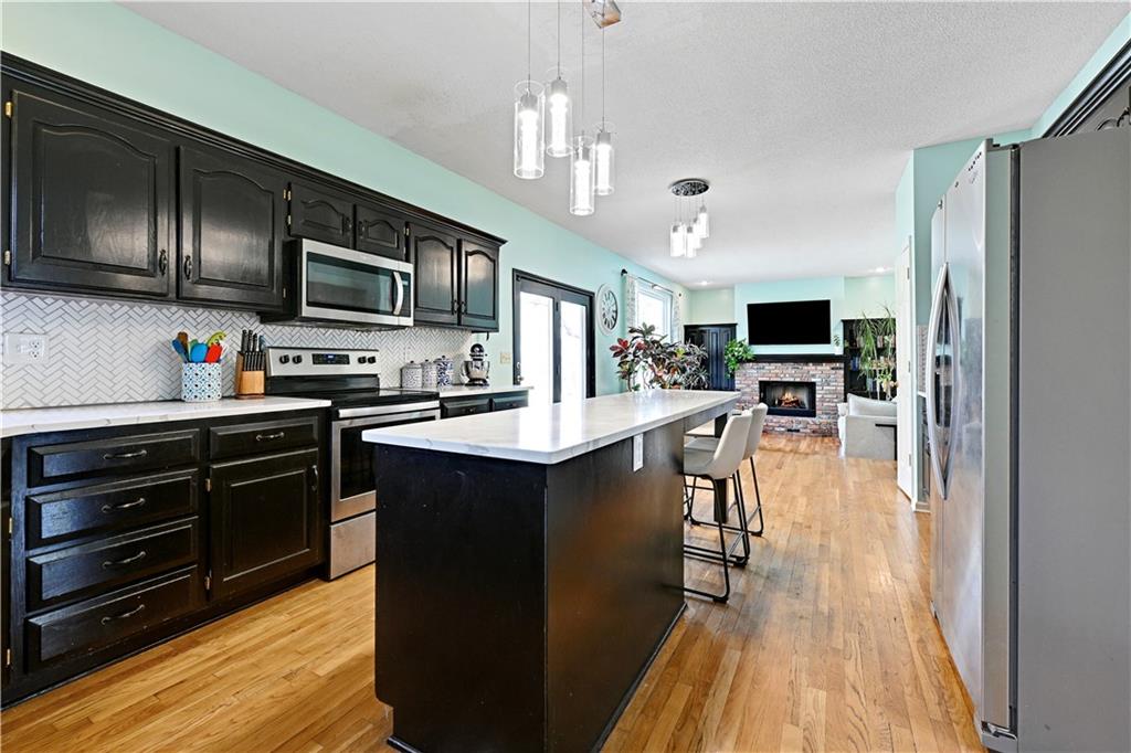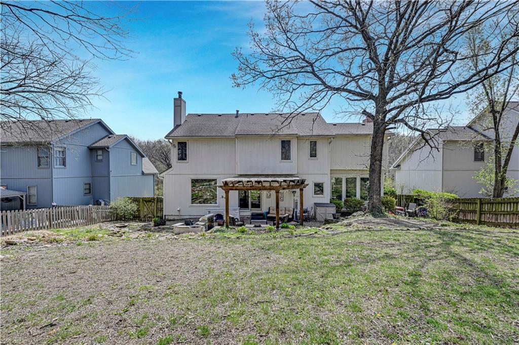 This spacious 4 bedroom, 3.1 bath home in Lenexa is ready for its next owner! Upon entry, you are welcomed by hardwood floors, a formal dining room, and a striking staircase that sets the tone for the space throughout. Just off the entry, the large front living room offers soaring ceilings, abundant natural light, and a beautiful fireplace with dramatic molding detail. Head into the kitchen and hearth room, where you will find painted cabinetry, quartz countertops, updated backsplash, stainless steel appliances, a large island with seating, and a second fireplace that creates a warm and inviting gathering space. The main level also features a half bath and easy access to the covered patio and backyard. Upstairs, the home offers generous bedroom space, including a spacious primary suite and well-sized secondary bedrooms. Head to the finished lower level for even more room to spread out, complete with a large rec room, kitchenette/bar area, full bath, and flexible space for movies, games, workouts, guests, or hobbies. Enjoy the outdoors from the covered paver patio overlooking the fenced backyard with mature trees and plenty of room to relax or entertain. Other features you will love include the distinctive front elevation, multiple living areas, hardwood floors through much of the main level, and a layout that offers both everyday comfort and great entertaining space.