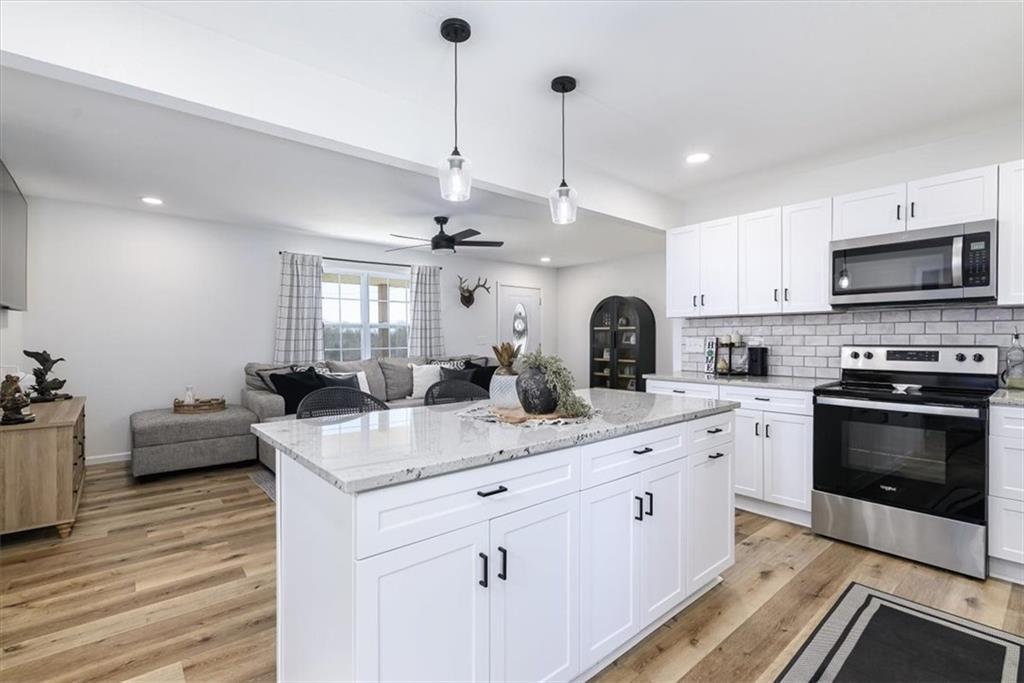 WOW.. this one is a stunner! Right north of Leavenworth on a paved road you will find this STUNNING newly remodeled from TOP to BOTTOM. This 3 bed 2 bath home sits in the Easton School District on a gorgeous 1.5 acre piece of countryside! Step Inside where you will find an open floor plan offering tons of natural light with beautiful finishes to include luxury vinyl plank flooring throughout, granite countertops, eye catching white cabinets and stunning island in the kitchen. Enjoy the oversized master suite with an attached master bathroom and walk-in closet. 2 generous sized additional bedrooms offer additional space for the kids or a guest room for hosting. Downstairs you will find a blank slate to add additional living space.. the options are ENDLESS. Come outside to where you be greeted with a large concrete patio for grilling and hosting events and a 40x30 shop with two garage doors for all your storage and working needs! Total remodel was completed in 2024, HVAC, ROOF, SEPTIC are all new in 2024 and shop and additional driveway were added in 2024. This home offers all the new build perks without the price tag of a new home! You are going to want to come visit this home today and see what living in the country feels like, just in time for the summer!