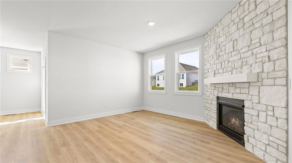 Arlington by D.R. Horton, backs to greenspace this home offers the convenience of main level living with the bonus of a finished inground basement(a recreational room, 4th bedroom perfect for guests or a home office, a full bathroom, and unfinished storage/mechanical space). The open-concept design includes a kitchen with an island, walk-in pantry, 36" cabinets with crown molding, quartz countertops, ceramic tile backsplash, large undermount sink, and Whirlpool stainless steel appliances including a gas range. The owner's retreat includes walk-in closet and en-suite bath. Featuring a tiled shower, "raised height" vanity with a quartz top, double bowls, and Moen® matte black fixtures throughout. 9' ceilings on both levels, a cozy stone fireplace, modern style baseboards and trim. Double wall exterior construction using durable James Hardie Siding features a 15-year color match guarantee makes this home maintenance friendly. Landscaped and sodded yards with irrigation, and a covered back deck provides ideal space for outdoor relaxation or entertaining. A 3-car garage with 10-ft ceilings provides abundant parking and storage. This home is built with quality craftsmanship and a suite of included luxury and smart home features that keep you connected including Wi-Fi Garage Door Openers, Deako Smart Switches, and a video doorbell. This home is backed by D.R. Horton's 1-2-10-year warranty offering exceptional values in the Dayton Creek Community. Spring Hill amenities include Golf Course, Aquatic Center, and Spring Hill School District holds a B+ grade on Niche.com. Don’t forget about Hillsdale Lake! Move-In ready homes available. Square feet and Taxes are estimated. Visit daytoncreek.com to see available lots and floor plans. Don’t forget to ask about our current incentives that can add even more value to these homes. Photos, renderings, and Virtual Walkthrough's maybe of a different home but on the same floor plan to show finish quality only.
