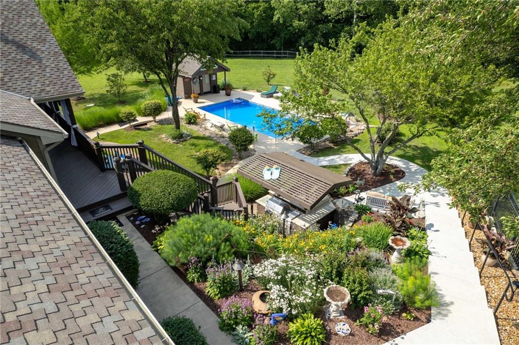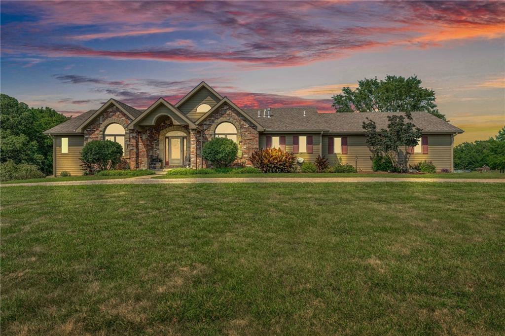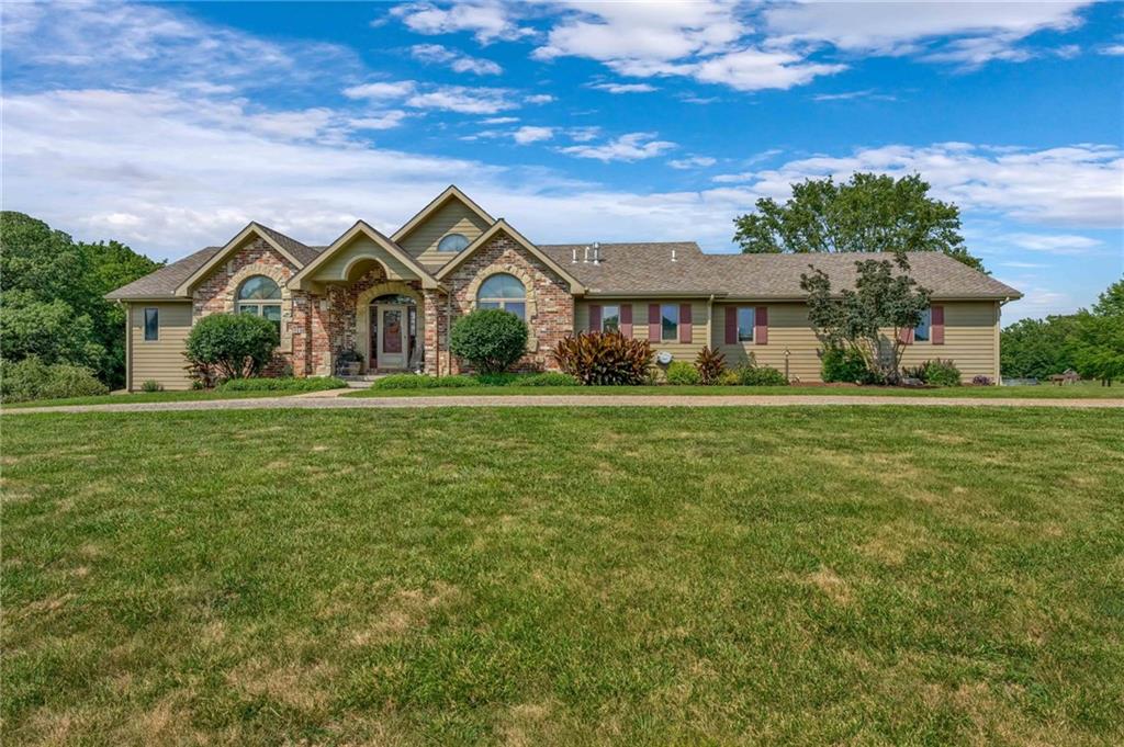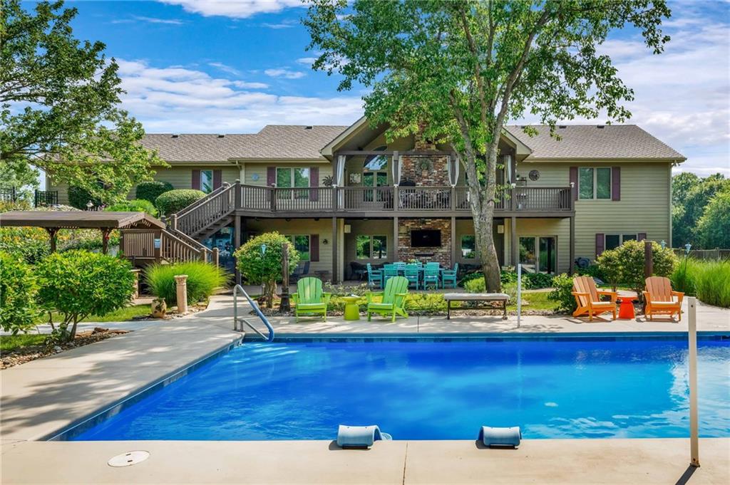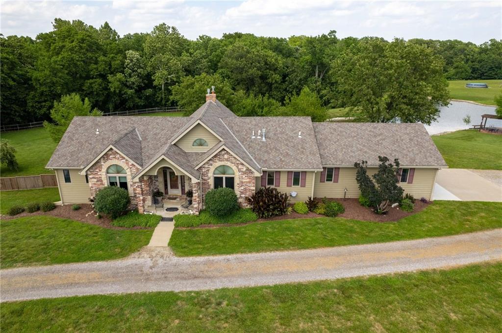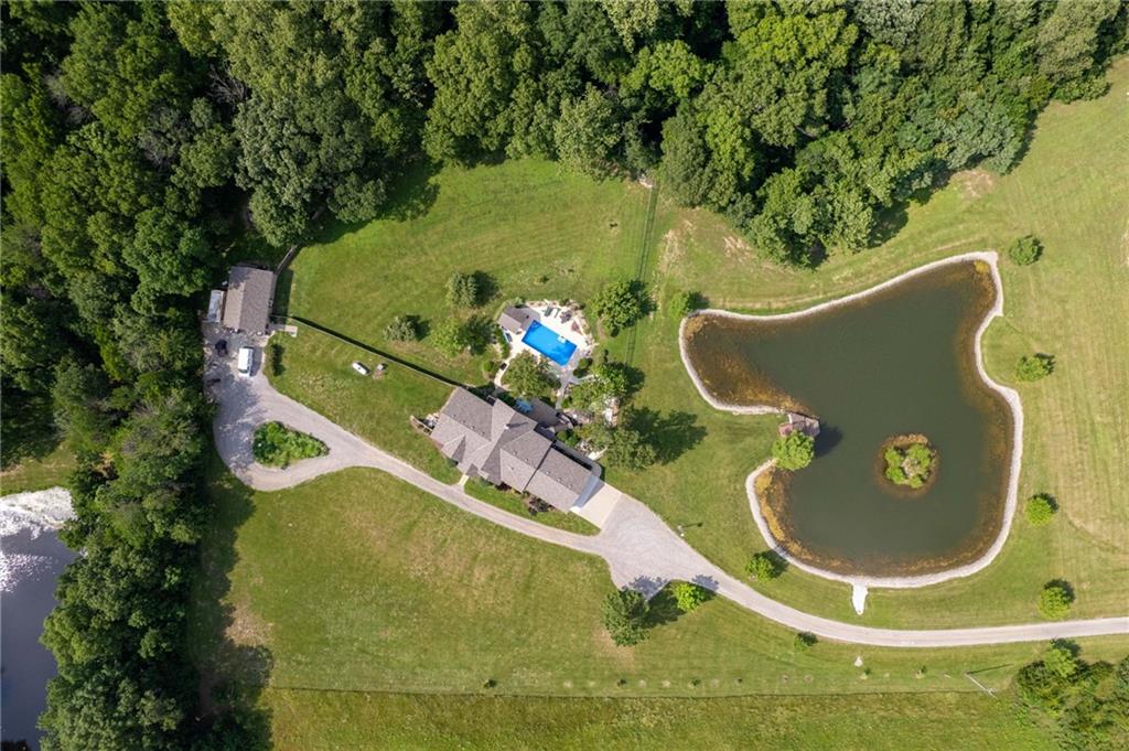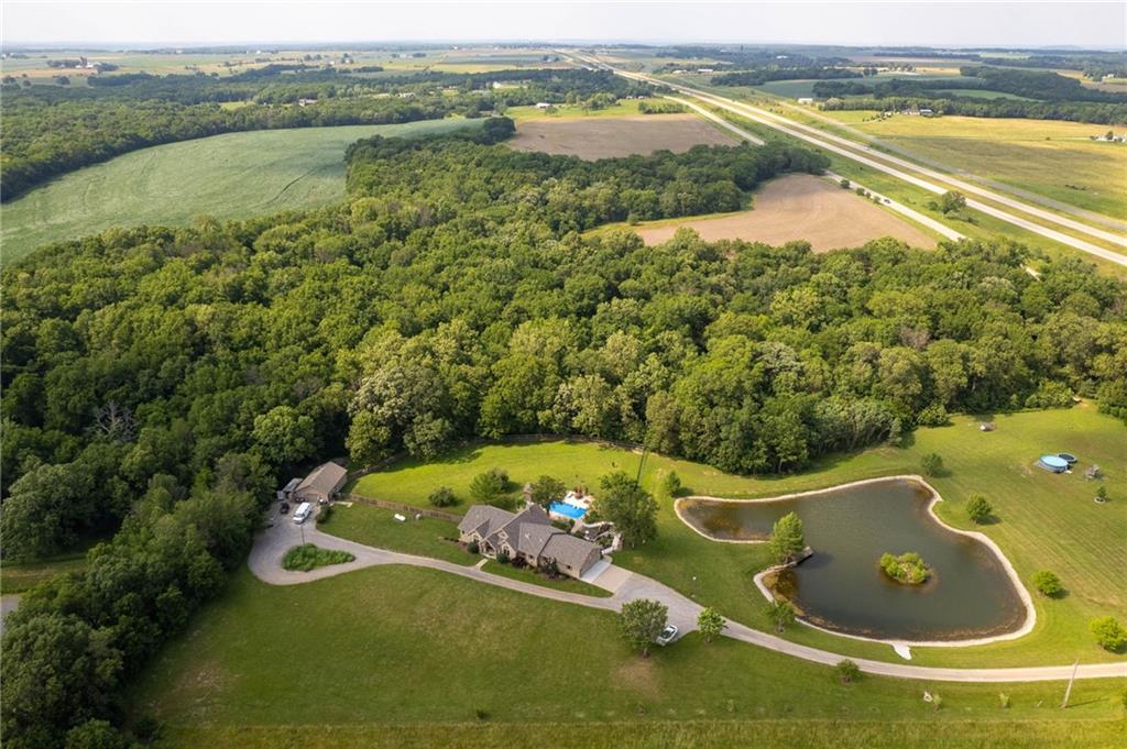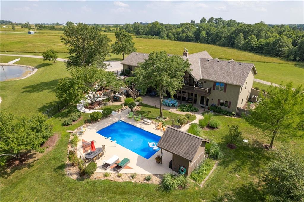 Enjoy peaceful country living just 10 minutes from Lawrence on 5+ acres with hard surface road access. This meticulously maintained one-owner home features soaring ceilings, new quartz countertops, an updated primary bathroom with a jacuzzi tub, and a nearly new HVAC system. Convenient main-level living, with a primary suite, office, kitchen, dining, living, laundry, mudroom and two additional bathrooms on the main. The walk-out basement offers additional living space with two oversized bedrooms, each with its own private bathroom, a wet bar, cozy wood-burning stove and rec room. Outdoor amenities extend the living space and include a large covered deck, covered patio, in-ground swimming pool complete with all the toys, bathroom, cabana bar with grill, stocked pond, and a 28' x 36' shop that could be used as a 3rd car garage. The property also features low-maintenance landscaping and one acre of the property fully fenced A rare opportunity to enjoy space, privacy, and convenience just minutes from town!!