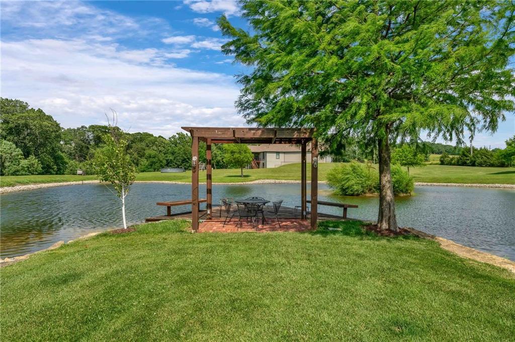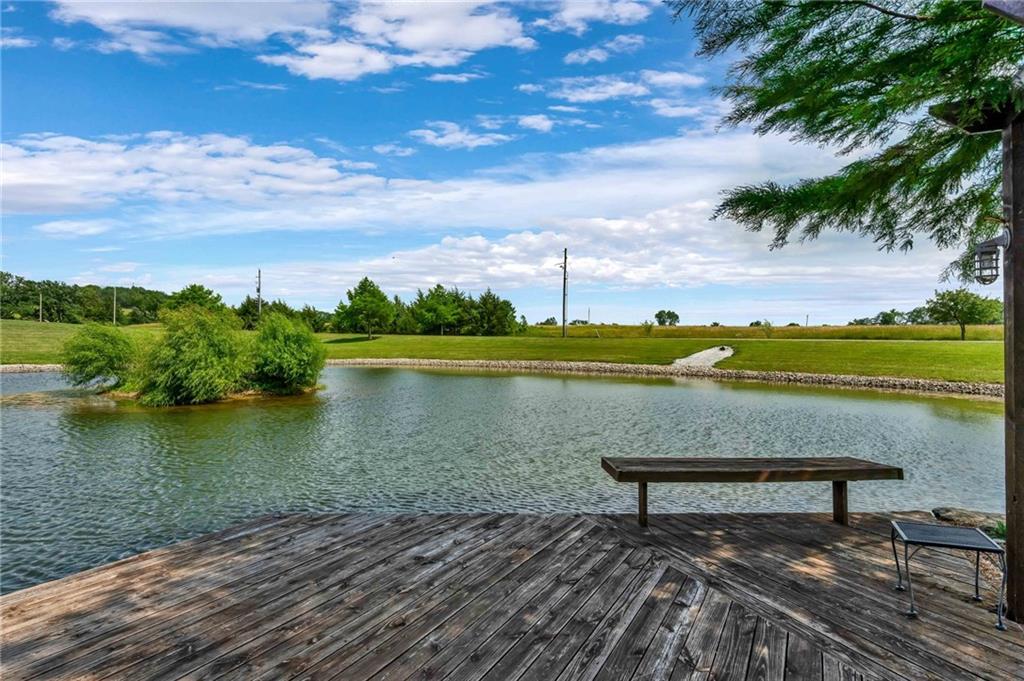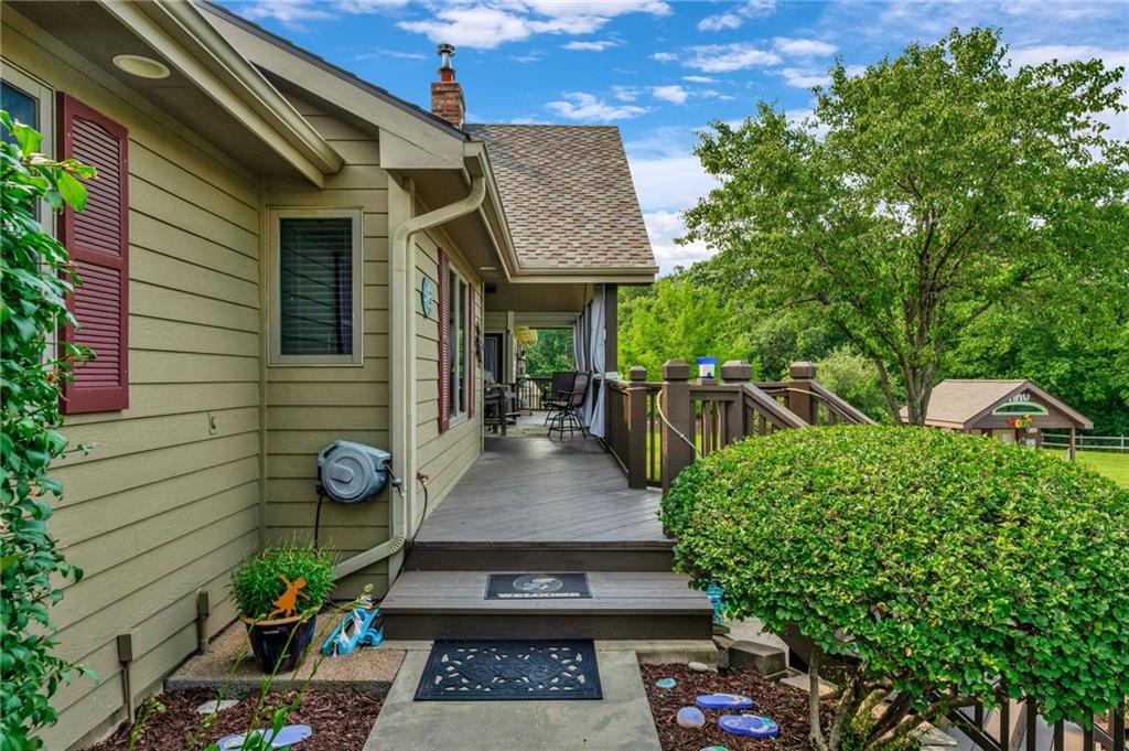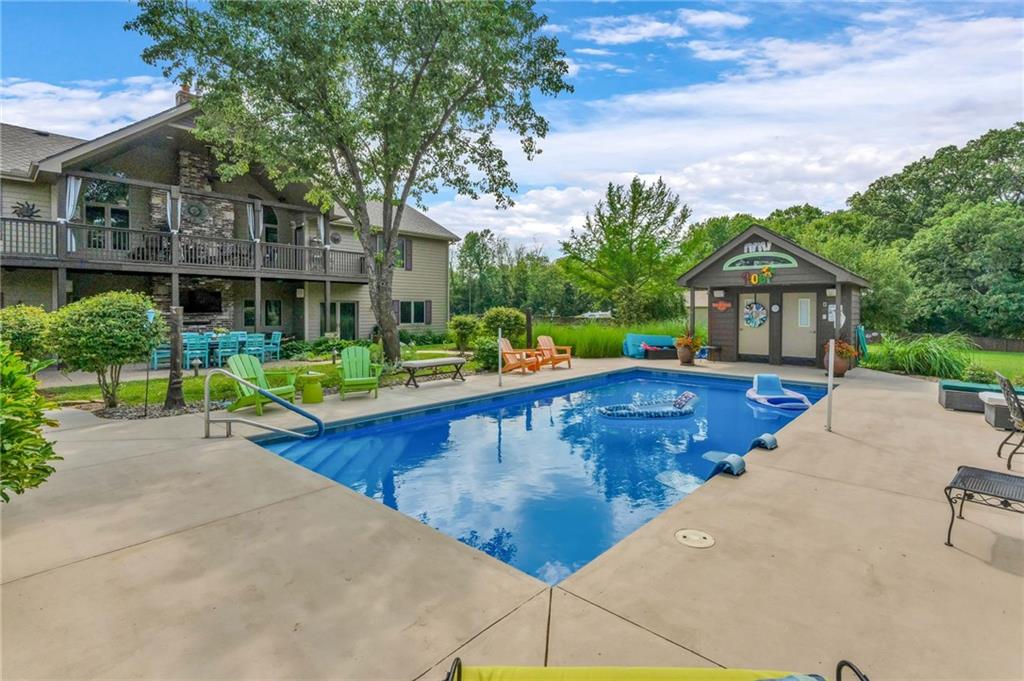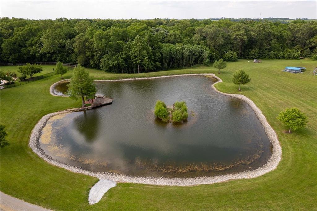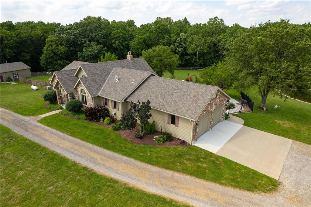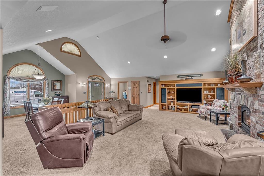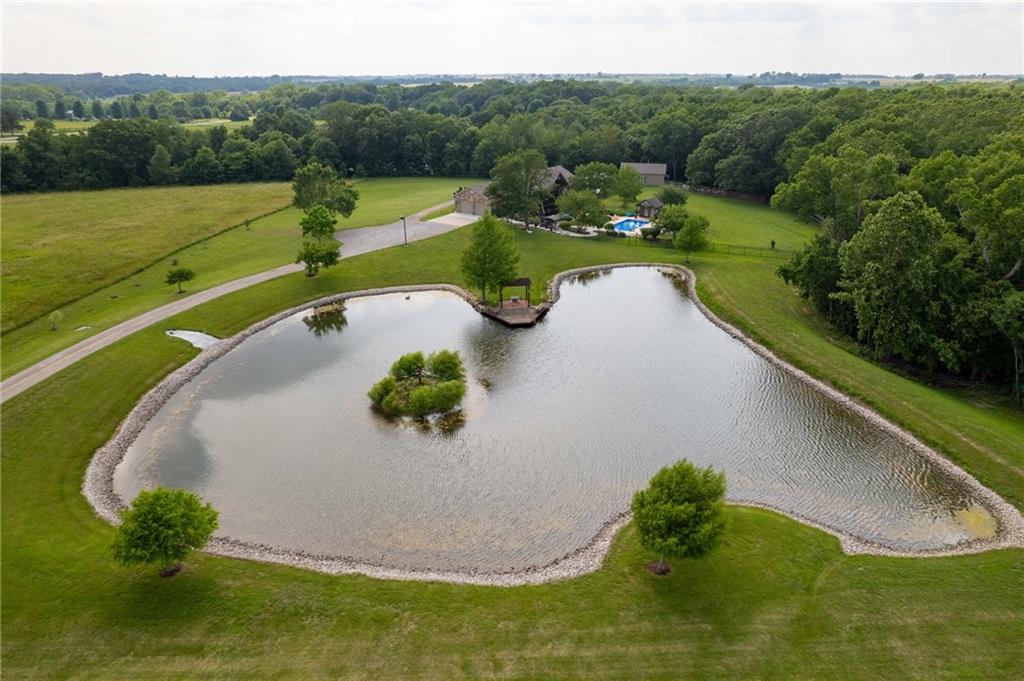 Enjoy peaceful country living just 10 minutes from Lawrence on 5+ acres with hard surface road access. This meticulously maintained one-owner home features soaring ceilings, new quartz countertops, an updated primary bathroom with a jacuzzi tub, and a nearly new HVAC system. Convenient main-level living, with a primary suite, office, kitchen, dining, living, laundry, mudroom and two additional bathrooms on the main. The walk-out basement offers additional living space with two oversized bedrooms, each with its own private bathroom, a wet bar, cozy wood-burning stove and rec room. Outdoor amenities extend the living space and include a large covered deck, covered patio, in-ground swimming pool complete with all the toys, bathroom, cabana bar with grill, stocked pond, and a 28' x 36' shop that could be used as a 3rd car garage. The property also features low-maintenance landscaping and one acre of the property fully fenced A rare opportunity to enjoy space, privacy, and convenience just minutes from town!!