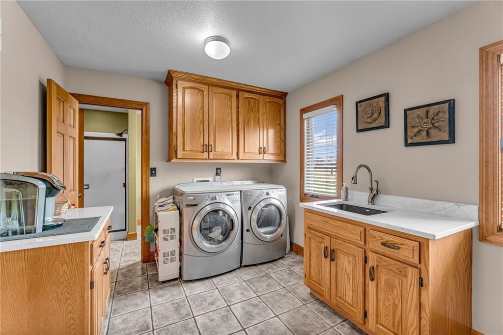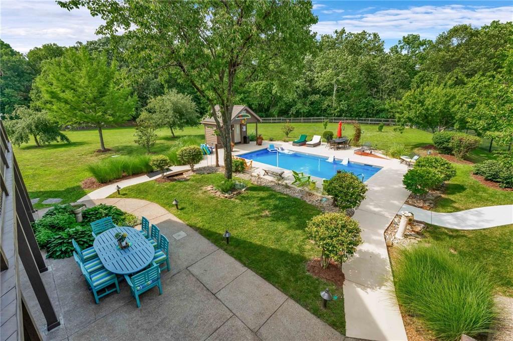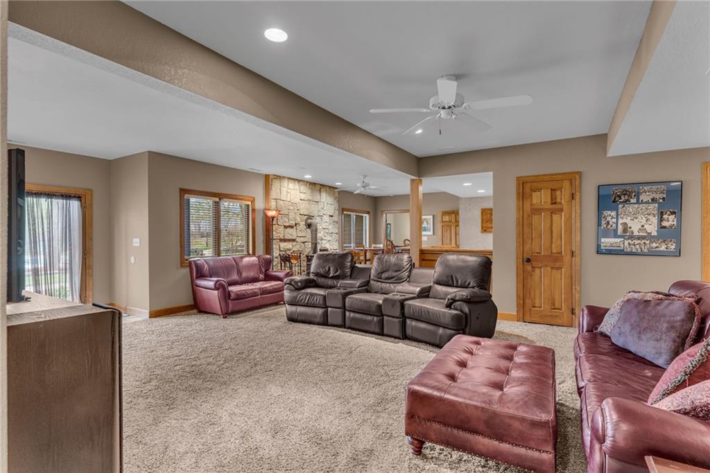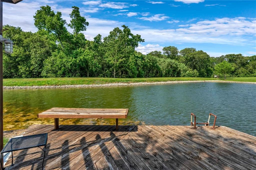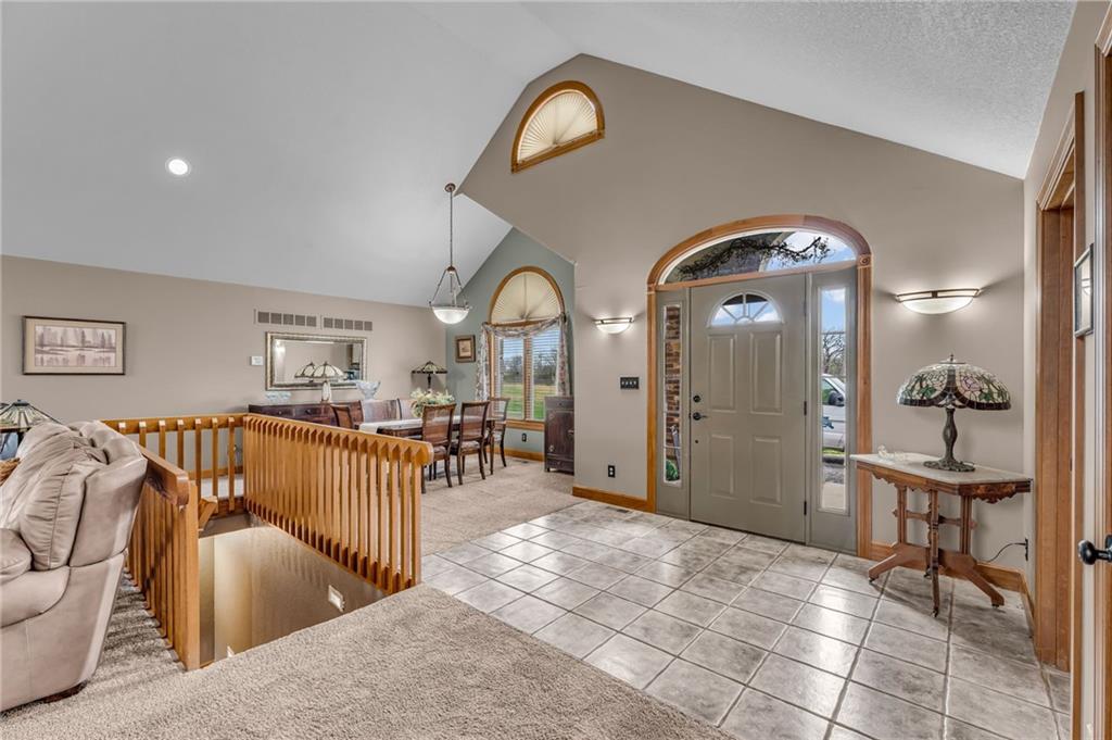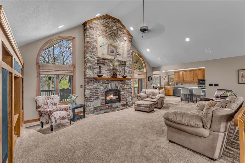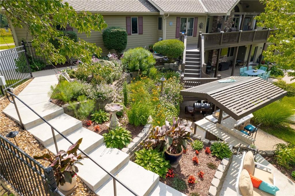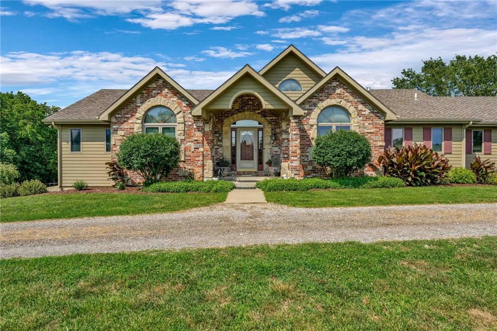 Enjoy peaceful country living just 10 minutes from Lawrence on 5+ acres with hard surface road access. This meticulously maintained one-owner home features soaring ceilings, new quartz countertops, an updated primary bathroom with a jacuzzi tub, and a nearly new HVAC system. Convenient main-level living, with a primary suite, office, kitchen, dining, living, laundry, mudroom and two additional bathrooms on the main. The walk-out basement offers additional living space with two oversized bedrooms, each with its own private bathroom, a wet bar, cozy wood-burning stove and rec room. Outdoor amenities extend the living space and include a large covered deck, covered patio, in-ground swimming pool complete with all the toys, bathroom, cabana bar with grill, stocked pond, and a 28' x 36' shop that could be used as a 3rd car garage. The property also features low-maintenance landscaping and one acre of the property fully fenced A rare opportunity to enjoy space, privacy, and convenience just minutes from town!!