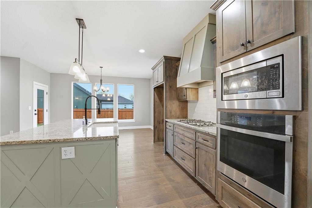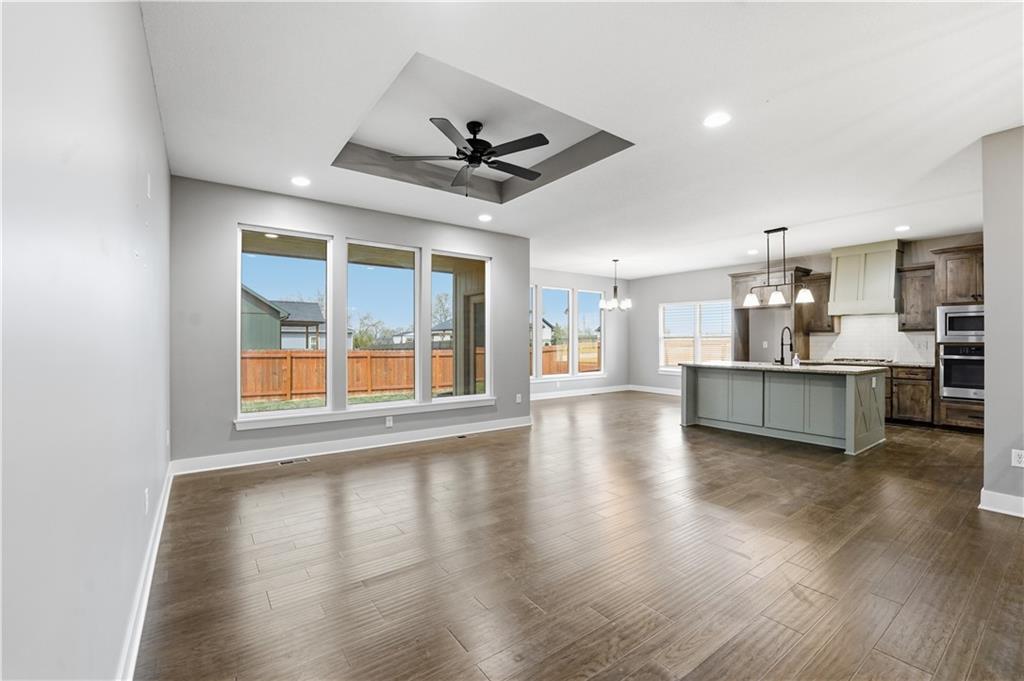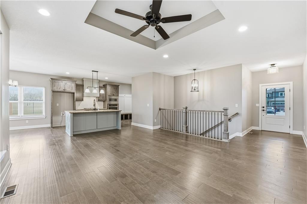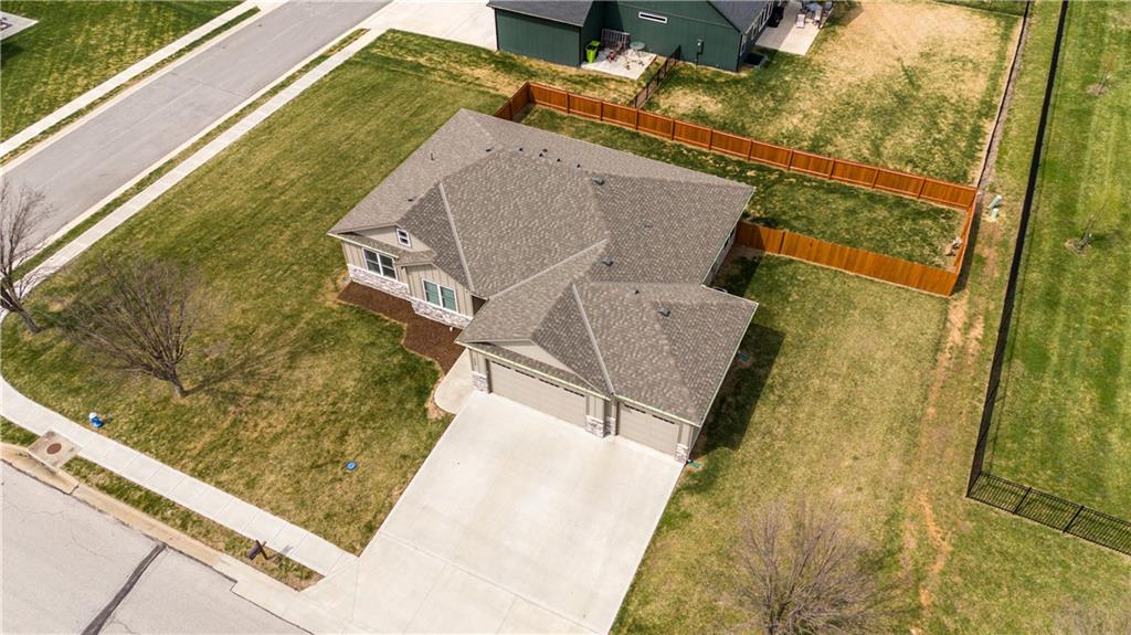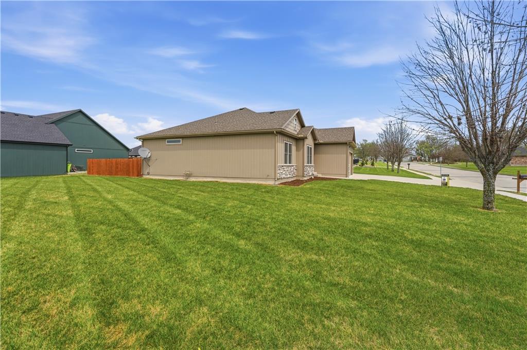 New construction ranch in Harrisonville’s premier neighborhood! This thoughtfully designed floor plan offers a country feel and sits on a large corner lot. Hardwood floors run throughout the kitchen, dining, living, hallways, and laundry room. The kitchen features a built-in oven and microwave, custom vent hood, large island with farmhouse sink, pull-out trash, soft-close cabinets, and bar seating. Walk-in pantry plus built-in shelving by the garage entry with bench, coat hooks, and shoe storage. Dining area includes floor-to-ceiling windows and access to covered patio. Living room offers 10’ ceilings with boxed detail and floor-to-ceiling windows for abundant natural light. Private primary suite features vaulted ceiling and patio access. Primary bathroom includes double vanities, walk-in shower, and large walk-in closet. Two additional bedrooms with ample closet space. Main-level laundry with linen storage. Ceiling fans in all bedrooms and living room. Oversized 3-car garage with openers. High-efficiency furnace and water heater, plus thermal tilt-in windows. Beautiful large yard with sidewalks along front and west side. Subdivision amenities include private lake and walking trails connecting to city park, lake, and golf course. A must see!