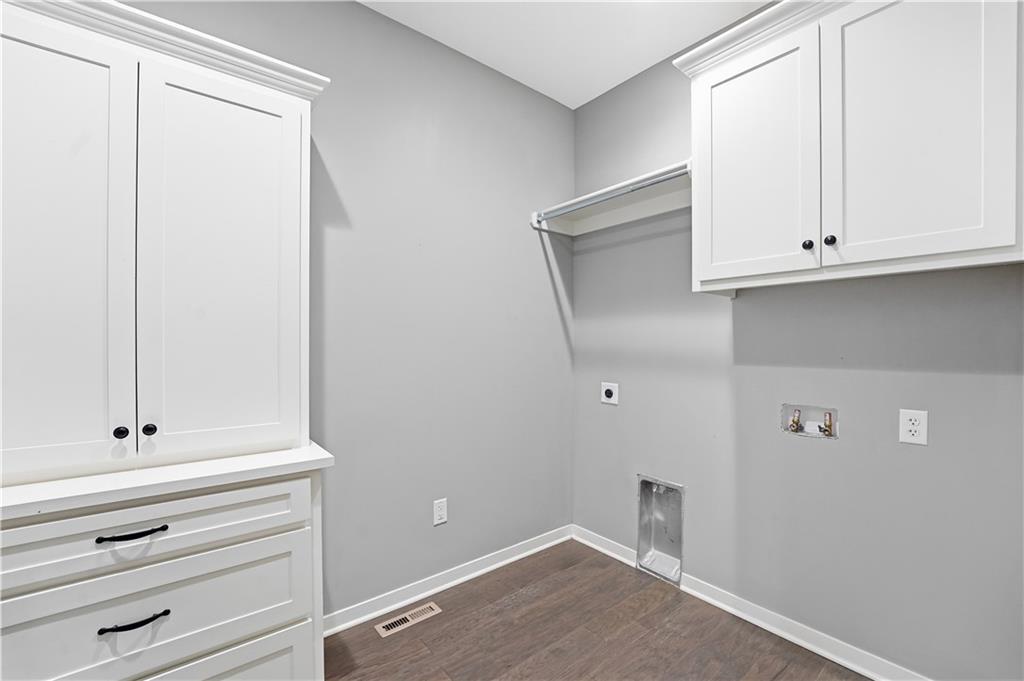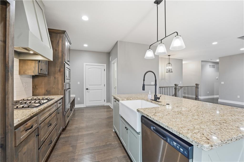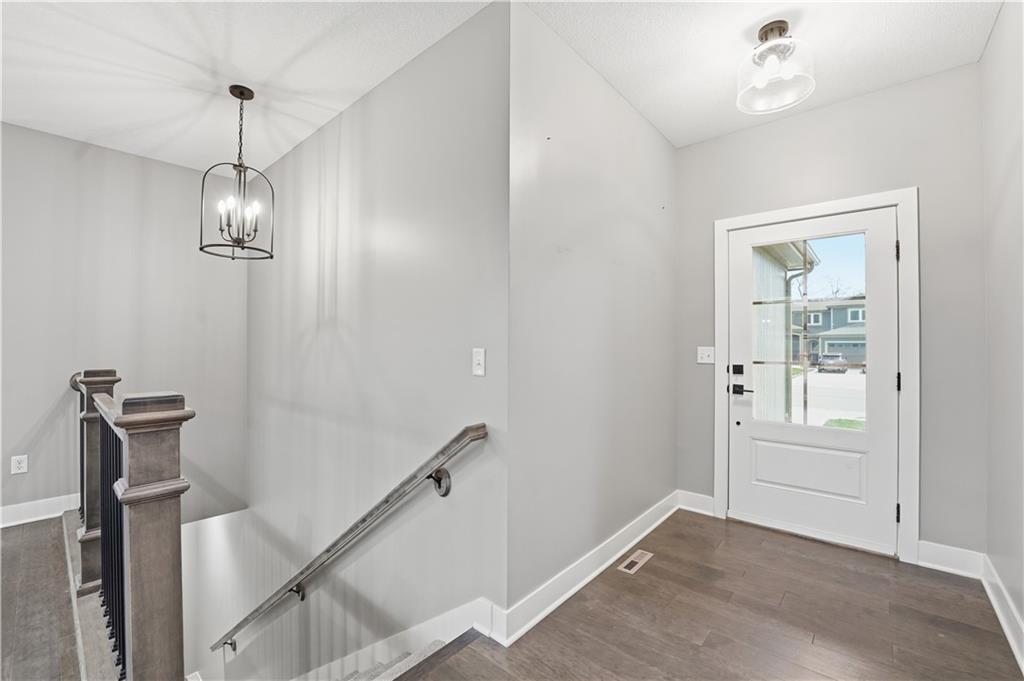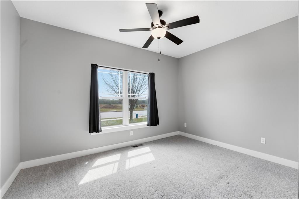 New construction ranch in Harrisonville’s premier neighborhood! This thoughtfully designed floor plan offers a country feel and sits on a large corner lot. Hardwood floors run throughout the kitchen, dining, living, hallways, and laundry room. The kitchen features a built-in oven and microwave, custom vent hood, large island with farmhouse sink, pull-out trash, soft-close cabinets, and bar seating. Walk-in pantry plus built-in shelving by the garage entry with bench, coat hooks, and shoe storage. Dining area includes floor-to-ceiling windows and access to covered patio. Living room offers 10’ ceilings with boxed detail and floor-to-ceiling windows for abundant natural light. Private primary suite features vaulted ceiling and patio access. Primary bathroom includes double vanities, walk-in shower, and large walk-in closet. Two additional bedrooms with ample closet space. Main-level laundry with linen storage. Ceiling fans in all bedrooms and living room. Oversized 3-car garage with openers. High-efficiency furnace and water heater, plus thermal tilt-in windows. Beautiful large yard with sidewalks along front and west side. Subdivision amenities include private lake and walking trails connecting to city park, lake, and golf course. A must see!