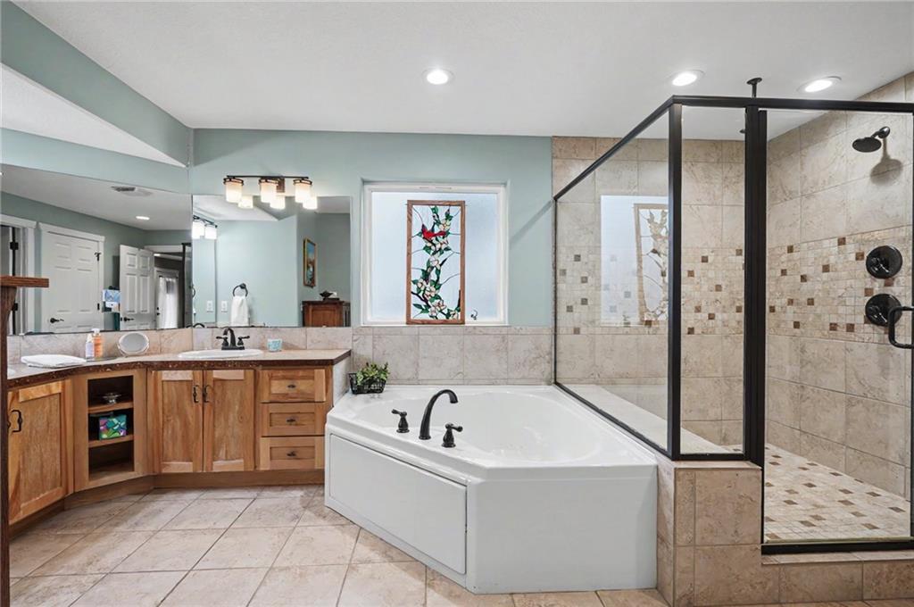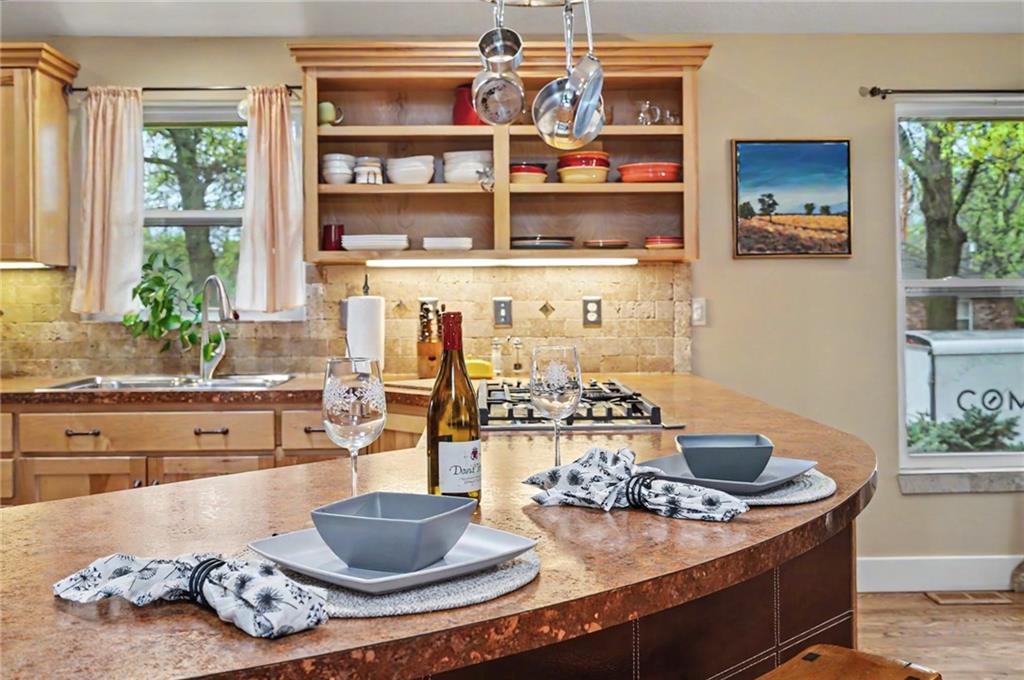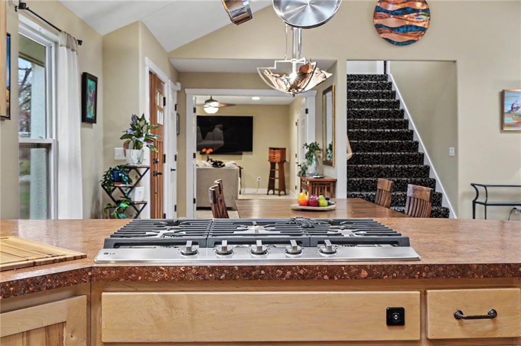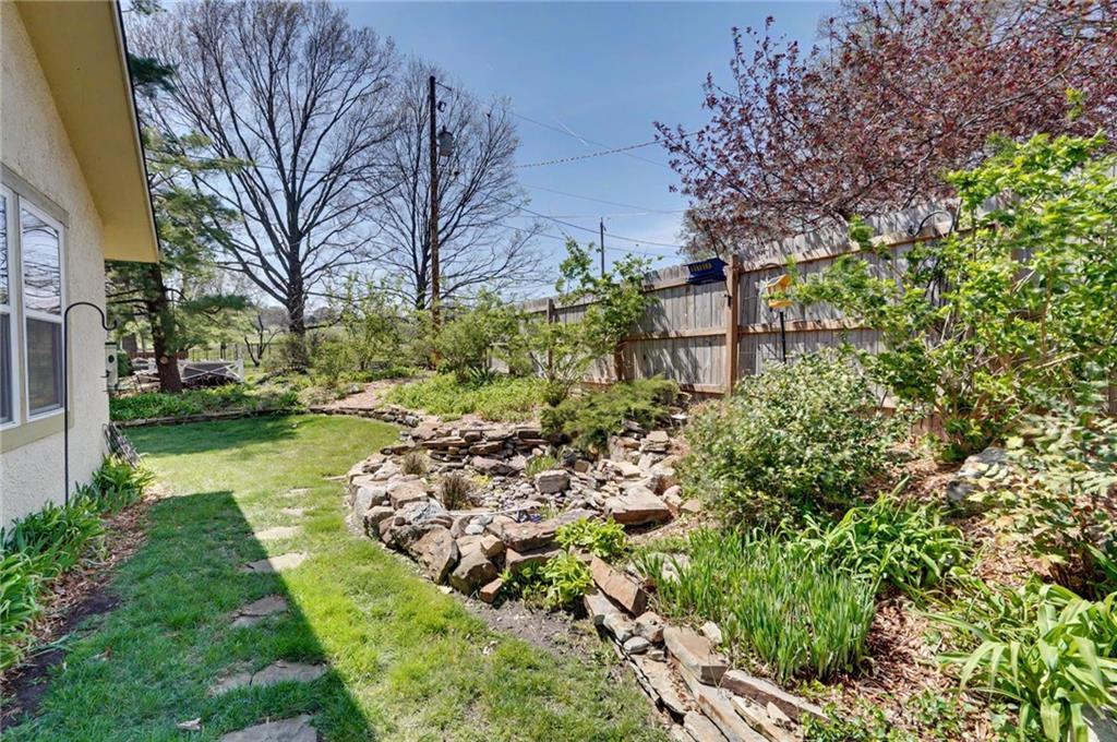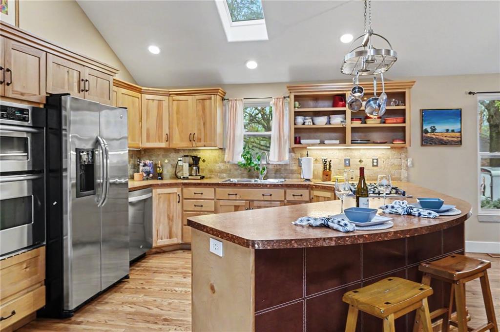 You will never see another home like this one. The sellers orchestrated a $130k remodel when they moved in. They removed the kitchen/living room ceiling and vaulted it up to the skylights. Main level primary bedroom is probably the largest in this price range with a backyard water feature right outside the window on SW corner going out to Lawrence Country Club golf course. 2BR on the main level and 2 upstairs. Basement is partially finished and used as a wine room with outside stairwell with plenty of space to finish off however you wish. Home sits on a corner lot with direct access to the backyard that is an oasis. Come check out this very unique home.