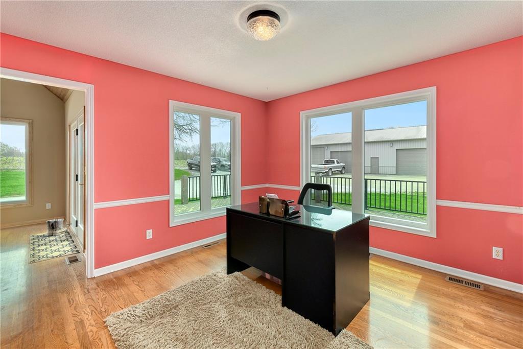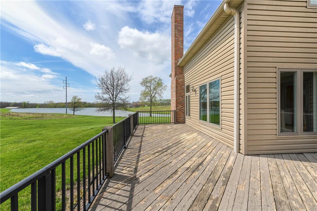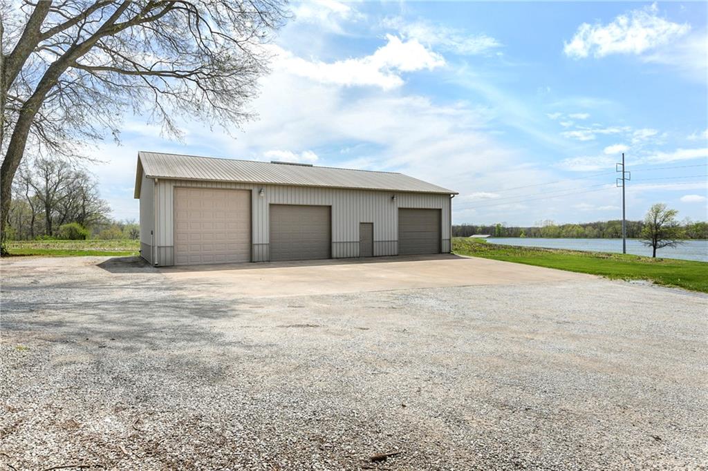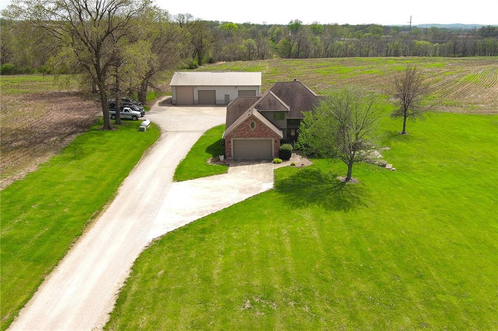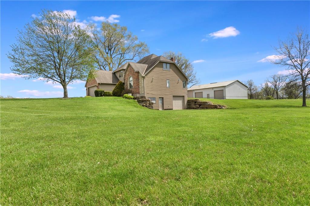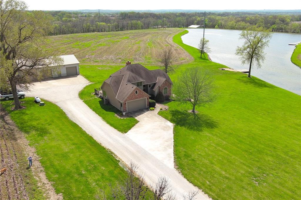 Escape to the peace of the countryside in this custom built home on 24 acres. A fully stocked pond with Bass, Crappies, Perch, Bluegill, and Catfish provides the perfect place to relax while watching the sun set. The entry opens to a large great room with heat circulating wood burning fireplace and 13' ceilings with beautiful crown moulding. There are two dining areas (one is currently being used as an office). The kitchen has many cabinets, pantry, island with cooktop, Granite countertops, tile backsplash, and wood floor. The primary suite is large and includes the following amenities - a double vanity, shower, whirlpool tub, linen closet, and walk-in closet. The two upstairs bedrooms are generous size with a shared bathroom. There is an office that could be converted into another bedroom/play area/craft room - the options are endless. There is a storage area above the garage off one of the bedrooms. The finished walk-out lower level has so much to offer with large family room, gym/exercise room (could be converted into a bedroom), full bath (with walk-in closet for guests), storage area (16.11x11.6), and 3rd car garage (14.3x11.2). The home was remodeled in 2008 with new vinyl siding, windows, roof, granite countertops, & refinished hardwood floors. The 60x40 outbuilding includes 100amp electrical service, insulated interior, concrete floor, water, radiant heat, pegboard/workbench, large overhead door for RV, & BONUS - 9,000 lb vehicle lift. There is a lean-to (40x12.6) on the back of the outbuilding. Located just a little under 10 minutes from I-70, this property offers the perfect balance of rural privacy and convenient access to town and Kansas City. Inspections welcome but selling "AS IS". The two gas tanks on the East side of the outbuilding are not staying.