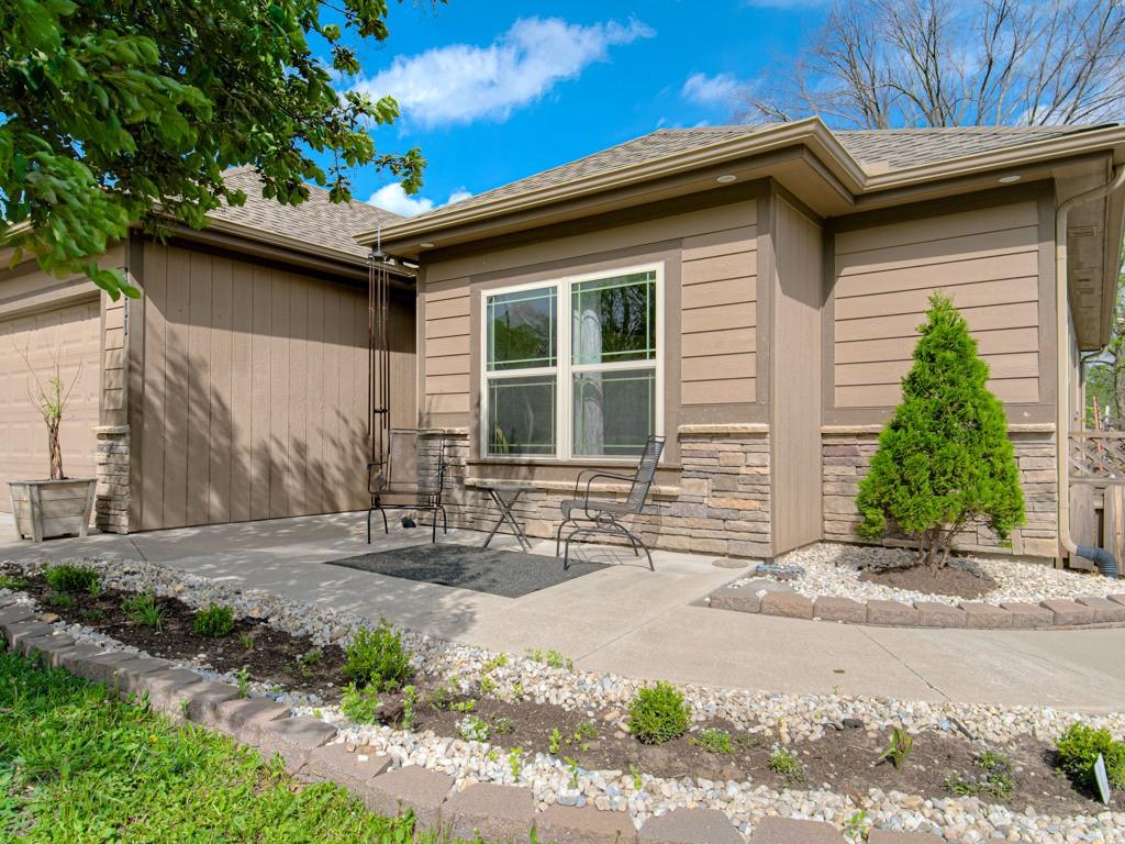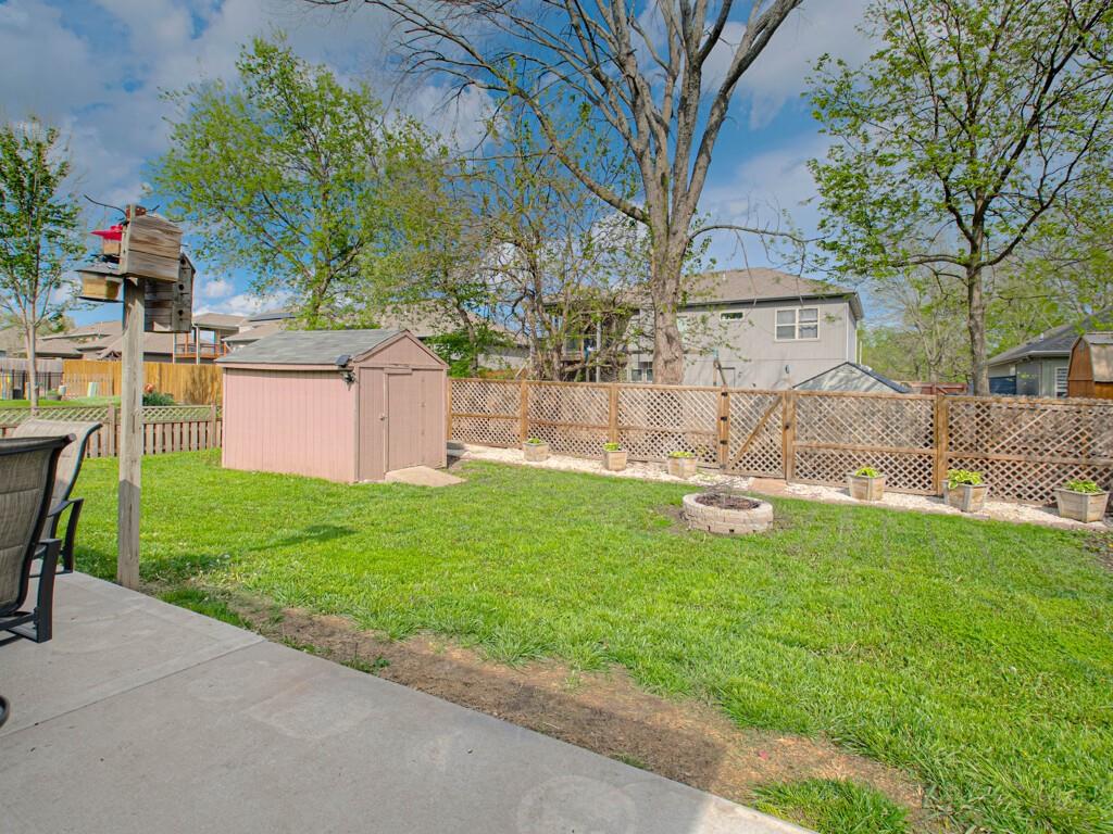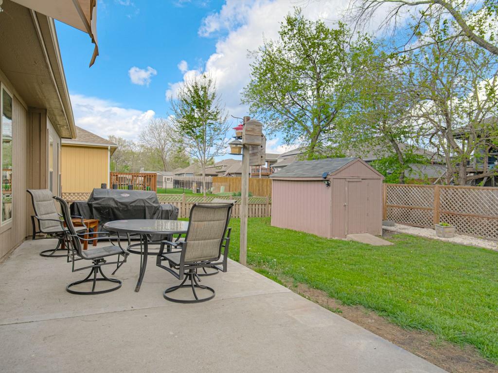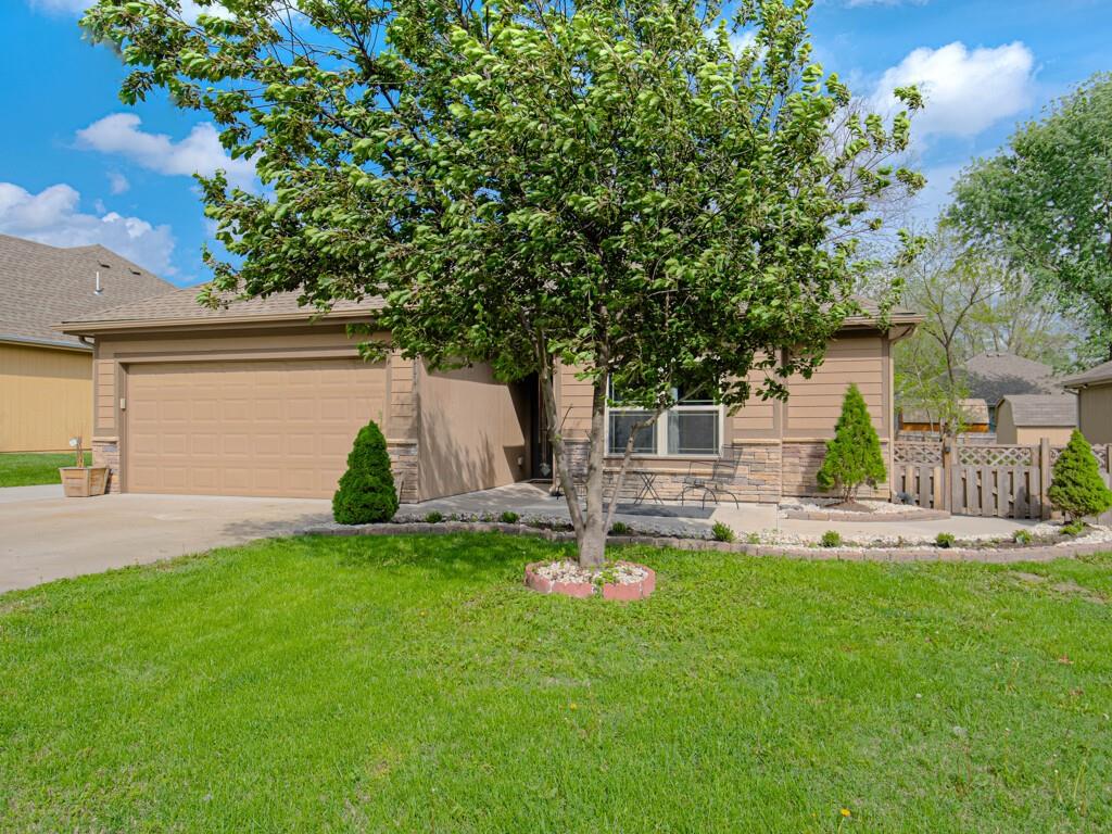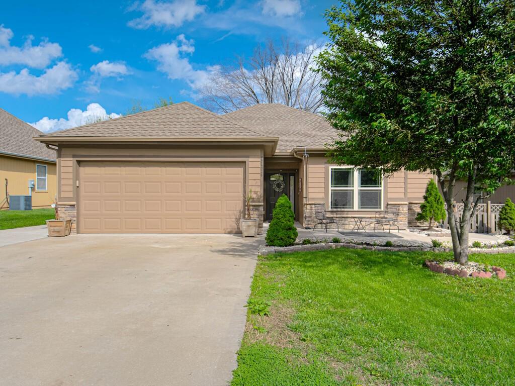 Beautiful true ranch home with an open, inviting layout. The spacious great room features a fireplace, ceiling fan, and abundant natural light. Ceramic tile flooring extends from the entry through the hallways, great room, kitchen, and both bathrooms. The kitchen offers granite countertops, a center island with breakfast bar, stainless steel appliances, and ceramic tile floors. Convenient main-floor laundry. The bedroom layout provides added privacy, with two secondary bedrooms on one side of the home and the primary suite on the other. The primary bedroom features a double-vault ceiling, ceiling fan, and a large walk-in closet. The primary bath includes a double vanity, jetted tub, and separate shower. Enjoy outdoor living with both a front patio and a large backyard patio. The backyard is fully enclosed with a wood privacy fence and includes a storage shed for extra space. Nicely landscaped yard in the front, back, and sides. Two-car attached garage with a three-car driveway.