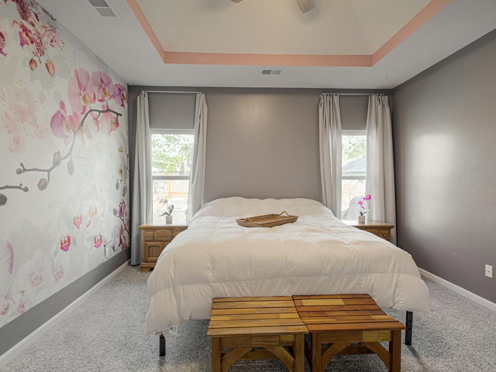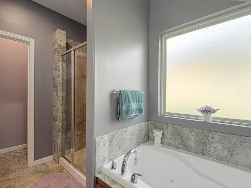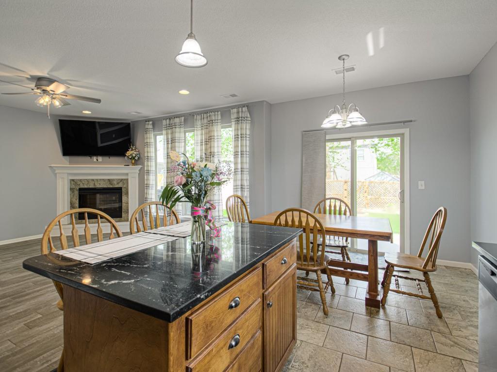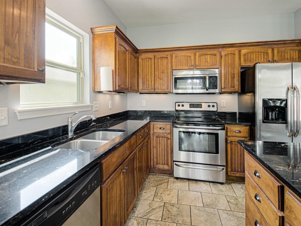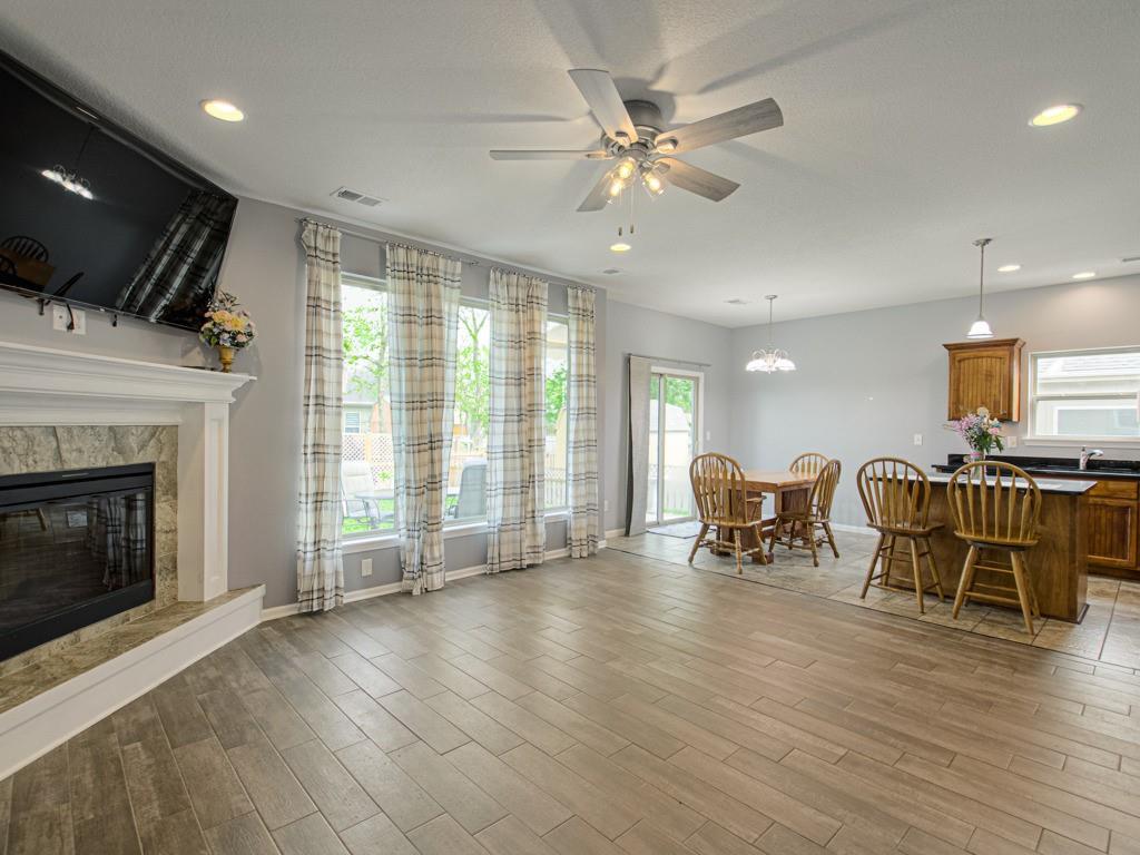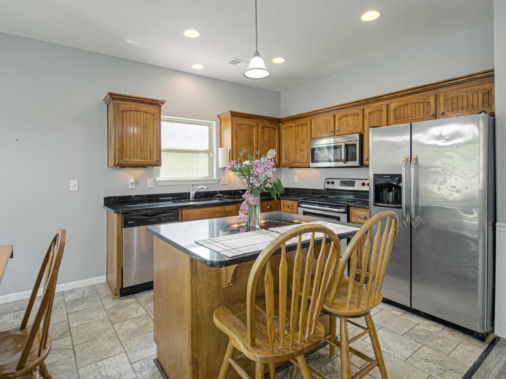Beautiful true ranch home with an open, inviting layout. The spacious great room features a fireplace, ceiling fan, and abundant natural light. Ceramic tile flooring extends from the entry through the hallways, great room, kitchen, and both bathrooms. The kitchen offers granite countertops, a center island with breakfast bar, stainless steel appliances, and ceramic tile floors. Convenient main-floor laundry. The bedroom layout provides added privacy, with two secondary bedrooms on one side of the home and the primary suite on the other. The primary bedroom features a double-vault ceiling, ceiling fan, and a large walk-in closet. The primary bath includes a double vanity, jetted tub, and separate shower. Enjoy outdoor living with both a front patio and a large backyard patio. The backyard is fully enclosed with a wood privacy fence and includes a storage shed for extra space. Nicely landscaped yard in the front, back, and sides. Two-car attached garage with a three-car driveway.