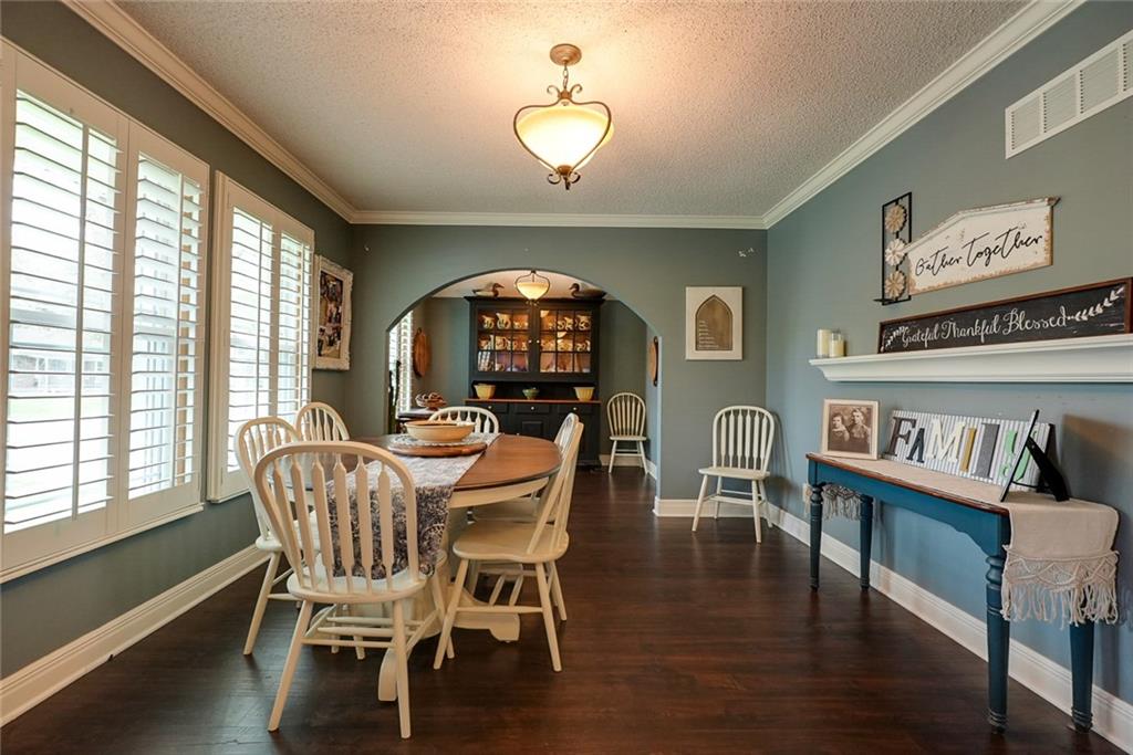 Dining space featuring rich wood-finish flooring, white crown molding, and plantation shutters