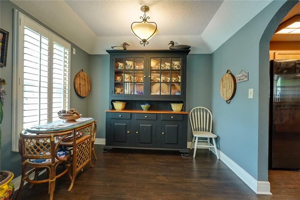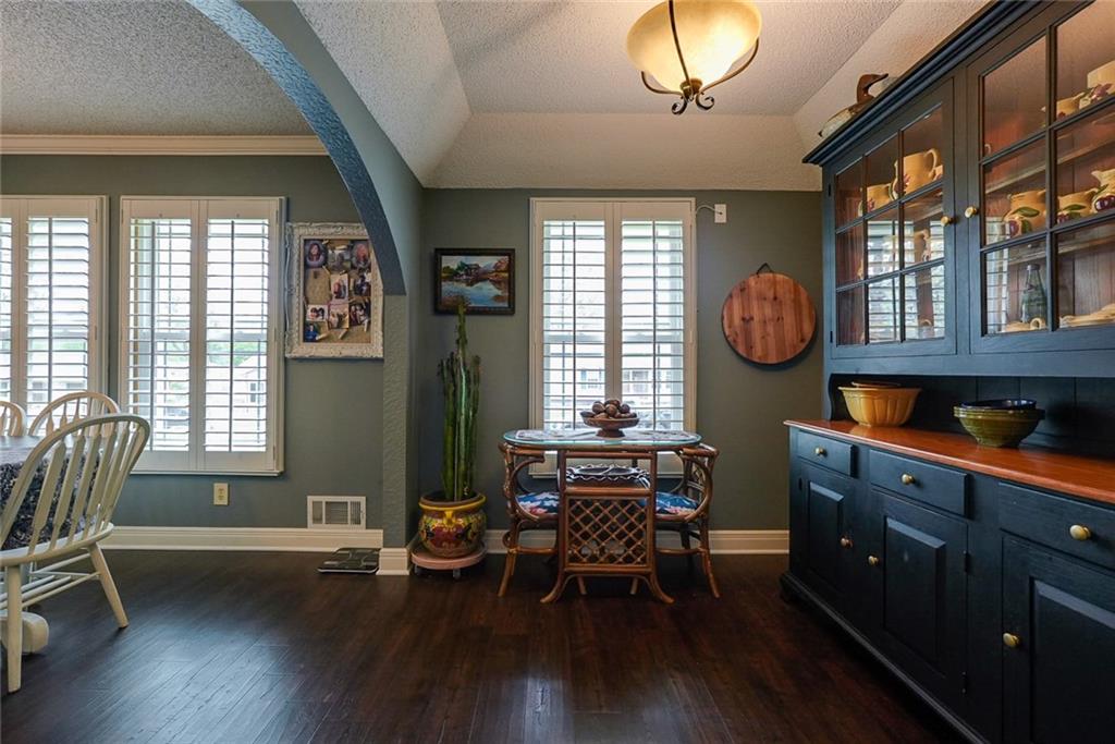 Dining area featuring a dark wood-finish floor, a large window with white plantation shutters, a dark wood built-in hutch with glass-front upper cabinets, a light fixture, and an arched doorway