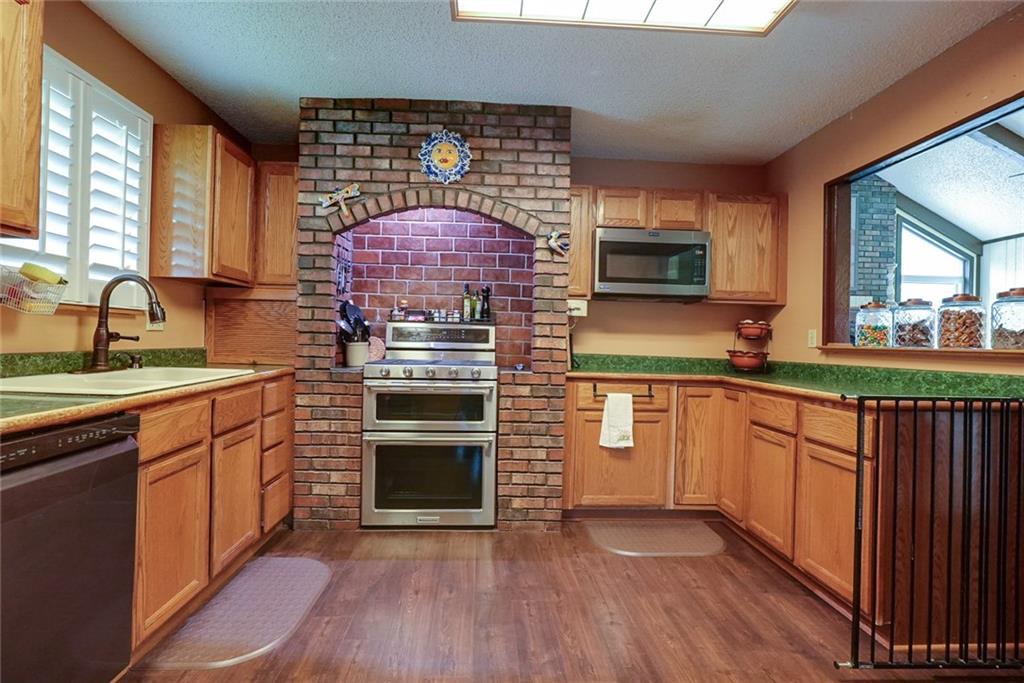 Kitchen featuring wood-finish flooring, natural wood cabinetry, and a brick-arch oven surround