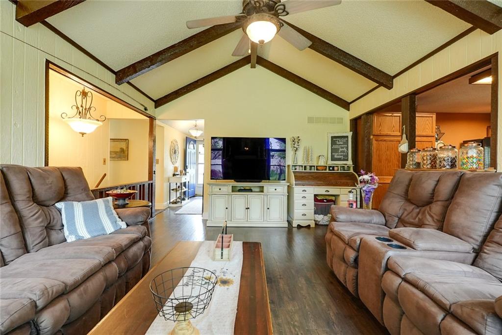 Vaulted ceiling with exposed beams, brick fireplace with wood mantel, dark wood-finish flooring, and natural light from multiple windows
