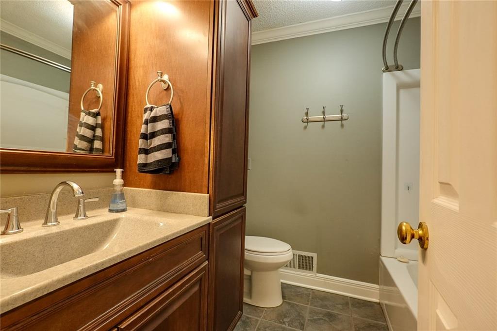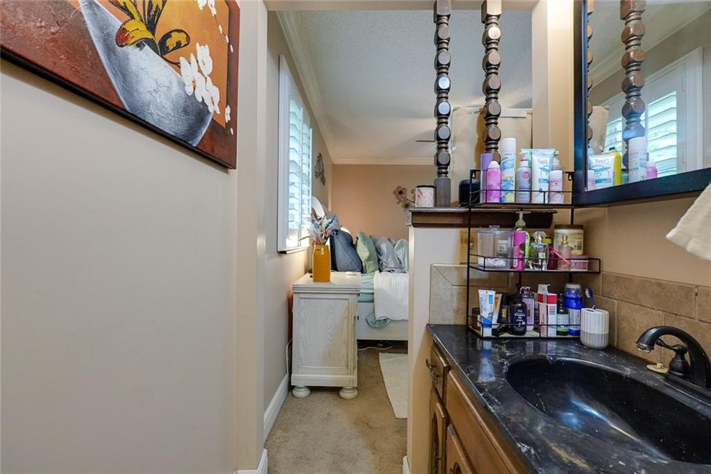 Bathroom featuring a wood-finish vanity with an integrated sink and light-toned countertop