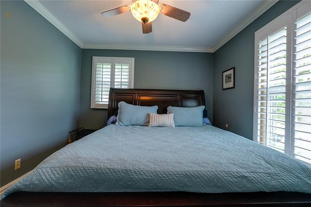 Bedroom featuring a dark wood bed frame, two windows with white plantation shutters, white crown molding, and a ceiling fan with integrated lighting