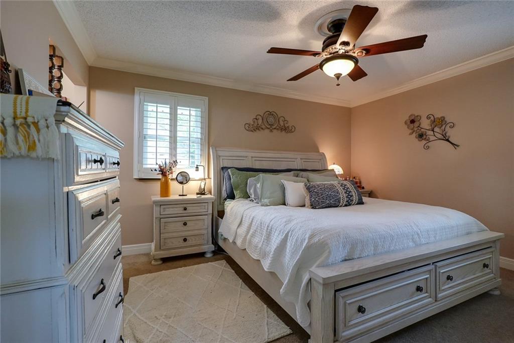 Bedroom featuring crown molding, a ceiling fan with integrated lighting, plantation shutters, and carpet flooring