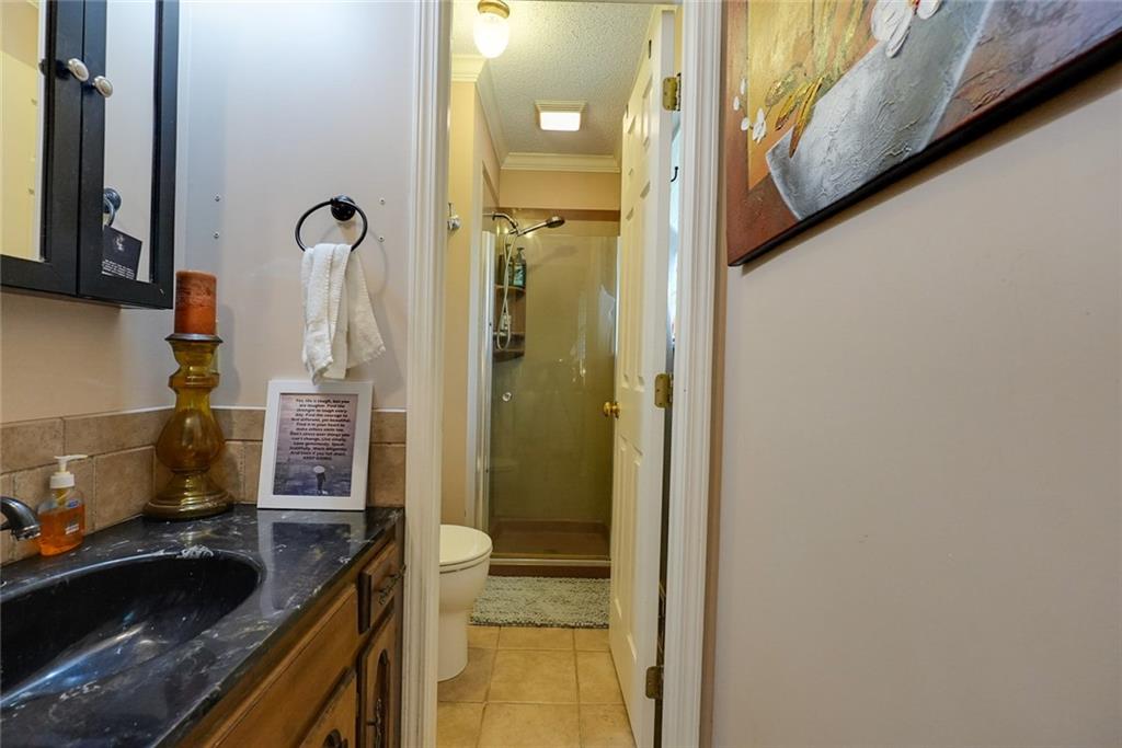 Bathroom featuring a dark countertop, wood-finish vanity, and tiled backsplash