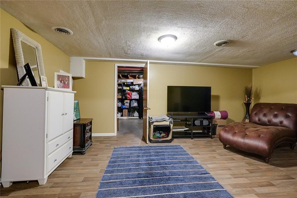 Finished lower level featuring wood-finish flooring, recessed lighting, and an exposed ceiling beam