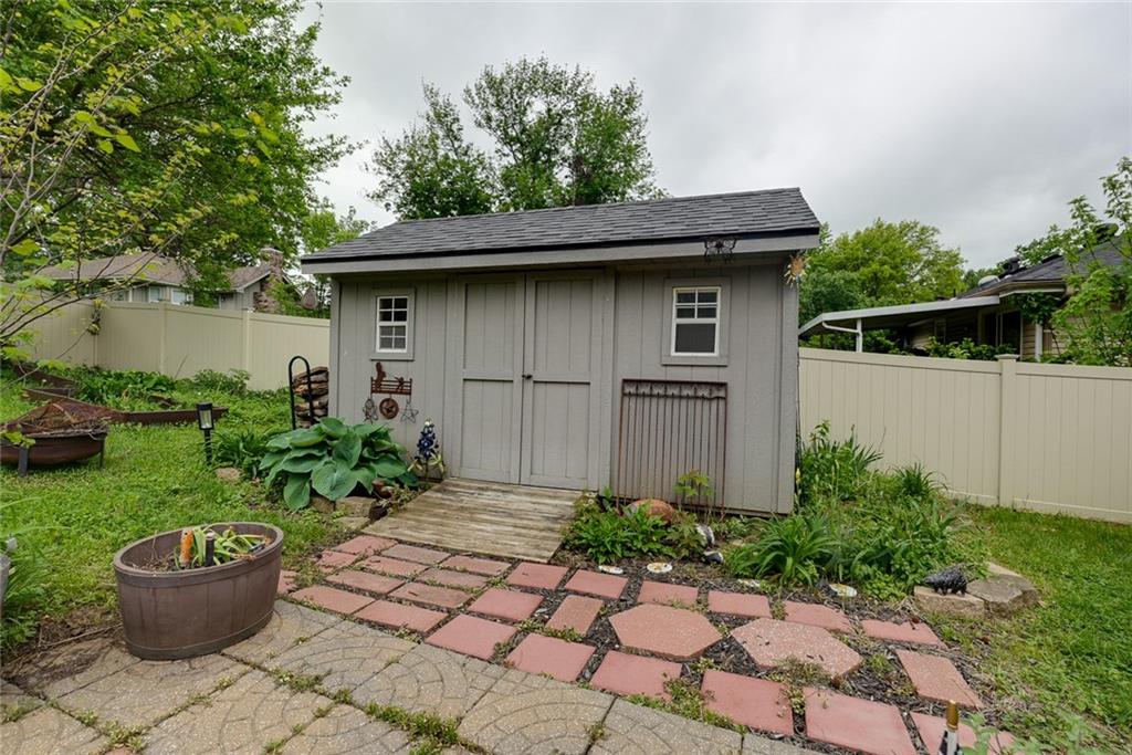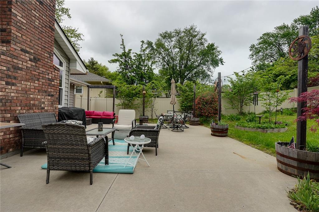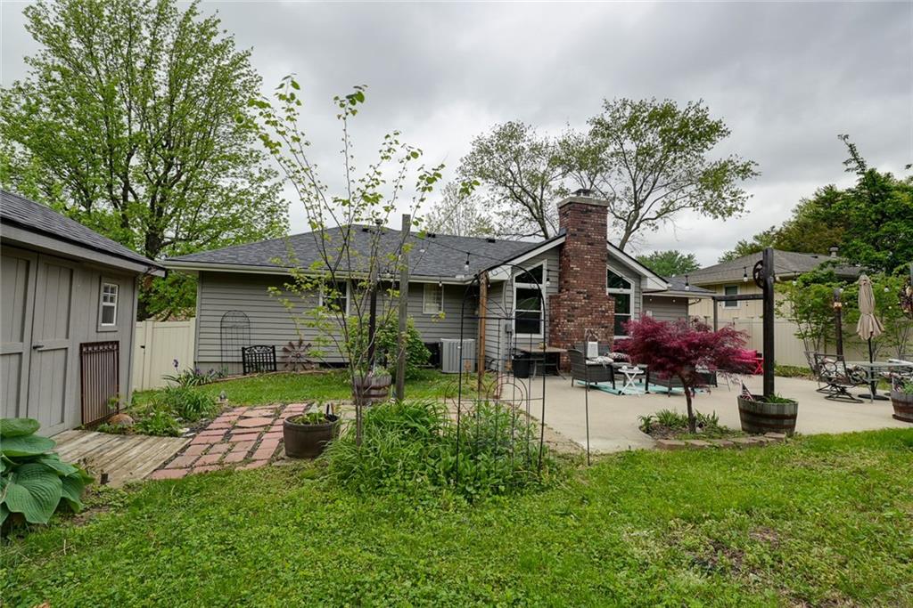 Spacious backyard with a large concrete patio, brick chimney, and a separate storage shed
