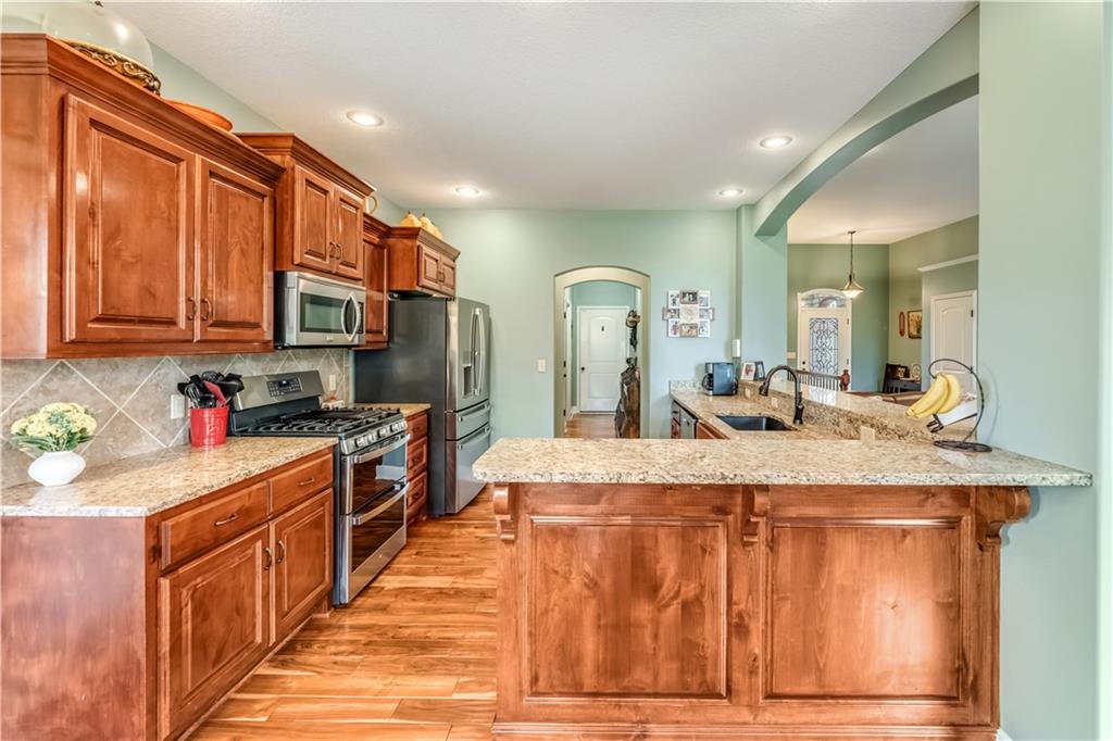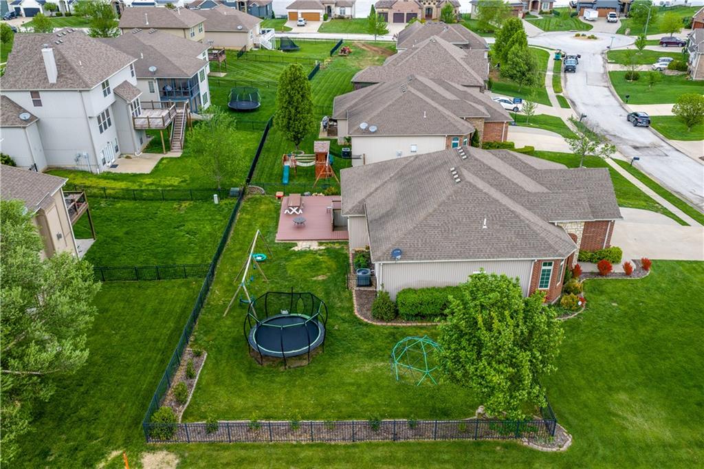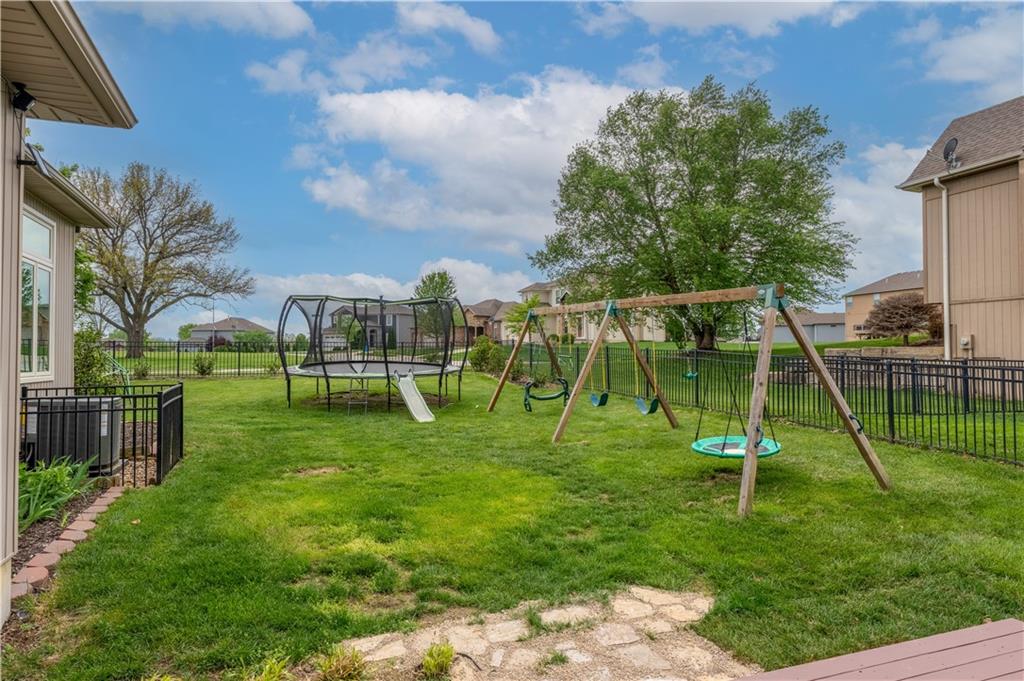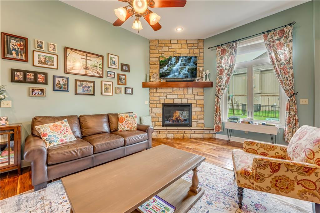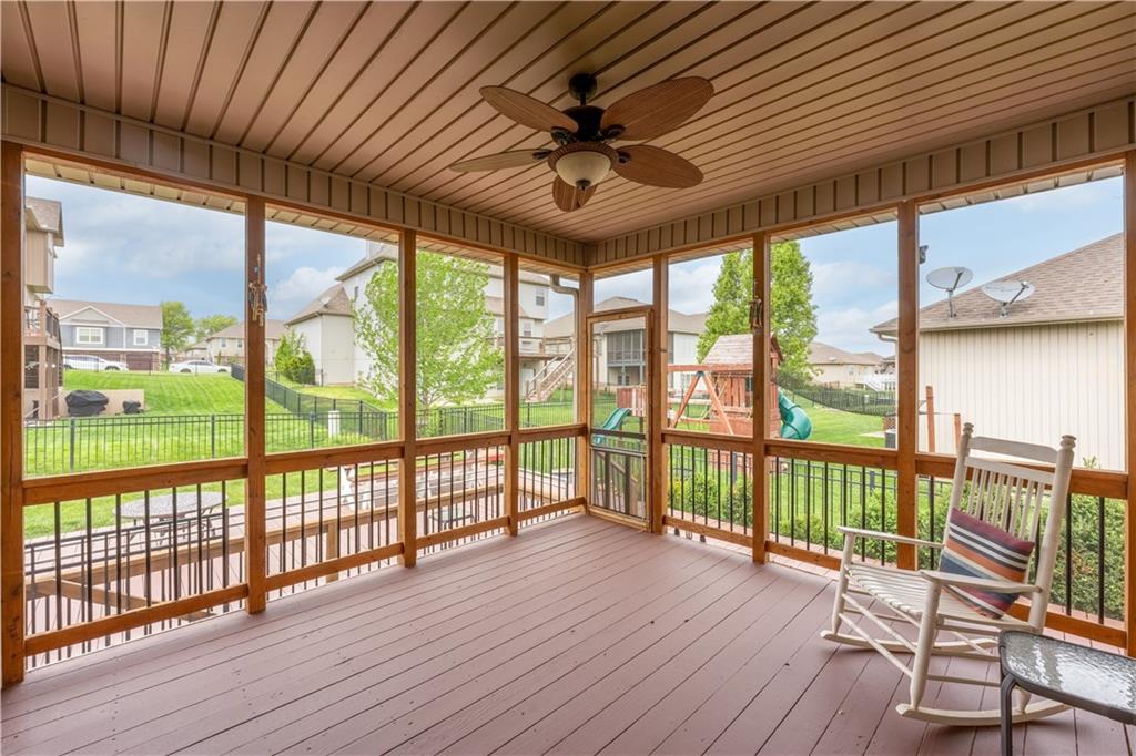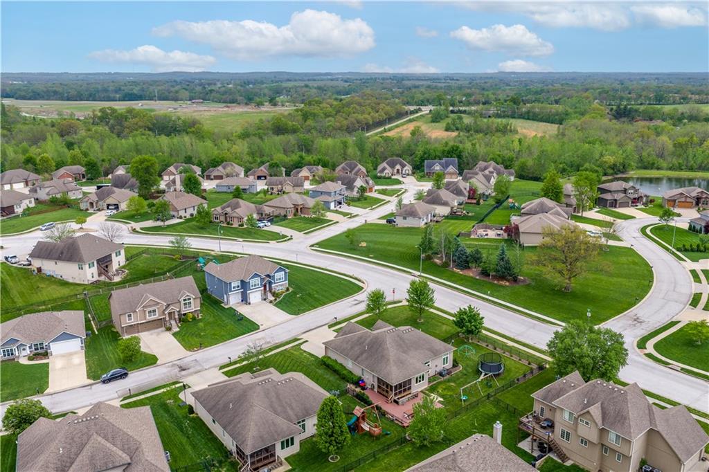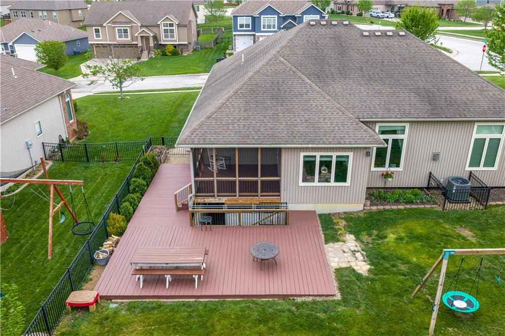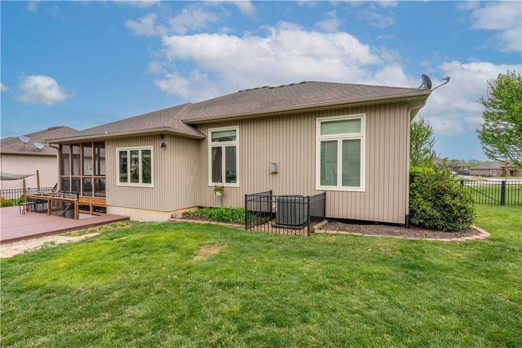 Your beautiful home is ready for you in the desirable Cayhill subdivision, known for holiday events, walkability, and commuting convenience to Whiteman AFB! This immaculate reverse ranch sits on a large corner lot with subdivision lake privileges, just minutes to shopping and restaurants in town. The welcoming front porch ushers you into warm hardwood hand-scraped floors and an open concept great room with tall ceilings. Enjoy the warmth of the gas fireplace with stone surround and still have connection to the Kitchen/Dining Room activities. Sellers have increased energy efficiency with window replacement in LR, DR, back secondary Bedroom, and hall Bathroom June 2025. Your large Kitchen has an abundance of custom wood cabinetry, granite counters, stainless steel appliances that all stay (Fridge, double oven, and dishwasher less than a year old!) and a dedicated pantry directly off the Kitchen. Main floor laundry is also nearby. The generous Primary Bedroom showcases a walk-in closet, newer carpet, and a beautifully updated on-suite Bathroom with new floor tile, newly tiled shower, new glass door, double vanity, and jetted tub. The two secondary Bedrooms have larger closets with storage systems and newer carpet with the hall Bathroom between. The lower level includes a full bar (drink fridge will stay) and service area off of the spacious Family Room, the 4th true Bedroom with a walk-in closet, another nonconforming room for many uses, and a 3rd full Bathroom. The 300 SF storage area includes a utility sink, storm shelter, NEW AC and furnace in 2025! Head out the patio door upstairs to the screened-in deck for relaxation without bugs! The basement patio leads up to the wide, newly stained back deck with a dedicated gas line for a firepit or grill. Play options abound with a swing-set and more in the fenced yard with in-ground sprinkler system. Come make new memories here!