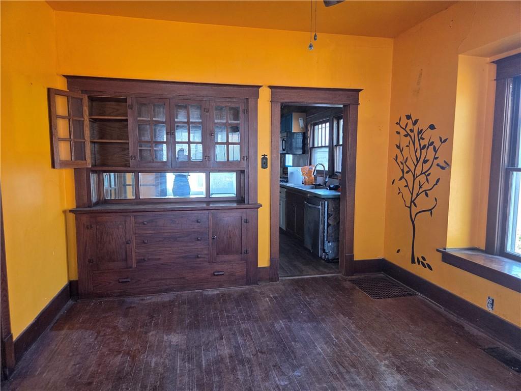 Room featuring wood-finish flooring, a two-pane window with dark wood trim and security bars, and a multi-pane glass-inset door