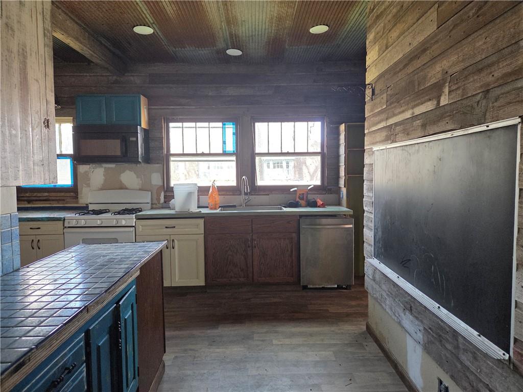 Kitchen space featuring wood-finish flooring, two large windows, a white gas range, and a stainless steel dishwasher