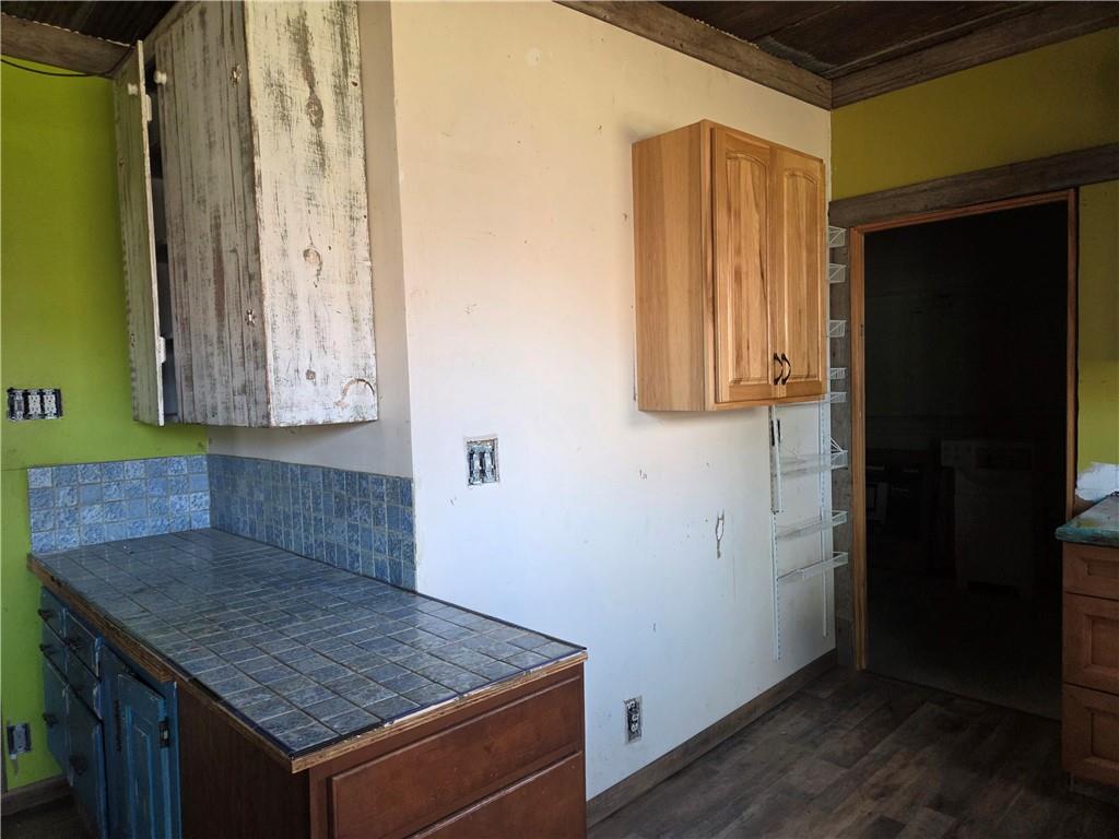 Kitchen area featuring tiled countertops, a blue tiled backsplash, and wood-finish flooring